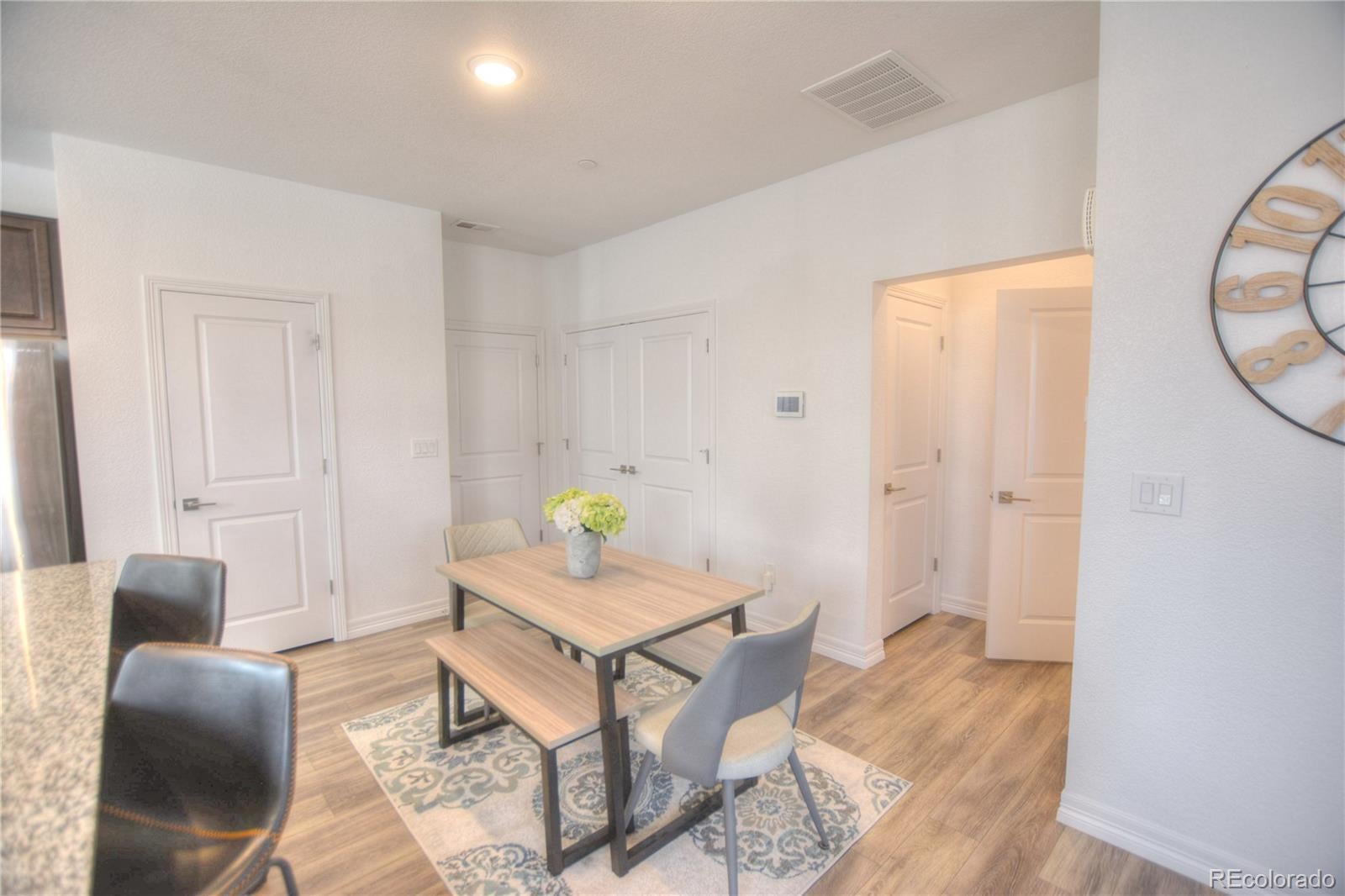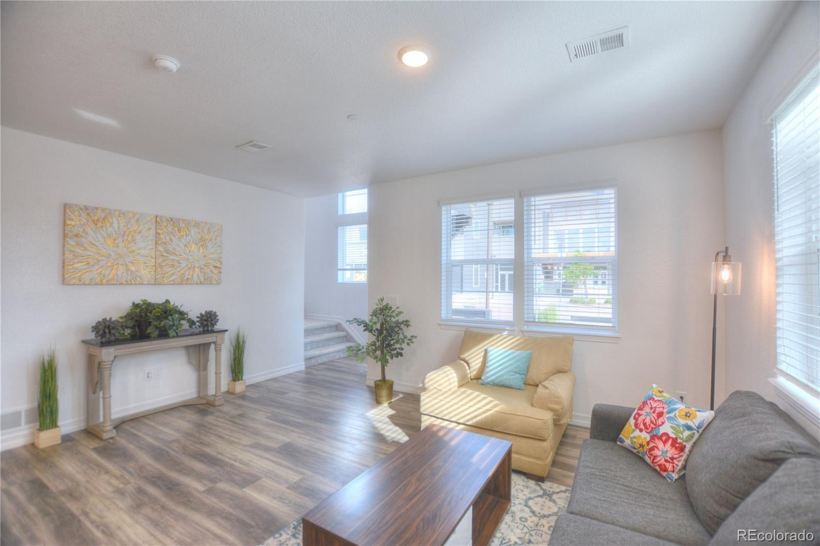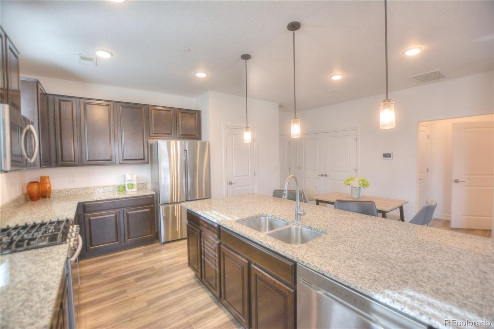 Welcome to your dream home in the heart of Victory Ridge, this very bright, end-unit townhome in Colorado Springs offers great location and modern amenities. When you walk in you're greeted by vaulting entry foyer, LVP flooring and a beautiful open concept Great room with bright, upgraded kitchen with stainless steel appliances including 5 burner gas range, granite countertops, and a large island perfect for entertaining. Head up stairs and you'll pass by the open loft area, with built in desk for a flex home office, the primary suite with an ensuite bathroom with dual sinks, walkin shower, and a generous walk-in closet. Two additional bedrooms share a full bathroom with dual sinks, also find the full size laundry room so laundry days are a breeze! A few more property highlights include a large 2 car extra wide garage, tankless hot water, AC, skybell doorbell, security system, smart thermostat, and lots of storage throughout the home. Step outside onto the fenced patio, offering the perfect spot to unwind and enjoy the fresh air. Got dogs? No problem! Take a few steps out the front door and there is plenty of community green space that is maintained by the HOA, No mower or yard tools needed. Location is great, you're right by Icon Cinema, within walking distance to some of the newest dining in Colorado Springs!! Additionally, being only minutes away from the prestigious US Air Force Academy, this community offers the perfect blend of convenience and serenity. With easy access to I-25 and Powers Blvd.