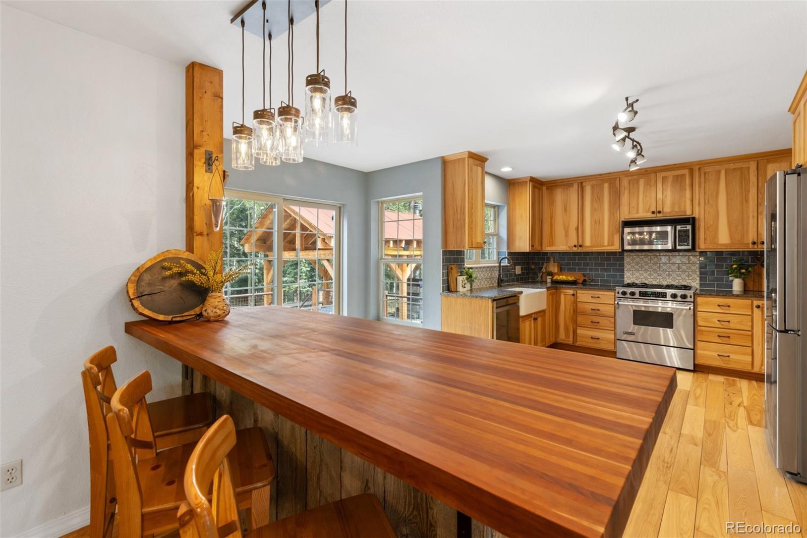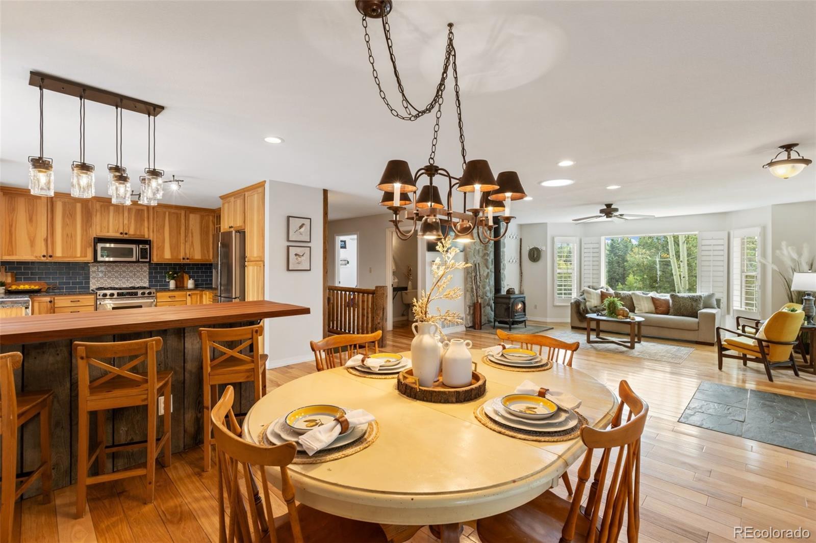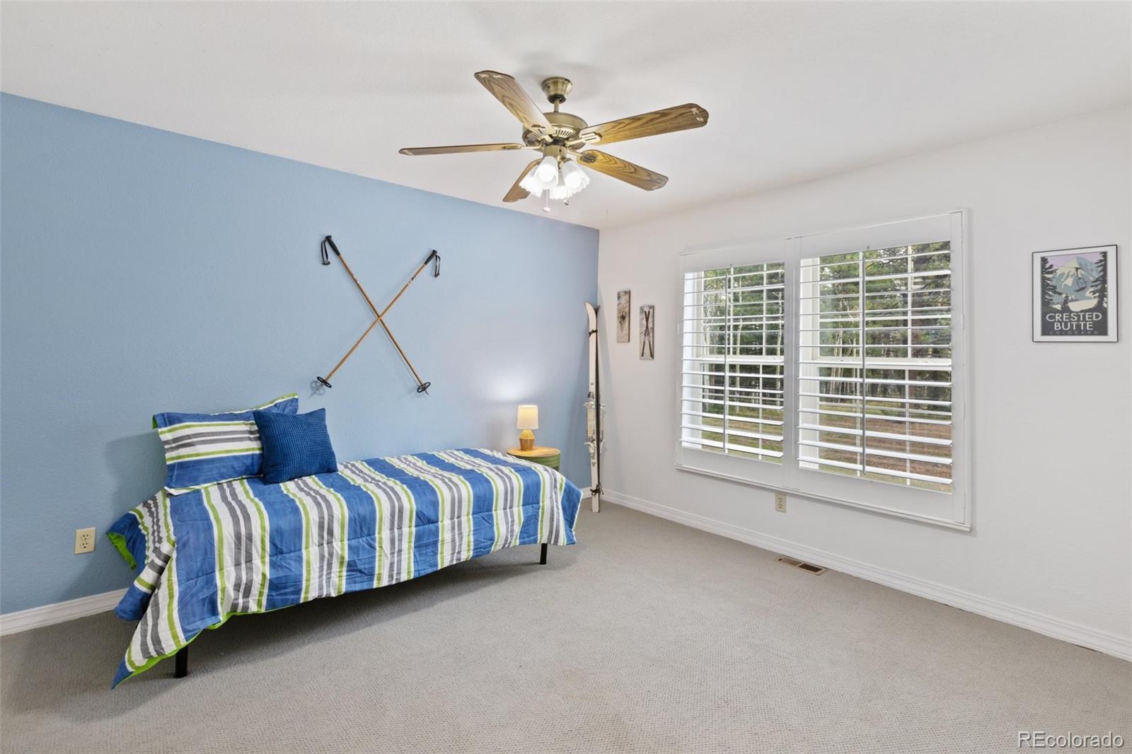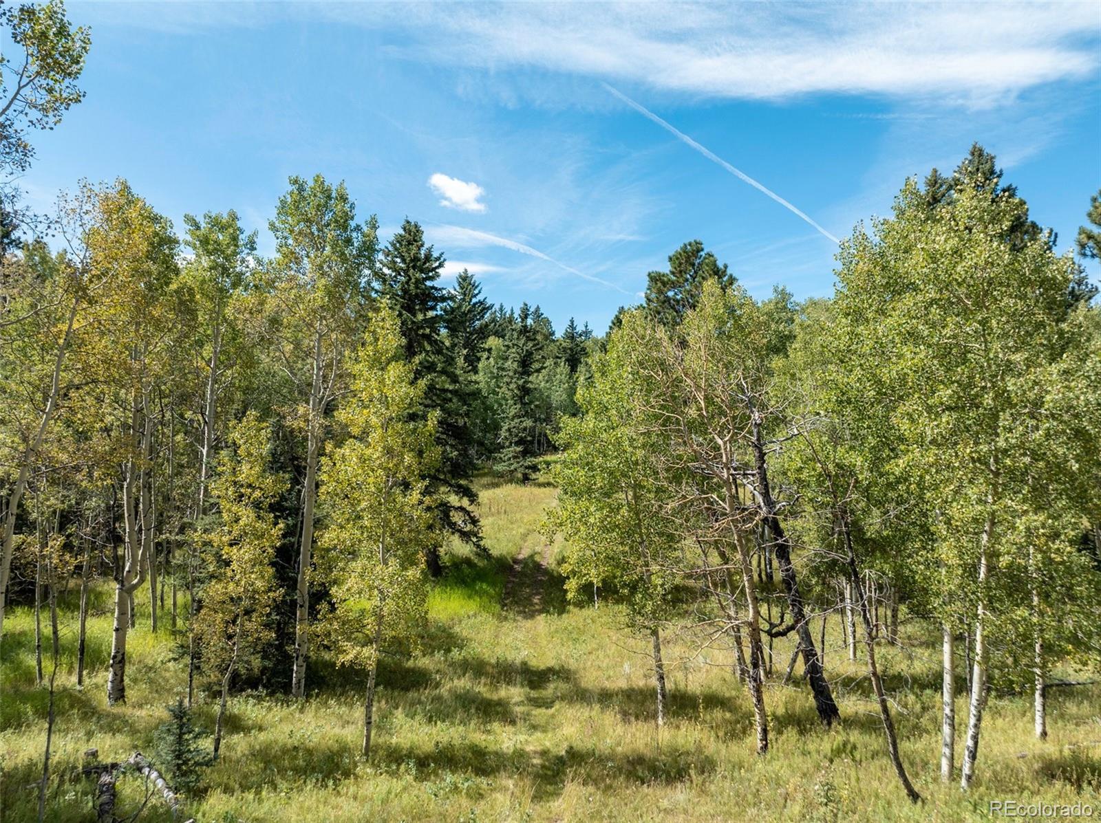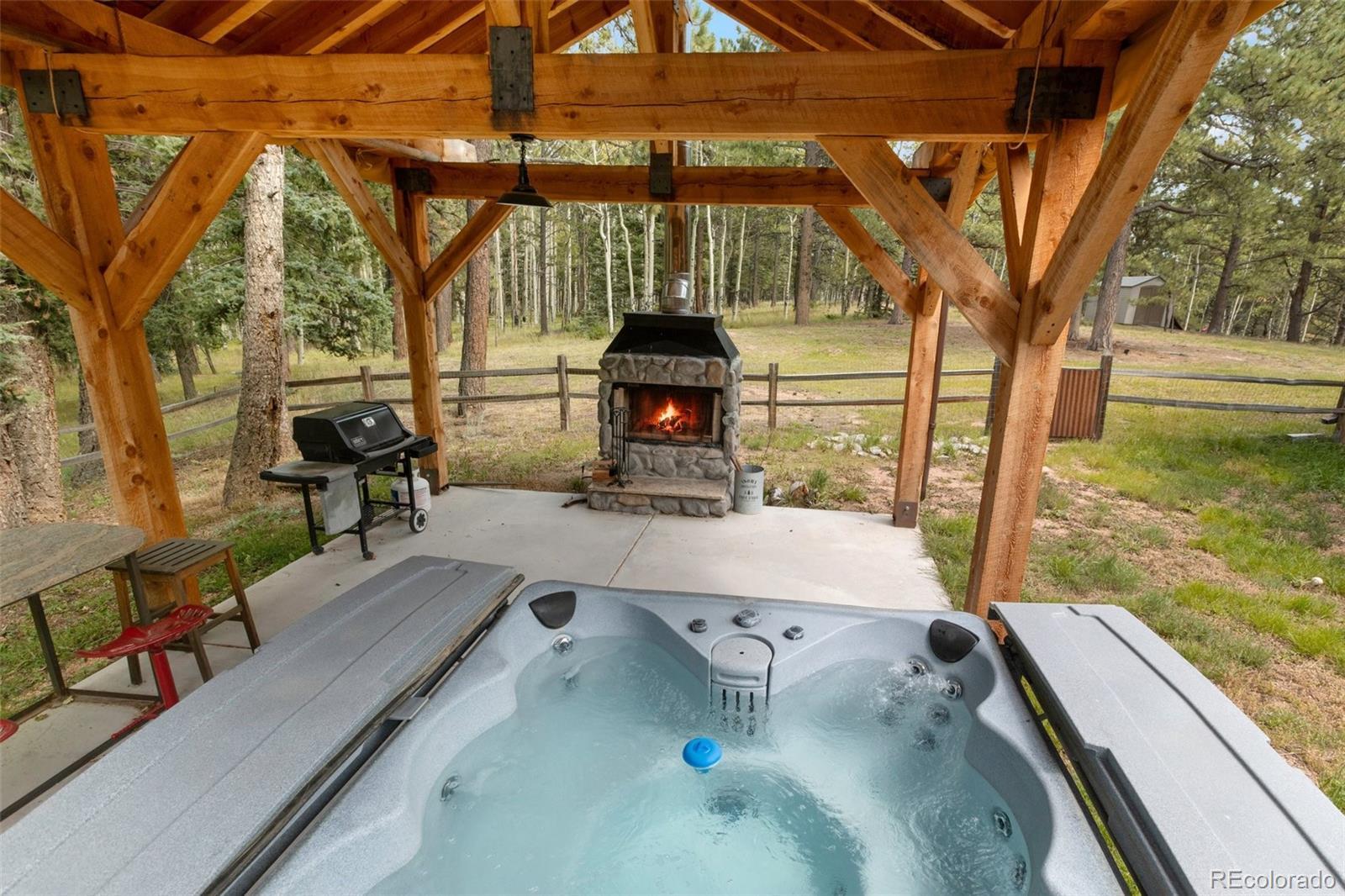 Private 8.5 acre mountain preserve on an idyllic setting of aspen trees, views of Pikes Peak, usable acreage with a blacktop driveway! Rustic mountain home completely remodeled including covered front deck, with new features including: Hickory hardwood flooring on the main level; custom plantation blinds throughout; new Hickory cabinetry and granite countertops + butcher block island, farm sink and new stainless steel appliances. Living area features a Jotul wood-burning stove, views overlooking Pikes Peak to the Southeast; main level laundry along w/ a Butler pantry; dog shower and a large doggie door; Main level owners suite also includes Hickory flooring, adjacent the remodeled primary bathroom with double vanity, jetted tub, a walk-in steam shower with dual shower heads, + a walk-in closet. 3 additional main level bedrooms w/ newer carpeting, in addition to a remodeled full bath. The lower level includes 9 ft. ceilings, a comfortable family room includes a corner gas fireplace, an adjacent office space, in addition to a non-conforming bedroom. Wonderful unfinished storage area/exercise room also equipped with a “safe” room or possible wine cellar. There is an expansive back yard deck, great for entertaining, and freshly stained; additionally, a custom-built pavilion on a concrete pad w/ a freestanding fireplace and 6 person hot tub. Fenced in yard for pets too! Mechanical updates include a new furnace in 2023, all natural gas appliances. Wander the trail system on the property to find an insulated treehouse and riding track for the kids! Parcel has no covenants or HOA, and includes an excellent 4 gpm well!