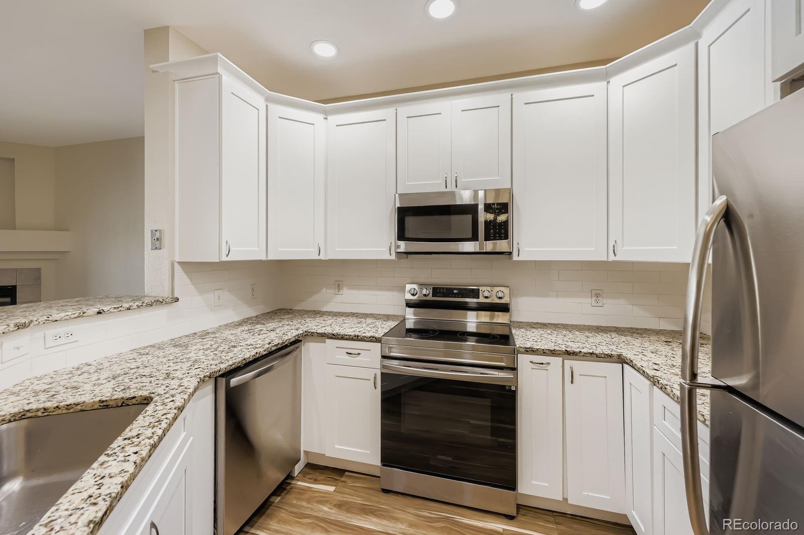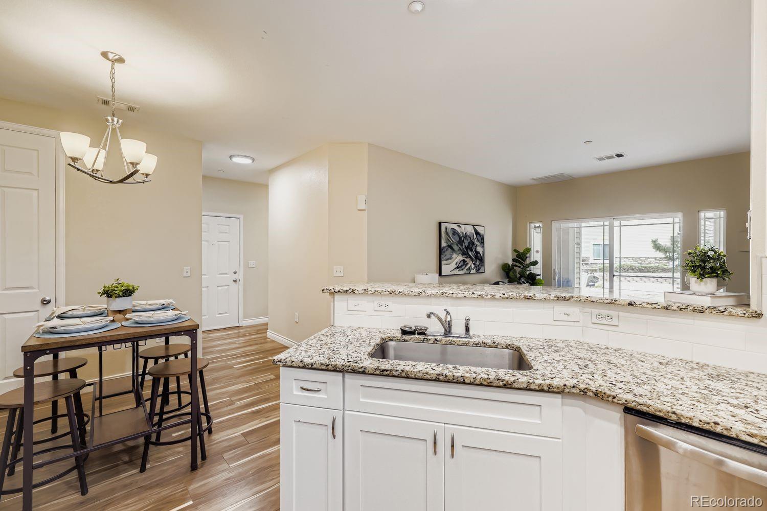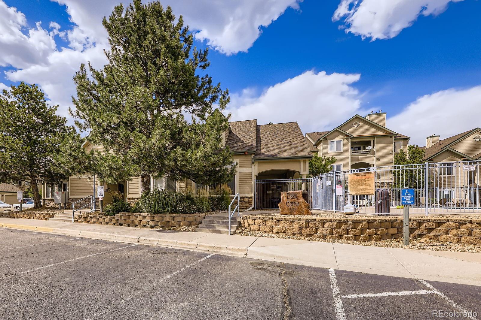 Recently remodeled 2 bed 2 bath main floor condo in Deer Creek. No steps, easy access. LVT flooring throughout, newer base trim, remodeled master bath with new tub, tile undermount sinks with new faucets and granite counters. New low flush toilets in both baths. Kitchen features newer cabinets with granite counters, SS sink and newer appliances. Washer dryer included. Newer light fixtures, can lights in kitchen. Patio off living area. Close to shopping, restaurants and C-470.