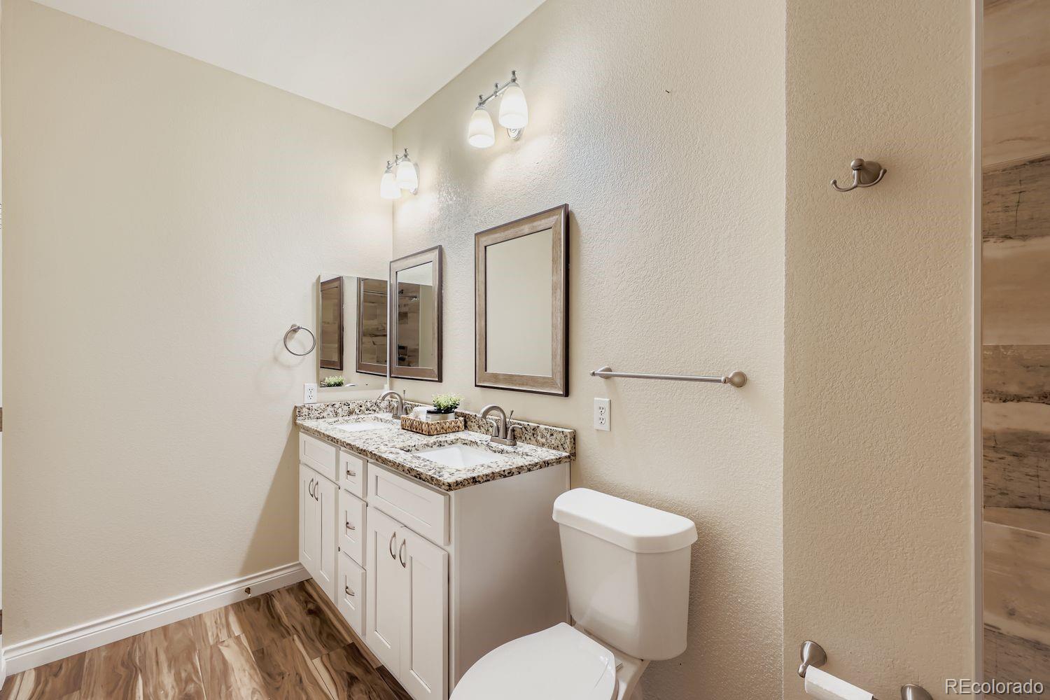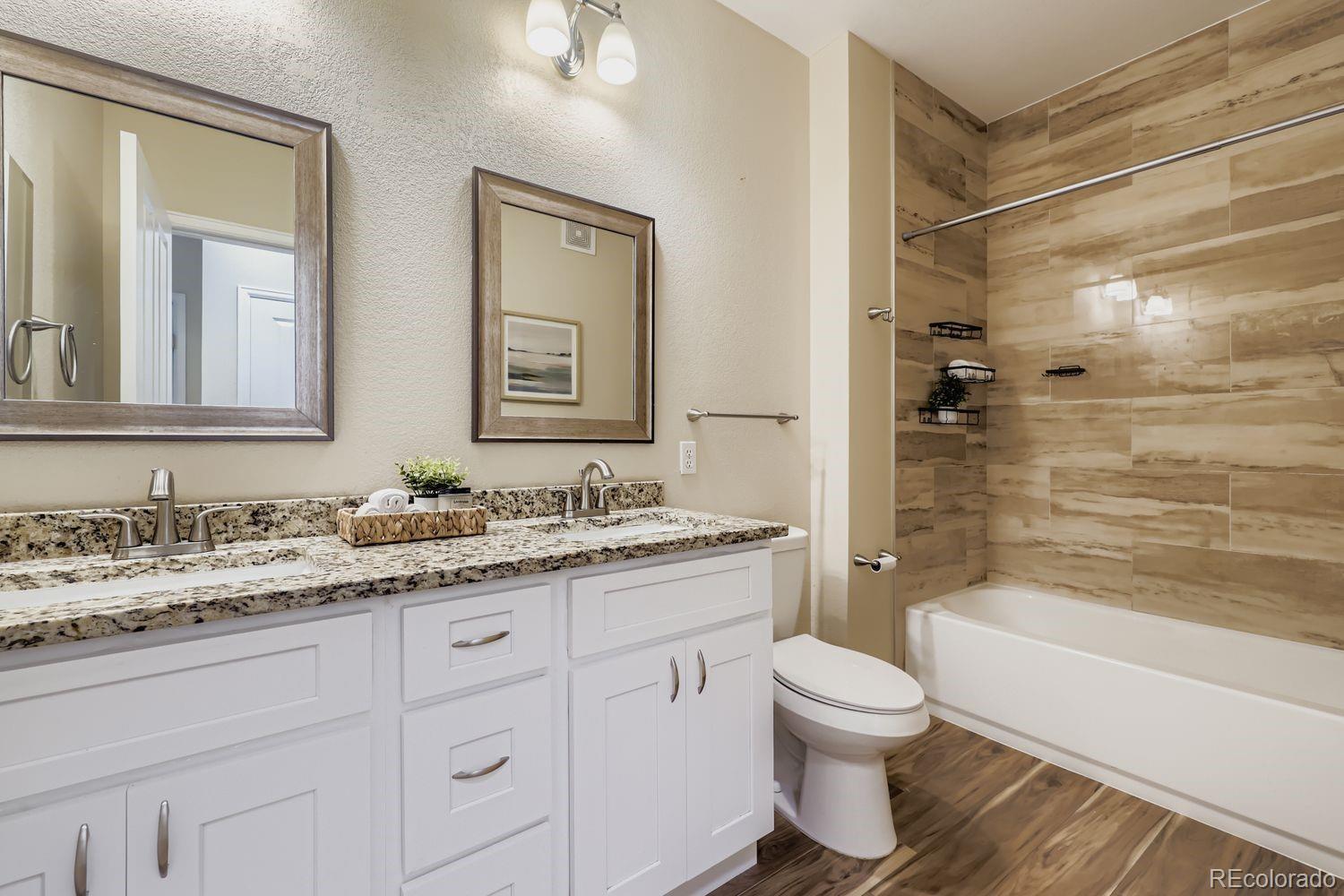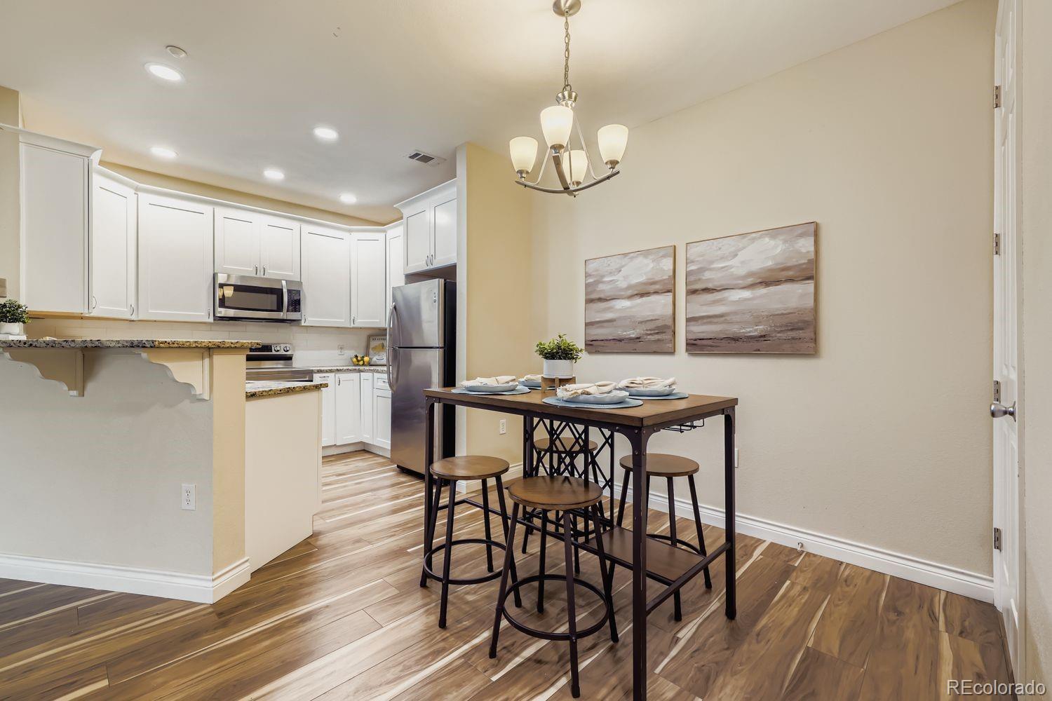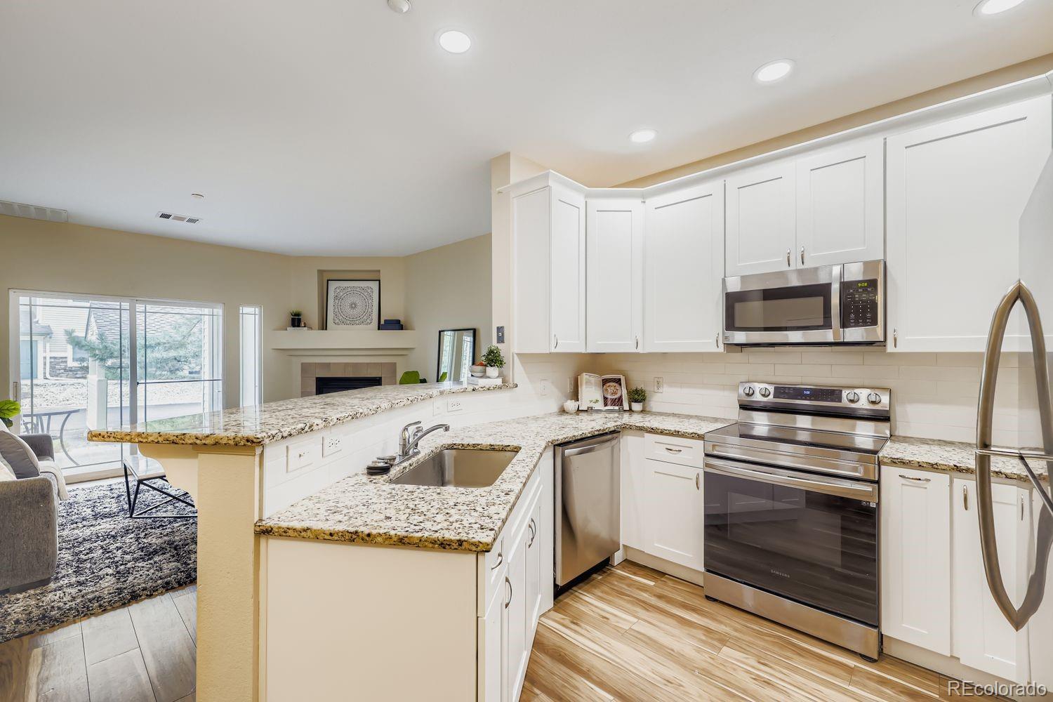 Recently remodeled 2 bed 2 bath main floor condo in Deer Creek. No steps, easy access. LVT flooring throughout, newer base trim, remodeled master bath with new tub, tile undermount sinks with new faucets and granite counters. New low flush toilets in both baths. Kitchen features newer cabinets with granite counters, SS sink and newer appliances. Washer dryer included. Newer light fixtures, can lights in kitchen. Patio off living area. Close to shopping, restaurants and C-470.