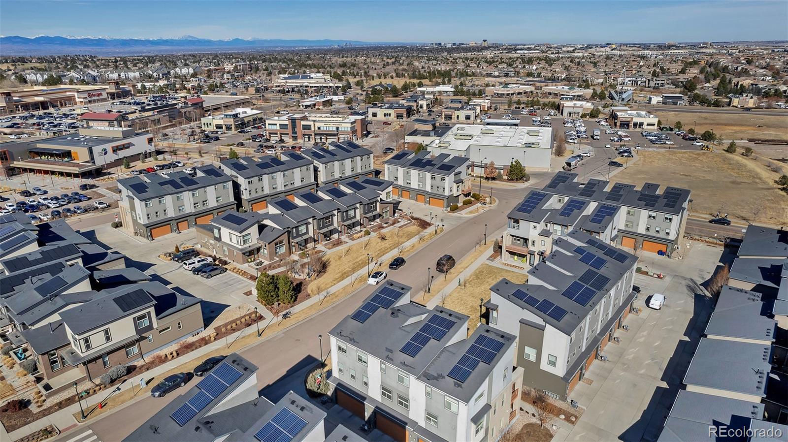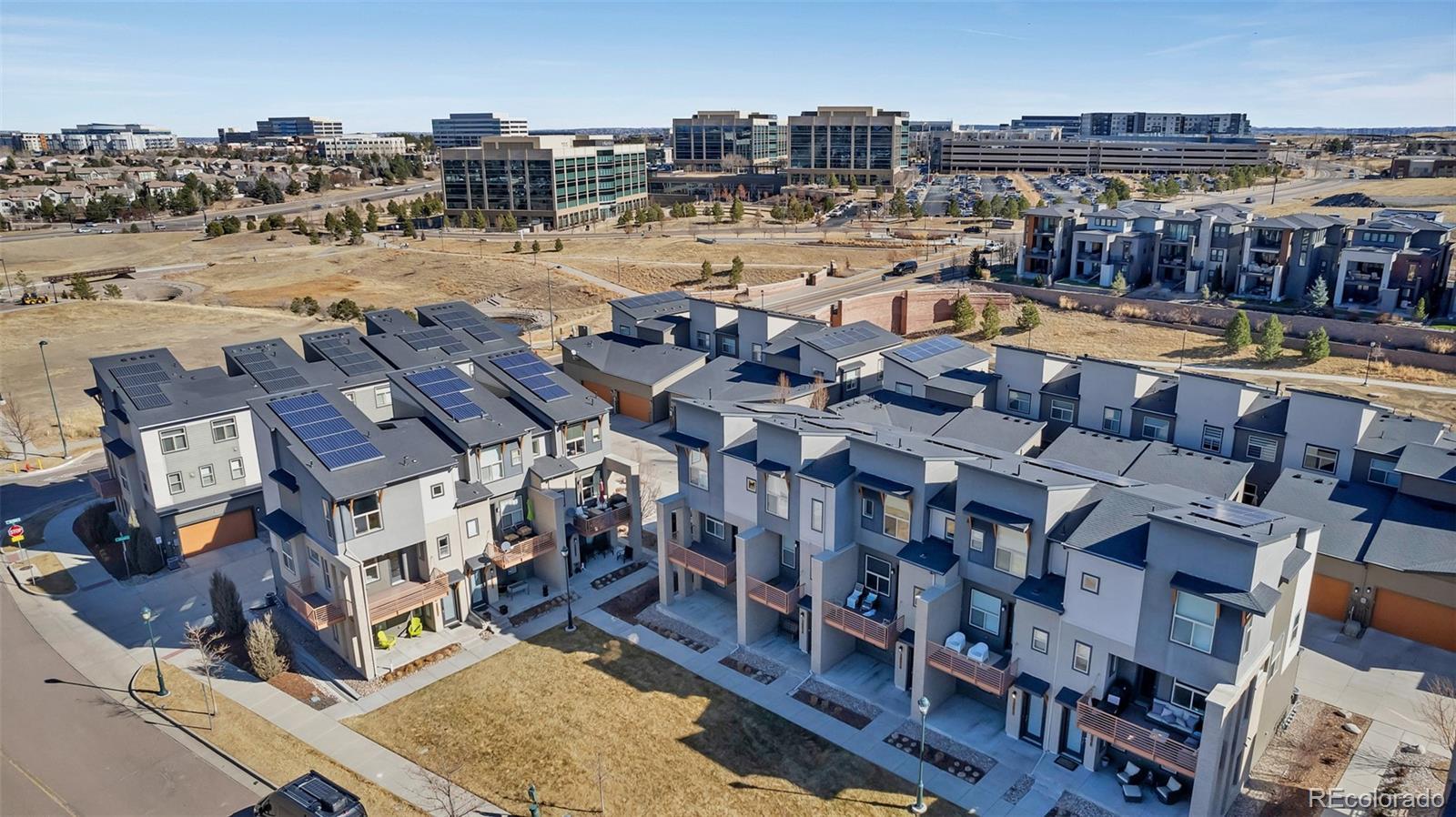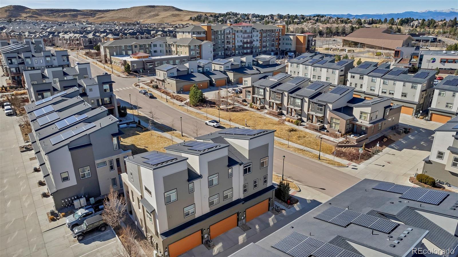 The most perfectly located home, with beautiful views of the area's bluffs overlooking the grassy park, facing South and with South and West views. Direct access to local parks, miles of walking trails, a short walk to grocery, retail, and popular restaurants. Just one bock to the library and a few blocks to the Lone Tree Recreation Center! Your new home has an open flowing floor plan featuring a chef's kitchen complete with white cabinetry, newer subway tile backsplash, beautiful stainless steel appliances, granite counters, and an island for even more prep space. The living room is truly the showcase with large windows framing the bluffs in the distance, overlooking the park, and plenty of space to hang out. It is wired for sound. This room has access to the wrap around deck where you can sit back, relax, and enjoy the fresh air and sunshine. The primary is on the upper level with views of the bluffs, natural light, a walk in closet with built ins and is paired with a 3/4 bath that features a tiled shower, dual sinks, private water closet and built in storage. The 2nd bedroom is located in the NW corner, has plenty of natural light, and spacious closet. The loft is truly a highlight feature with windows allowing natural light and creating a flexible space for work, relaxation, or play! This beautiful modern home creates opportunity for ease, convenience, and enjoyment of the perfect location. Notable features: All hard floors, no basement, wired for sound, wired for data, Home builder has prepaid for initial term of solar lease (till 2036!!) will transfer to buyer at closing. This home is Energy Star rated and EPA indoor airplus qualified!