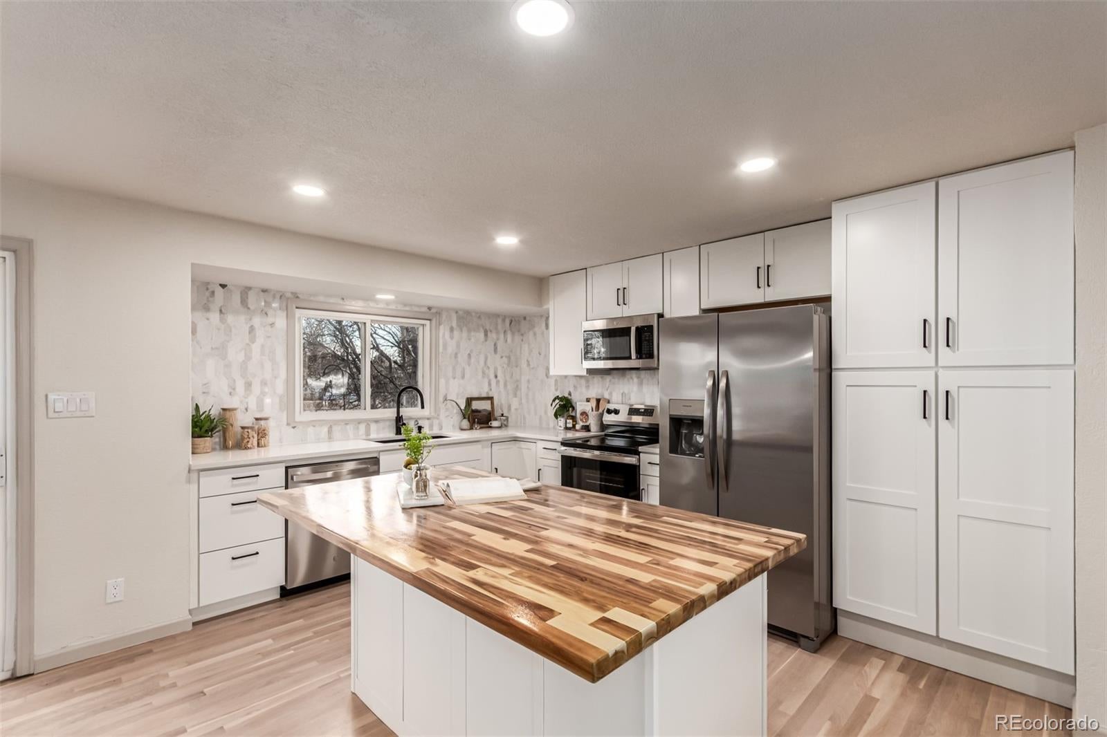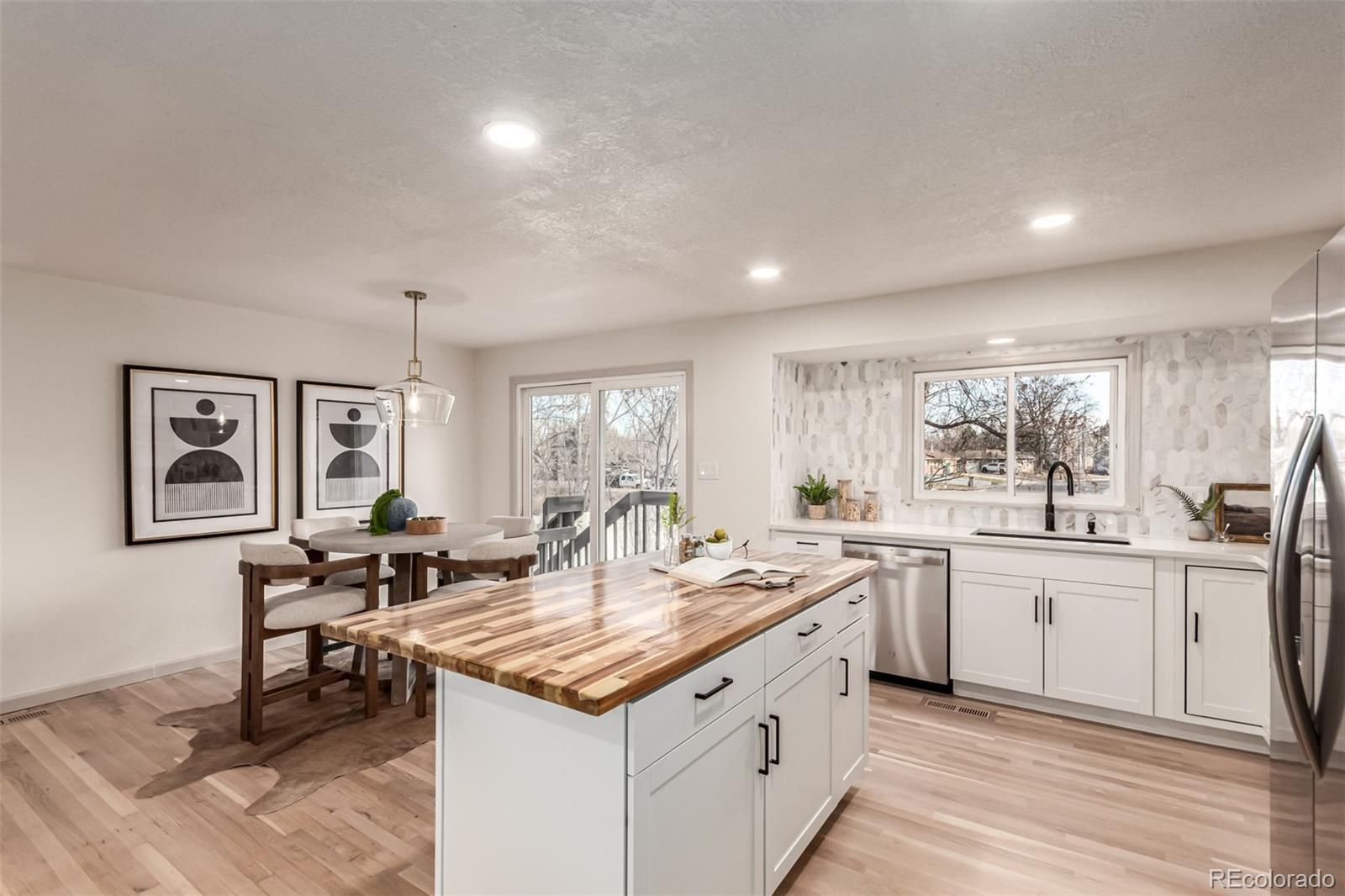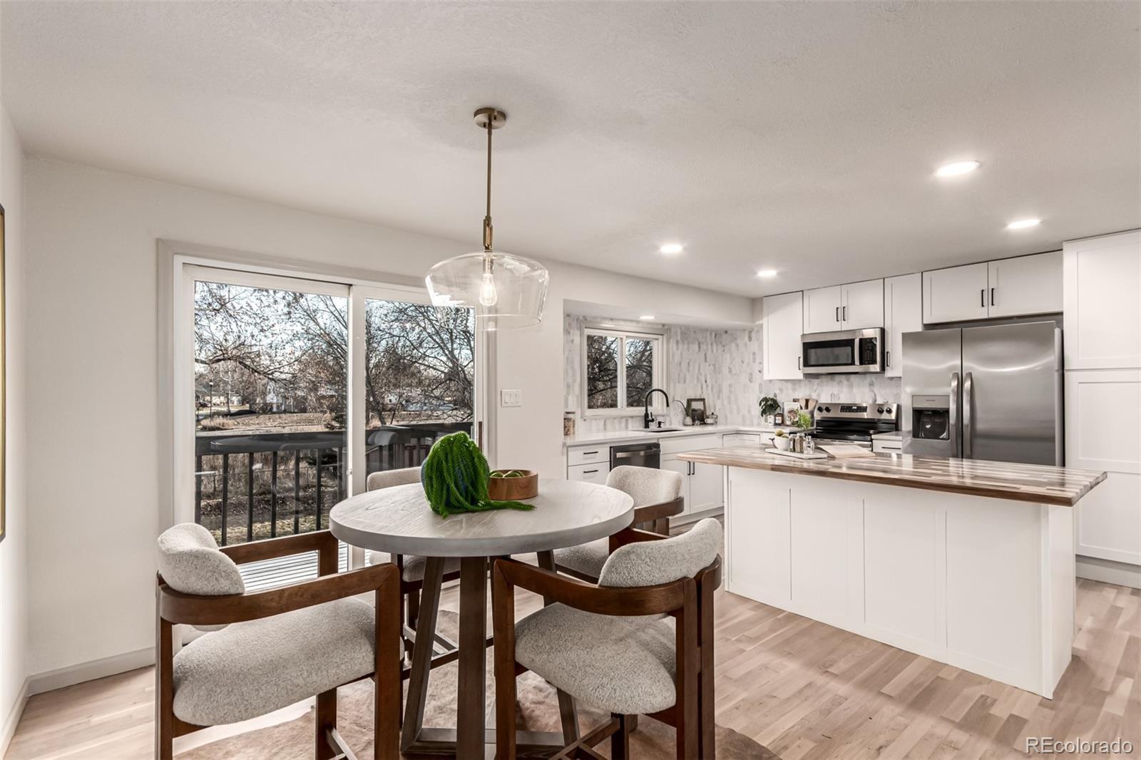 Welcome to 1135 Lefthand Drive, a beautifully updated 4-bed, 2-bath, bi-level home in an idyllic Longmont location. This home backs to Lefthand Creek and the LoBo Trail system and is just steps from Kannemoto Park. The superb lot offers the perfect blend of privacy, convenience, and natural beauty. The open concept upper level features a fully remodeled kitchen designed to be the heart of the home. It showcases brand new appliances, a stunning backsplash, quartz countertops, a central butcher block island, and ample cabinets and pantry space. Adjacent to the kitchen is a dining area and a living area which includes a statement wall for the TV. There’s plenty of space for cooking, gathering, and entertaining. Down the hall, you’ll find two bedrooms and a full bath that doubles as an en suite to the primary bedroom. Large windows fill this home, making it light and bright while the newly refinished hardwood floors create a warm and inviting feel throughout the upper level. The lower level offers more options for space and relaxation. It includes two additional bedrooms, a beautifully updated ¾ bath, and a spacious family room perfect for entertaining, movie nights, a home office or workout space. This lower level has a warm, comfortable vibe, enhanced by brand-new carpet throughout. In addition to being beautifully updated, most major home systems have been replaced. Enjoy peace of mind with brand-new AC, a brand-new water heater, a brand-new roof, a brand-new overhead garage door, and a newer furnace. Not only is this home move-in ready, it’s worry-free. With Lefthand Creek flowing just behind the property, this home is the ultimate backdrop for morning coffee, evening unwinding, or weekend gatherings. Don’t miss this one-of-a-kind gem in the heart of southwest Longmont!