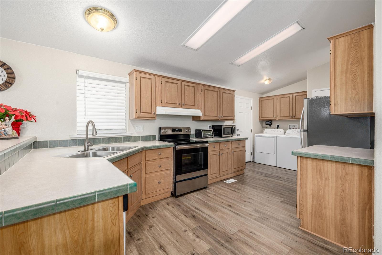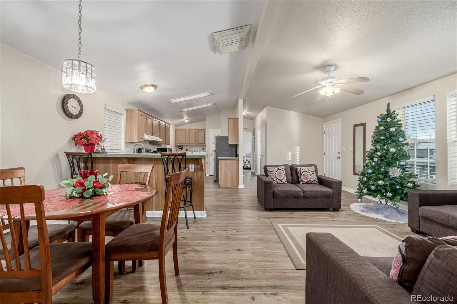 Welcome to this beautifully 3-bedroom, 2-bath home located in Holiday Hills Village! This inviting residence offers a spacious, open layout with vaulted ceilings, abundant natural light, and thoughtful design throughout. The main living area feels warm and welcoming, featuring vinyl flooring, ceiling fans, and plenty of space for both relaxing and entertaining. The large kitchen is a standout, offering generous counter space, ample cabinetry, eat-in space at the bar top and room for multiple cooks. Appliances are conveniently arranged, and the layout provides excellent storage and functionality. Adjacent to the kitchen is a dedicated laundry area with added overhead cabinets for additional storage. The primary suite is spacious and private, featuring plush carpeting, a walk-in closet, and an en-suite bathroom with dual-sink vanity, abundant counter space, and a full shower. Two additional bedrooms are well-sized and versatile—ideal for a home office, or hobby space—and are located near the second full bathroom. Outside, the home offers a low-maintenance exterior, private parking, and storage options, making day-to-day living simple and efficient. Bonus! There is a shed for extra storage. The community provides a peaceful setting while remaining conveniently located near shopping, dining, parks, and major commuter routes.