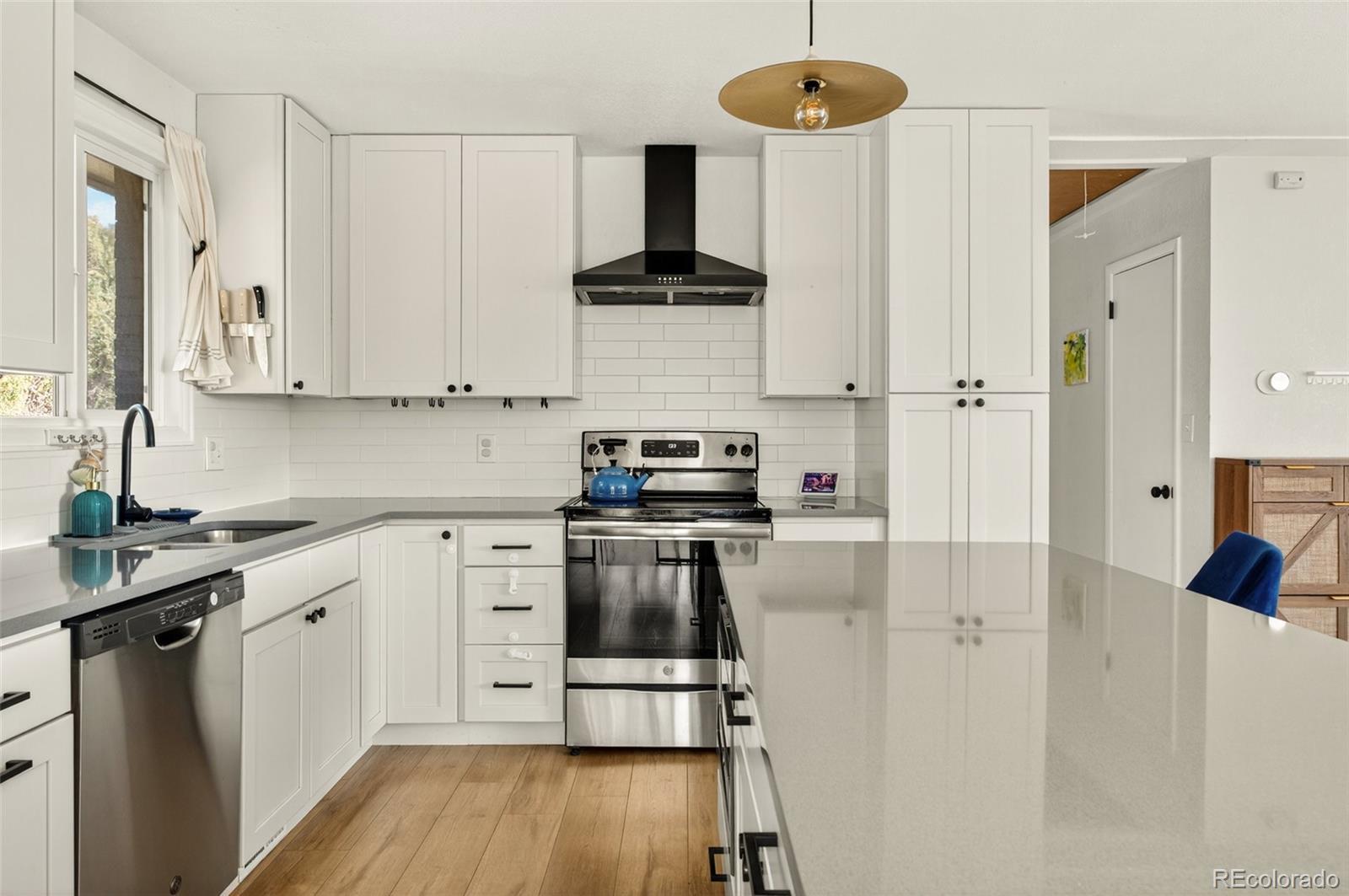 Welcome to 8557 W 68th Avenue! This fully upgraded home is nestled in one of Arvada’s most established and sought-after neighborhoods: Scenic Heights. Featuring 4 bedrooms and 3 bathrooms, this stunning property sits on a spacious, landscaped lot with sweeping southern views. The open and functional main floor includes an updated kitchen with shaker cabinetry, quartz countertops, and stainless steel appliances. It flows seamlessly into the dining and living areas, where you can entertain guests or get cozy around the wood-burning fireplace. Down the hall, you’ll find two bedrooms and a large, fully updated bathroom showcasing designer tile, new fixtures, and a modern vanity. Retreat to the primary suite, perfectly sized for a king bed and complete with a walk-in closet, scenic views, and a stylish en suite bathroom. The lower level offers a spacious multipurpose room, perfect for a family room, home theater, or play area. An additional guest bedroom and updated bathroom are ideal for visitors or extended family. Recent updates include a newer roof, furnace, water heater, windows, and flooring. Don’t miss this move-in-ready gem and the opportunity to own a beautifully updated home in one of Arvada’s most desirable communities!