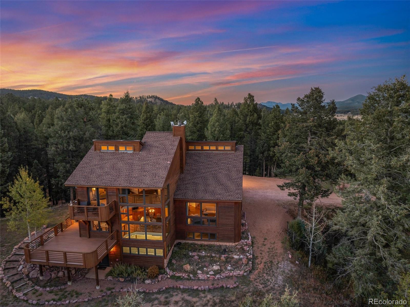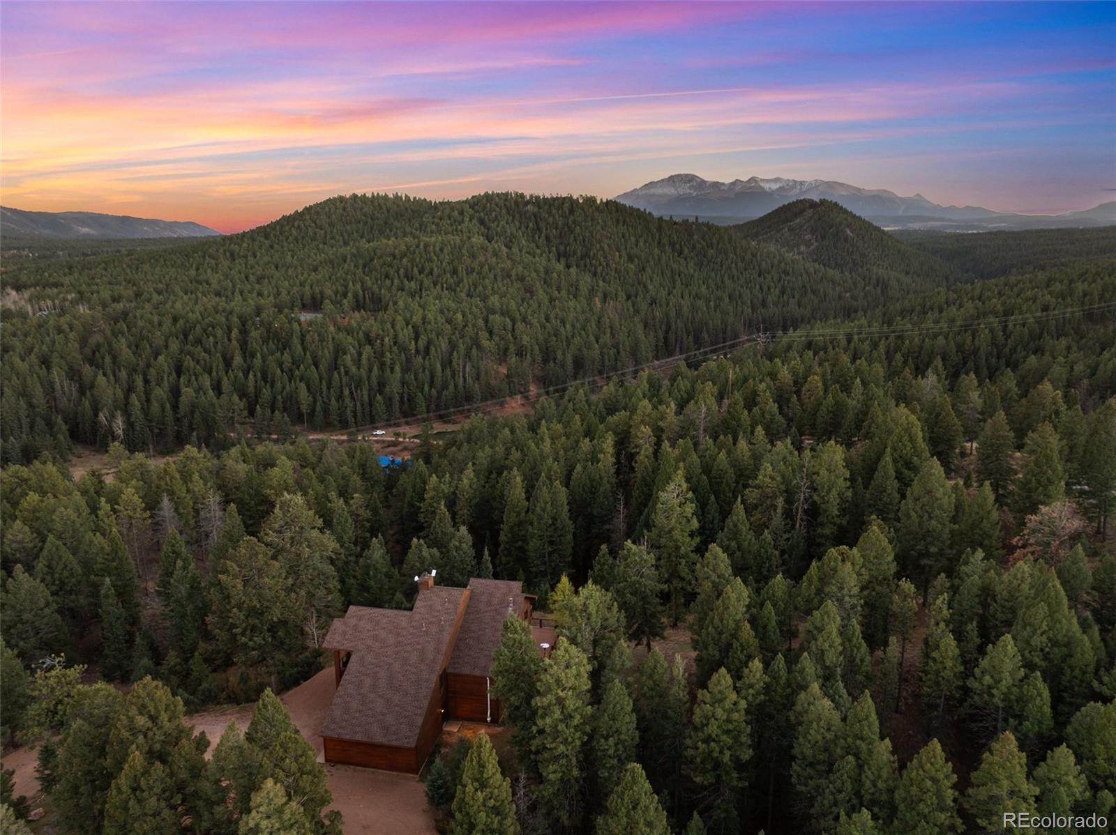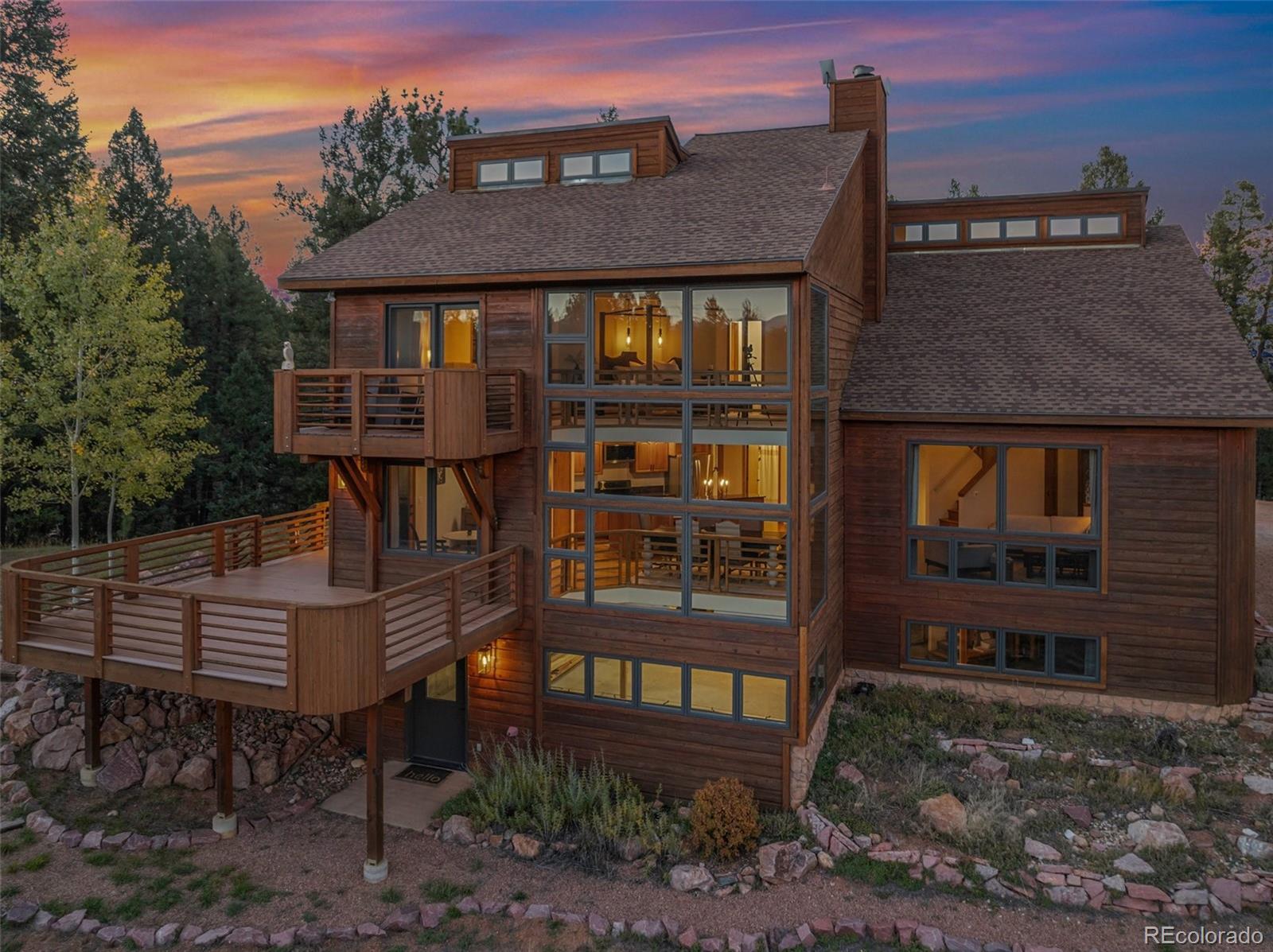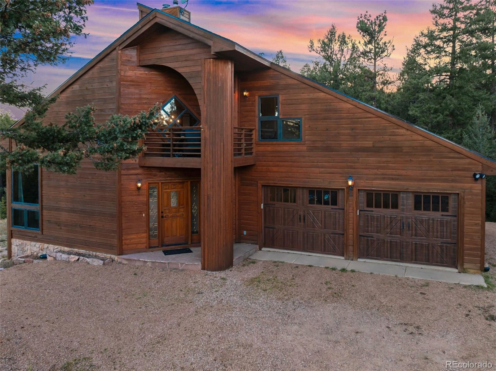 Beautifully updated custom home on 5 private acres in desirable Flying Cloud Estates with sweeping views of Pikes Peak. The inviting contemporary mountain design features open-beam vaulted ceilings, oak flooring, granite counters, hickory cabinets, and expansive windows to showcase the surrounding scenery. Recent upgrades include full interior paint, fresh exterior stain, new electrical switches/outlets, updated plumbing and lighting fixtures, and a new water softener. Thoughtfully offered fully furnished with high-end designer pieces and curated local artwork, this home is move-in ready. The main level offers an open kitchen with island and pantry, adjoining dining areas, and a spacious living room anchored by a striking floor-to-ceiling three-sided quartz fireplace. A main-level secondary suite with adjoining bath provides flexibility for guests. Upstairs, the primary suite boasts clerestory windows, a 5-piece bath with jetted tub, walk-in closet, and a private Juliet balcony facing Pikes Peak. An additional bedroom, full bath, and loft living area with its own balcony complete the upper level. A full unfinished walk-out basement (over 1,600 sq ft) along with unfinished space off master closet provides abundant storage today and offers tremendous opportunity for future finished space. Outdoor living shines with a huge wrap-around composite deck, rock gardens, mature pines and aspens, and frequent visits from local wildlife. Awning windows allow fresh air circulation even during rain. Utility costs are exceptionally low, supported by efficient systems and thoughtful upgrades. Take a golf cart directly from your driveway with cart path access to Shining Mountain Golf Course. Minutes from Woodland Park amenities, hiking, and year-round recreation. Enjoy the best of Colorado mountain living—quiet, private, and scenic, yet convenient to town.