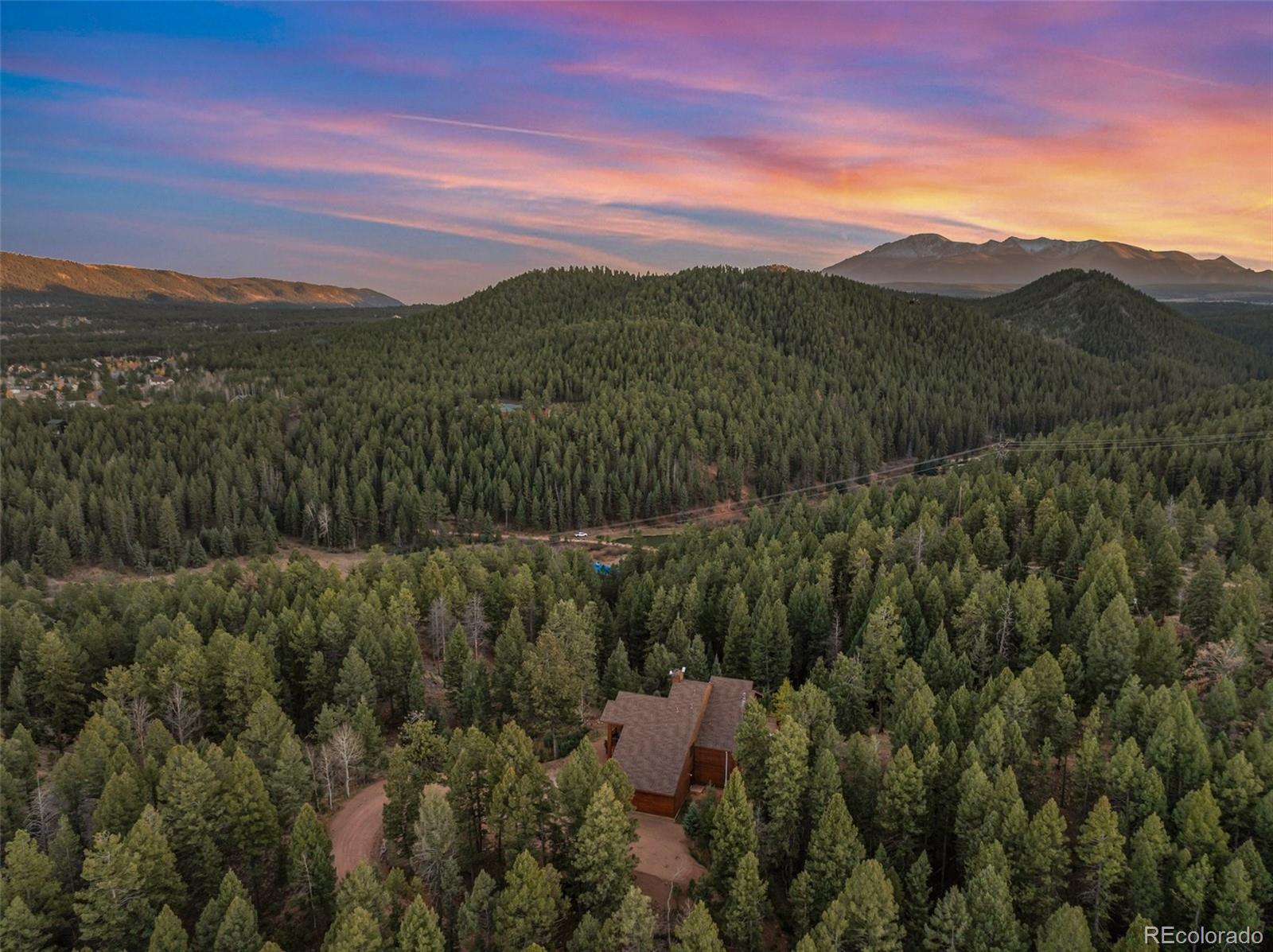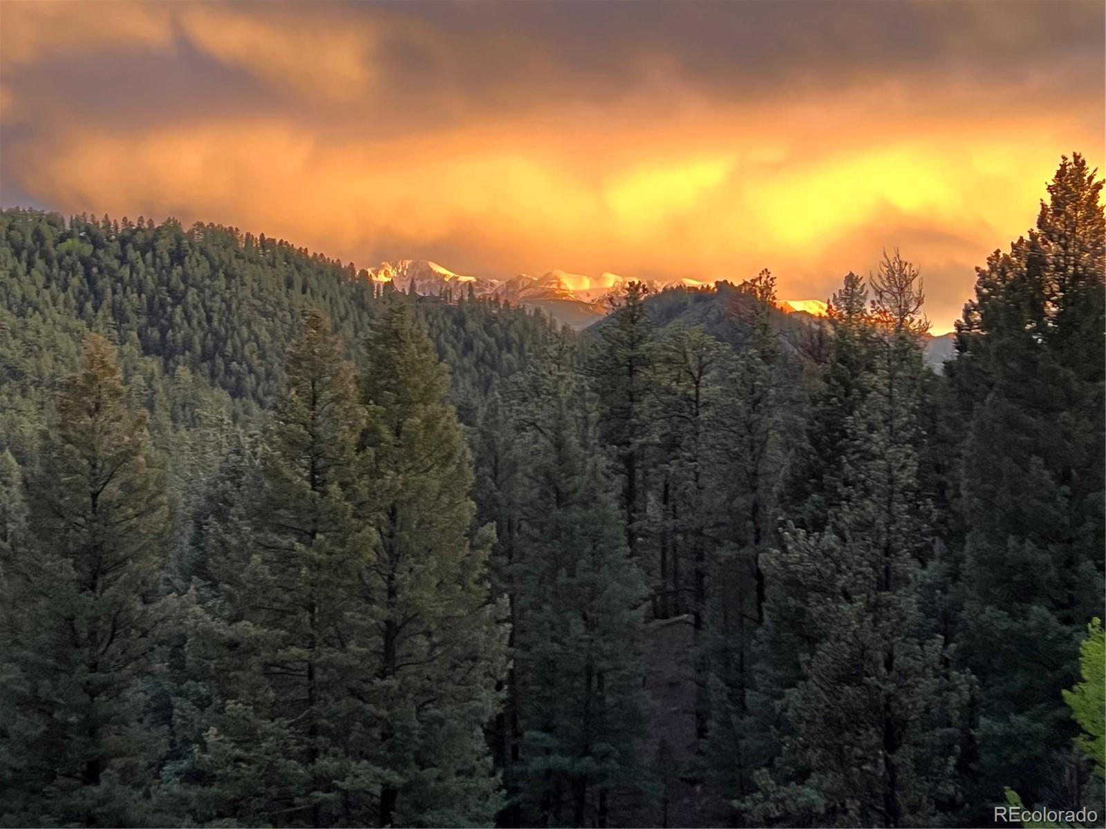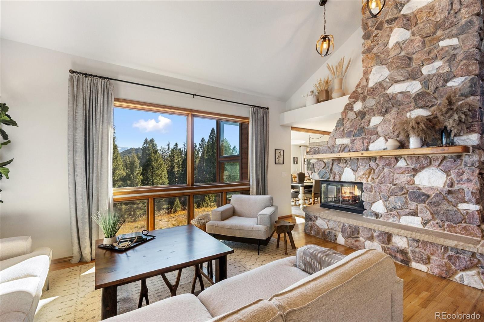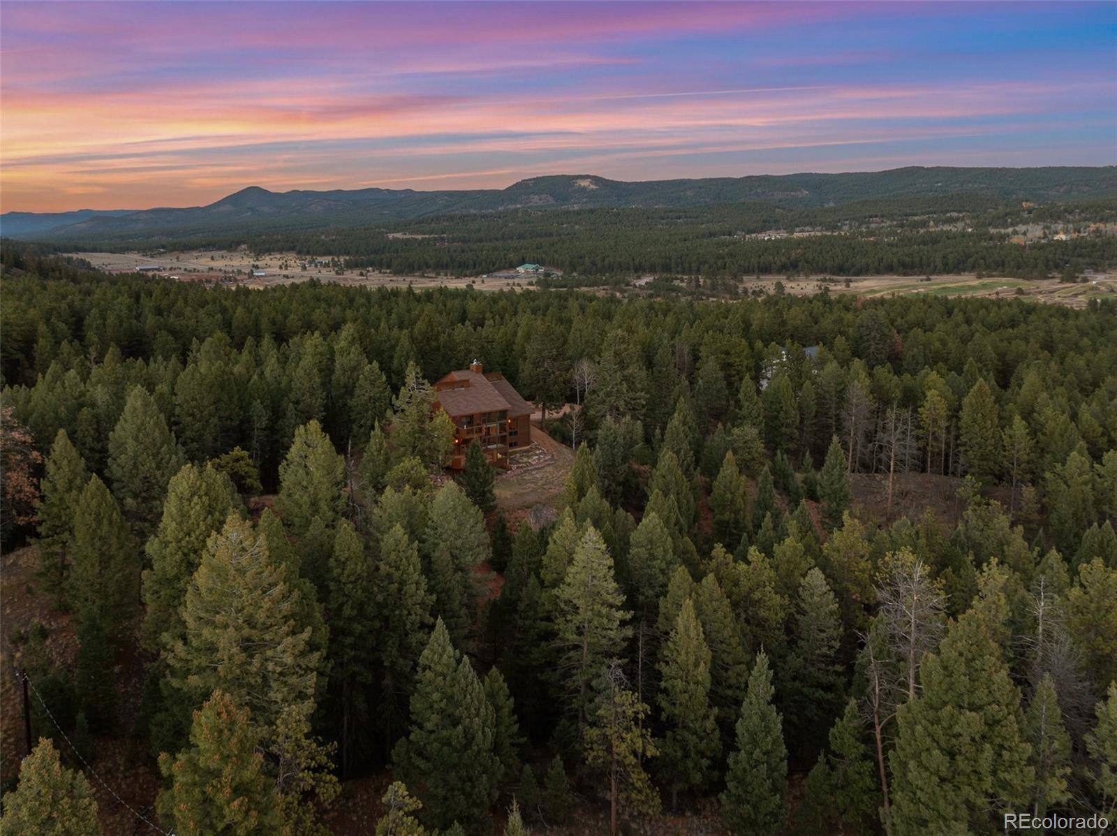 Beautifully updated custom home on 5 private acres in desirable Flying Cloud Estates with sweeping views of Pikes Peak. The inviting contemporary mountain design features open-beam vaulted ceilings, oak flooring, granite counters, hickory cabinets, and expansive windows to showcase the surrounding scenery. Recent upgrades include full interior paint, fresh exterior stain, new electrical switches/outlets, updated plumbing and lighting fixtures, and a new water softener. Thoughtfully offered fully furnished with high-end designer pieces and curated local artwork, this home is move-in ready. The main level offers an open kitchen with island and pantry, adjoining dining areas, and a spacious living room anchored by a striking floor-to-ceiling three-sided quartz fireplace. A main-level secondary suite with adjoining bath provides flexibility for guests. Upstairs, the primary suite boasts clerestory windows, a 5-piece bath with jetted tub, walk-in closet, and a private Juliet balcony facing Pikes Peak. An additional bedroom, full bath, and loft living area with its own balcony complete the upper level. A full unfinished walk-out basement (over 1,600 sq ft) along with unfinished space off master closet provides abundant storage today and offers tremendous opportunity for future finished space. Outdoor living shines with a huge wrap-around composite deck, rock gardens, mature pines and aspens, and frequent visits from local wildlife. Awning windows allow fresh air circulation even during rain. Utility costs are exceptionally low, supported by efficient systems and thoughtful upgrades. Take a golf cart directly from your driveway with cart path access to Shining Mountain Golf Course. Minutes from Woodland Park amenities, hiking, and year-round recreation. Enjoy the best of Colorado mountain living—quiet, private, and scenic, yet convenient to town.