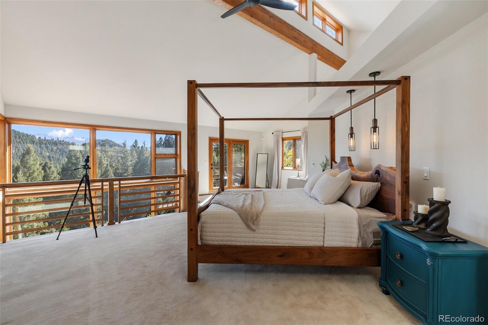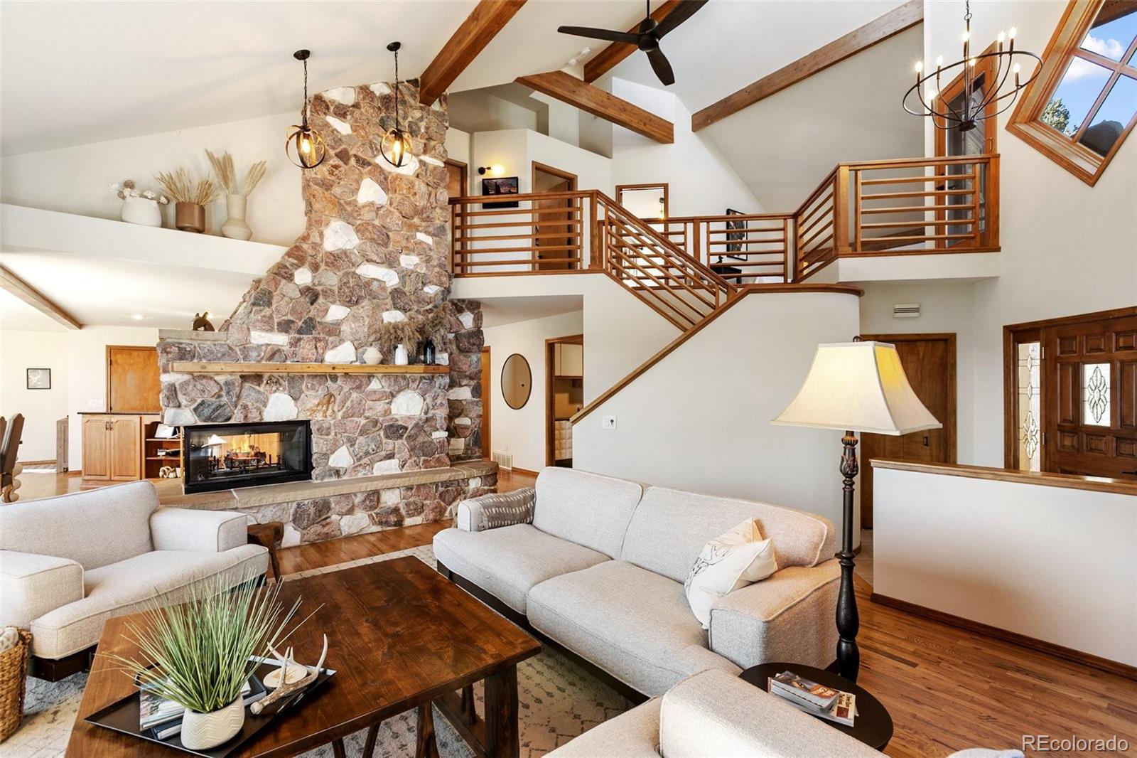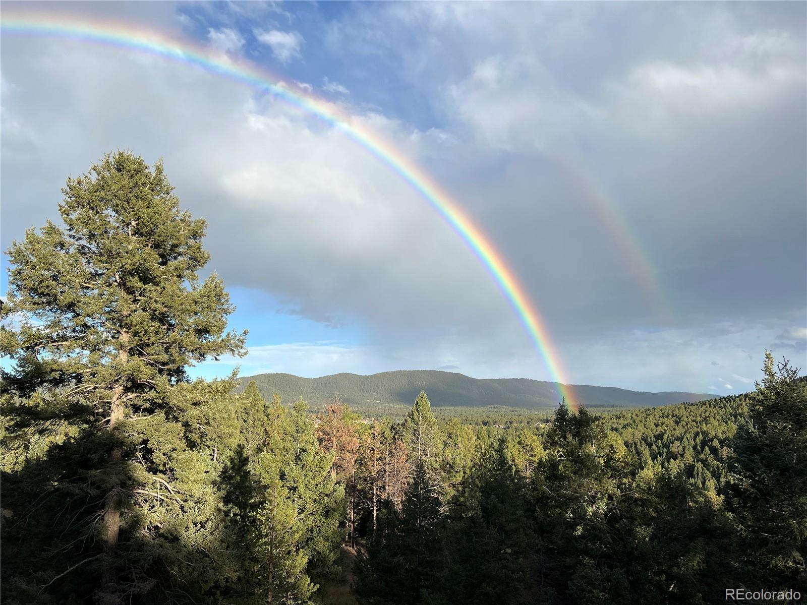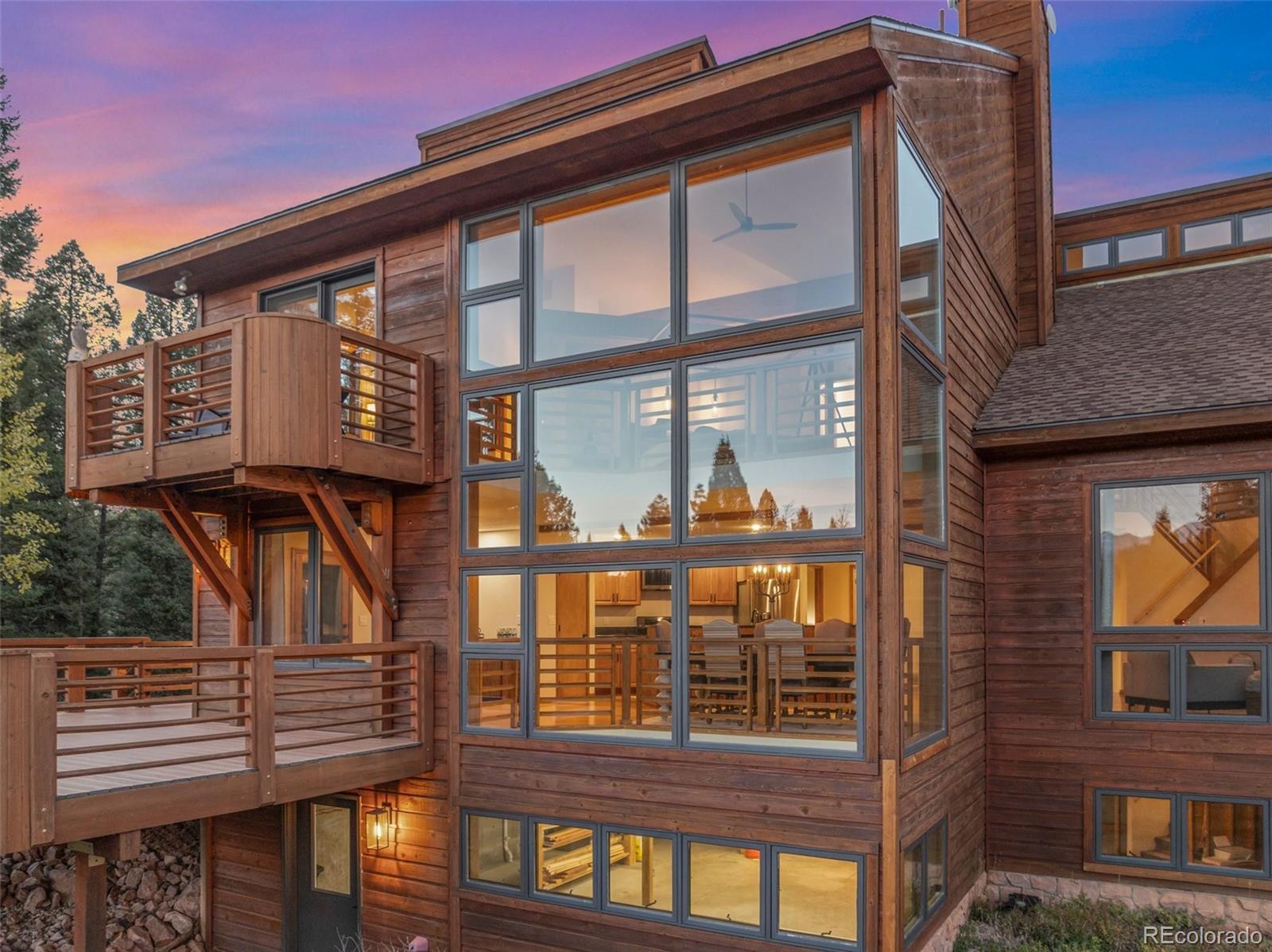 Beautifully updated custom home on 5 private acres in desirable Flying Cloud Estates with sweeping views of Pikes Peak. The inviting contemporary mountain design features open-beam vaulted ceilings, oak flooring, granite counters, hickory cabinets, and expansive windows to showcase the surrounding scenery. Recent upgrades include full interior paint, fresh exterior stain, new electrical switches/outlets, updated plumbing and lighting fixtures, and a new water softener. Thoughtfully offered fully furnished with high-end designer pieces and curated local artwork, this home is move-in ready. The main level offers an open kitchen with island and pantry, adjoining dining areas, and a spacious living room anchored by a striking floor-to-ceiling three-sided quartz fireplace. A main-level secondary suite with adjoining bath provides flexibility for guests. Upstairs, the primary suite boasts clerestory windows, a 5-piece bath with jetted tub, walk-in closet, and a private Juliet balcony facing Pikes Peak. An additional bedroom, full bath, and loft living area with its own balcony complete the upper level. A full unfinished walk-out basement (over 1,600 sq ft) along with unfinished space off master closet provides abundant storage today and offers tremendous opportunity for future finished space. Outdoor living shines with a huge wrap-around composite deck, rock gardens, mature pines and aspens, and frequent visits from local wildlife. Awning windows allow fresh air circulation even during rain. Utility costs are exceptionally low, supported by efficient systems and thoughtful upgrades. Take a golf cart directly from your driveway with cart path access to Shining Mountain Golf Course. Minutes from Woodland Park amenities, hiking, and year-round recreation. Enjoy the best of Colorado mountain living—quiet, private, and scenic, yet convenient to town.