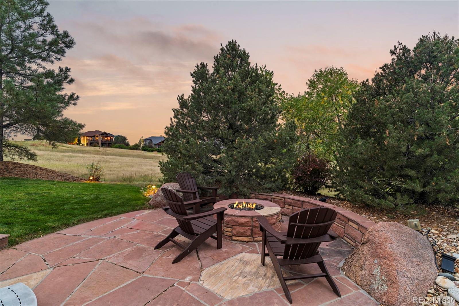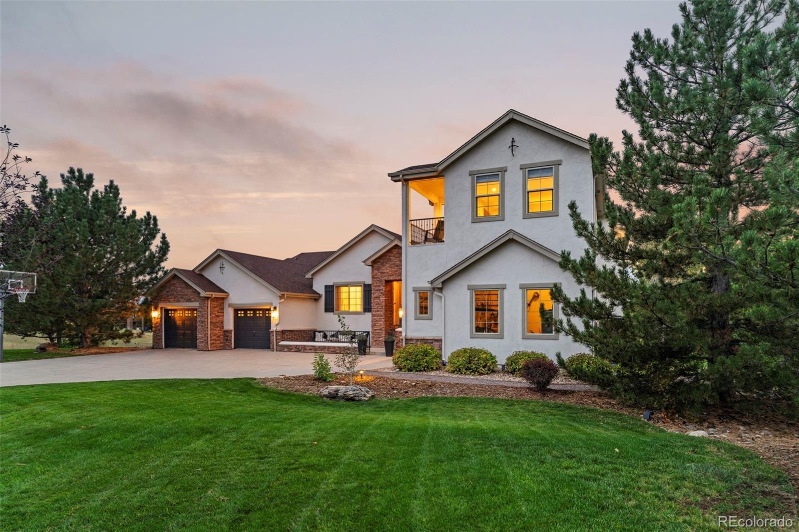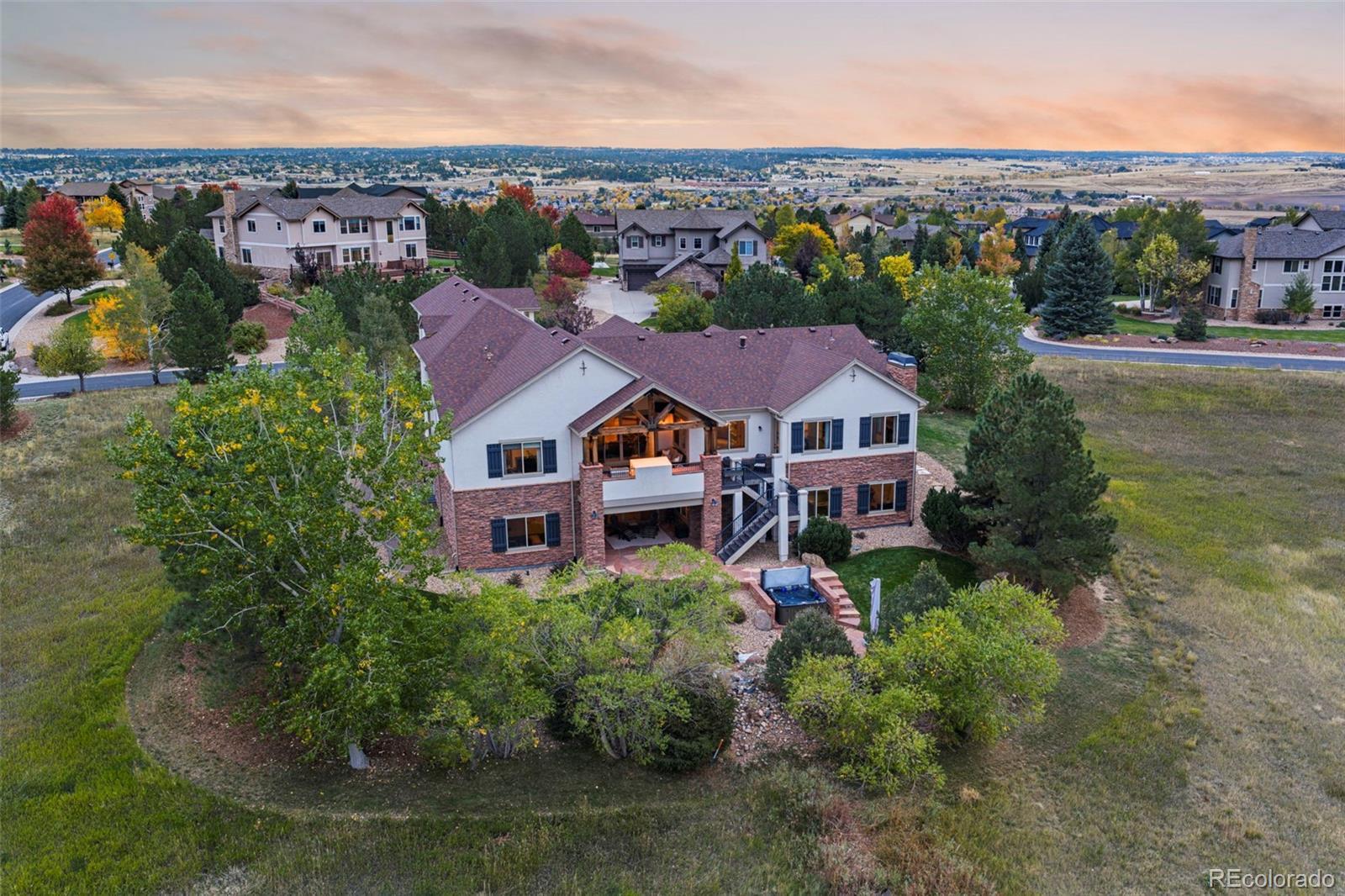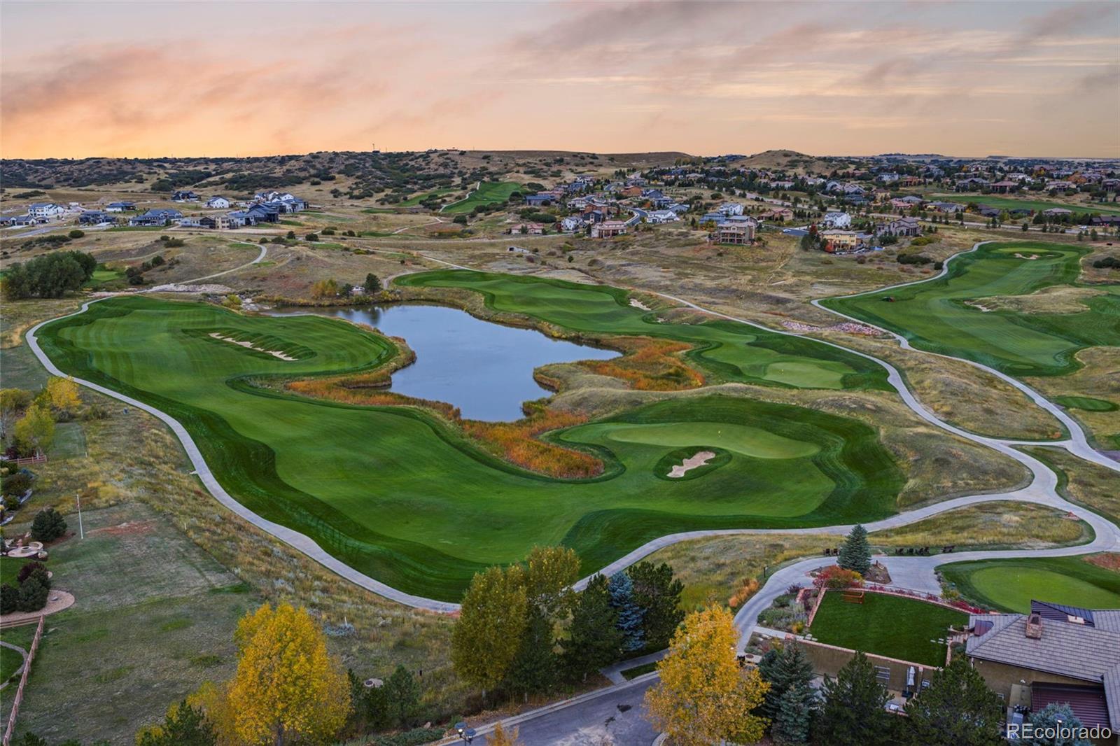 Situated on 1.22 acres along the 13th tee box of the prestigious Pradera Country Club and within walking distance to the clubhouse, this extraordinary estate offers panoramic, jaw-dropping views and refined luxury at every turn. New hardwood floors flow throughout, complemented by custom lighting, hand-troweled walls, elegant arched entries, and moss rock accents that frame dramatic fireplaces and architectural details. The gourmet kitchen is a showpiece with a paneled refrigerator, moss stone custom island, double ovens, a six-burner Viking gas range with stainless hood, and 42-inch solid cherry cabinetry with crown molding. The living room centers around a moss stone gas fireplace and walls of windows that capture the stunning scenery. The main-floor primary suite is a private sanctuary, featuring vaulted 13-foot ceilings, a sitting area with gas fireplace, a separate entrance to the back deck, a custom walk-in closet that will leave you speechless, and a spa-inspired bath with dual vanities and a seamless glass steam shower with dual shower heads and bench seating. Two additional en-suite bedrooms, and a private study with built-in bookcases and rich wood paneling complete the main level. True ranch-style living is enhanced by a private junior suite in an elevated section of the home with its own walk-in closet, bath, patio, and spiral staircase. Extended outdoor living includes a spectacular deck with built-in kitchen, grill, refrigerator, fireplace, outdoor TV, while below you’ll find a tranquil water feature, fire pit, and hot tub, all positioned to take in the unrivaled views. An unfinished walkout basement spanning 3,514 square feet is ready for your custom vision. With four bedrooms, all en suite, five baths total, exceptional craftsmanship, and a setting that blends privacy with proximity to world-class amenities, this home is a rare opportunity to own a legacy property in one of Pradera’s most coveted locations.