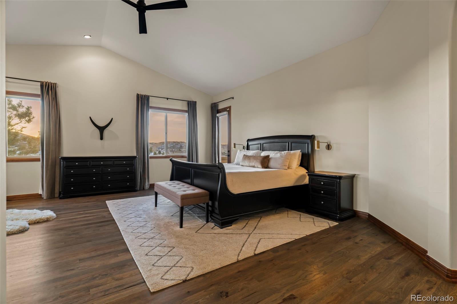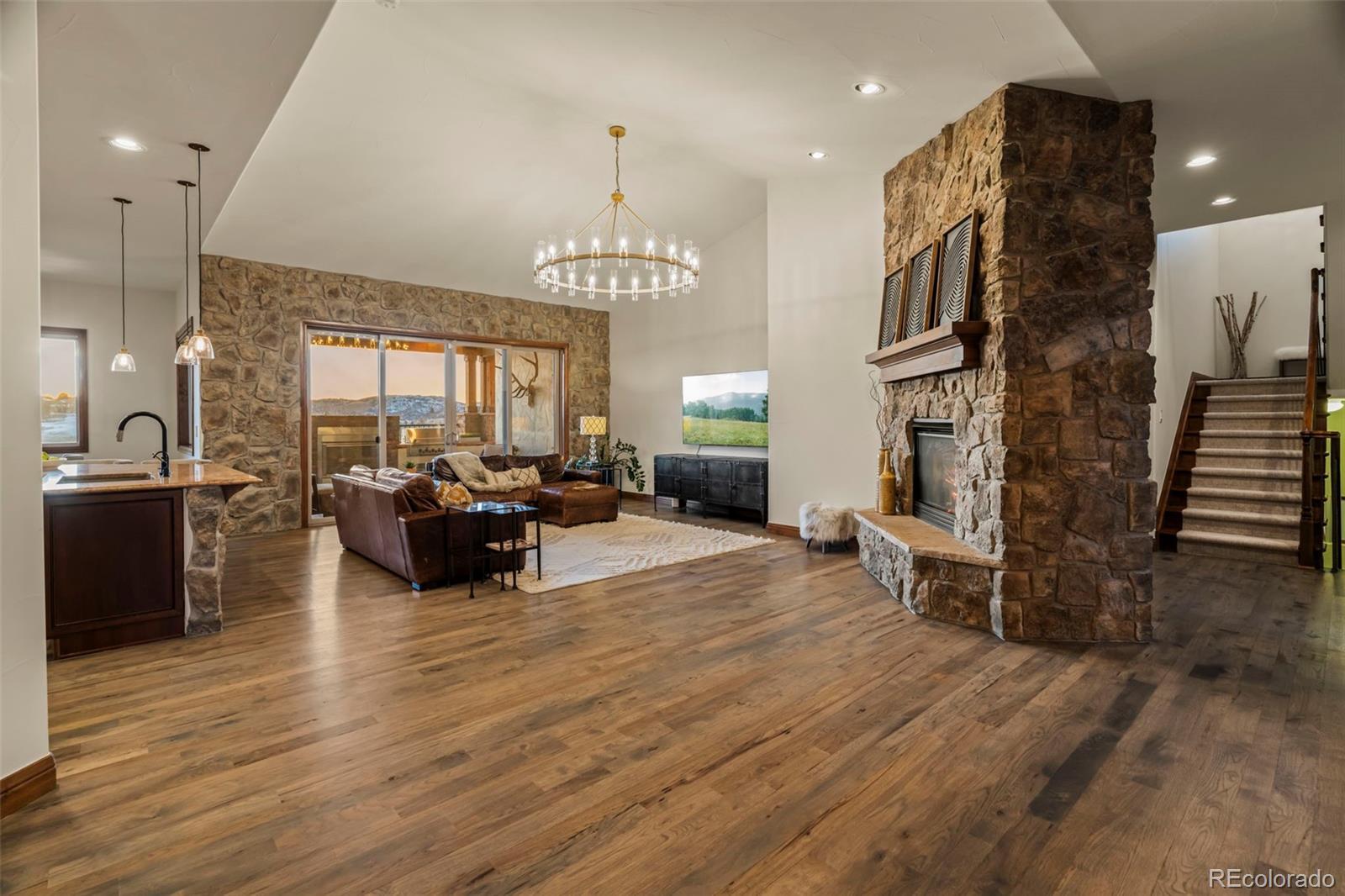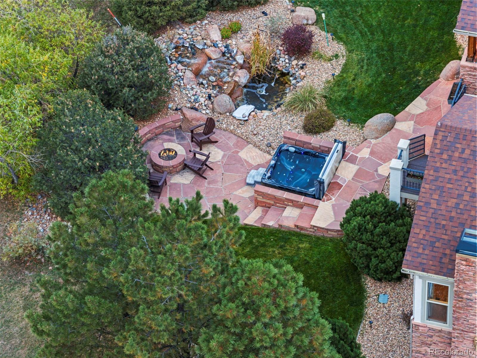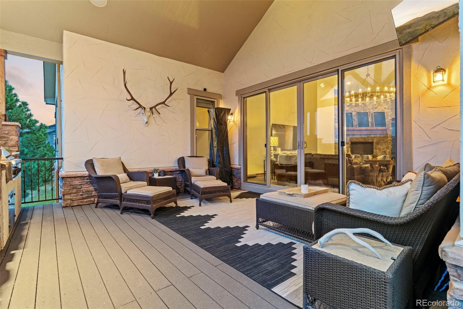 Situated on 1.22 acres along the 13th tee box of the prestigious Pradera Country Club and within walking distance to the clubhouse, this extraordinary estate offers panoramic, jaw-dropping views and refined luxury at every turn. New hardwood floors flow throughout, complemented by custom lighting, hand-troweled walls, elegant arched entries, and moss rock accents that frame dramatic fireplaces and architectural details. The gourmet kitchen is a showpiece with a paneled refrigerator, moss stone custom island, double ovens, a six-burner Viking gas range with stainless hood, and 42-inch solid cherry cabinetry with crown molding. The living room centers around a moss stone gas fireplace and walls of windows that capture the stunning scenery. The main-floor primary suite is a private sanctuary, featuring vaulted 13-foot ceilings, a sitting area with gas fireplace, a separate entrance to the back deck, a custom walk-in closet that will leave you speechless, and a spa-inspired bath with dual vanities and a seamless glass steam shower with dual shower heads and bench seating. Two additional en-suite bedrooms, and a private study with built-in bookcases and rich wood paneling complete the main level. True ranch-style living is enhanced by a private junior suite in an elevated section of the home with its own walk-in closet, bath, patio, and spiral staircase. Extended outdoor living includes a spectacular deck with built-in kitchen, grill, refrigerator, fireplace, outdoor TV, while below you’ll find a tranquil water feature, fire pit, and hot tub, all positioned to take in the unrivaled views. An unfinished walkout basement spanning 3,514 square feet is ready for your custom vision. With four bedrooms, all en suite, five baths total, exceptional craftsmanship, and a setting that blends privacy with proximity to world-class amenities, this home is a rare opportunity to own a legacy property in one of Pradera’s most coveted locations.