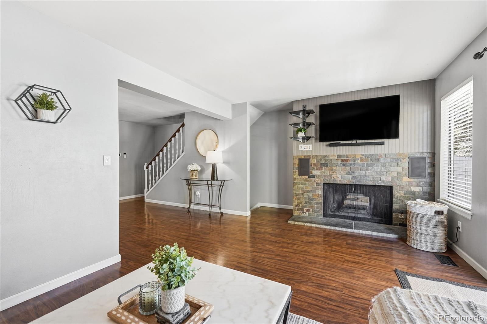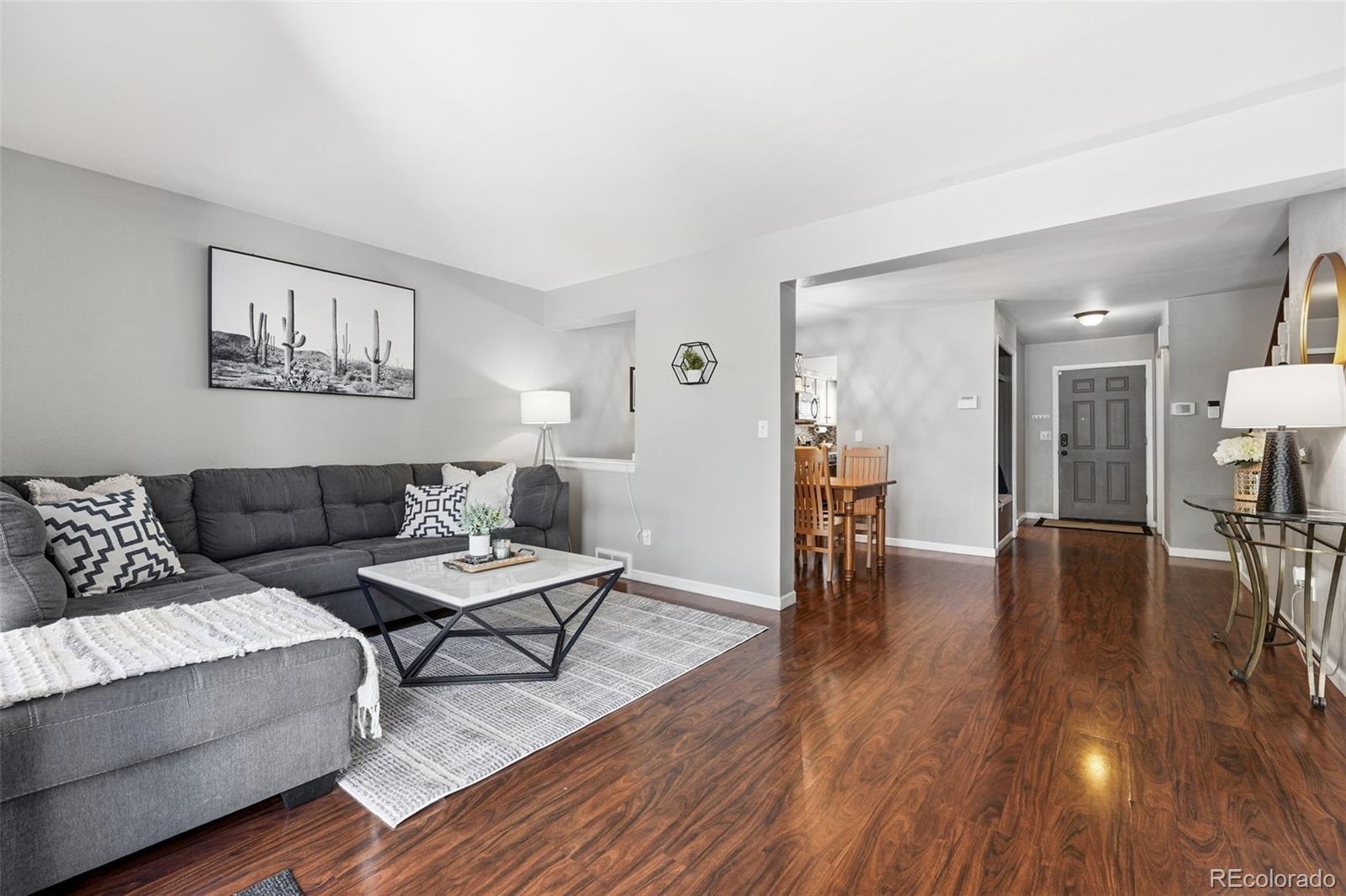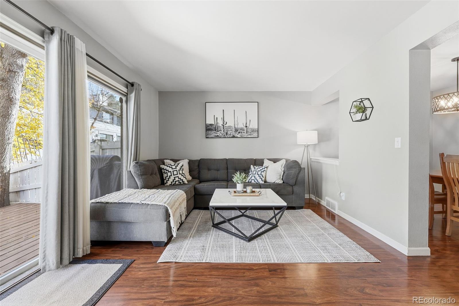 Welcome to 7816 W 90th Ave, a charming townhouse nestled in a park-like setting. This home offers a spacious 1,755 square feet of living space, featuring 3 spacious bedrooms and 3 updated bathrooms. As you step inside, you'll be greeted by a built-in cubby for coats. Looking into the home, you can't help but notice the park-like view through the glass doors. The windowed kitchen adds to the charm and functionality of the space, boasting an abundant number of cabinets, great counter space, and black appliances. Adjacent to the kitchen, the dining area opens up to the spacious living room. Relax by the cozy wood fireplace in the living area, or step out onto the deck to enjoy the serene common outdoor space. Upstairs, you'll find 2 generously sized bedrooms with an abundance of closet space and a fully updated bathroom. Step down into the basement, and you will find a third bedroom and a 3/4 bath, great for guests or a home office. Additional amenities include central AC and a washer and dryer. Discover a blend of new carpet, wood laminate, and tile flooring that complements each room. Parking is not a problem—enjoy the detached garage and a reserved parking spot. Residents can enjoy a community pool and tennis court, as well as nearby trails, parks, Standley Lake, and Westminster Dog Park, making this a great location. There is easy access to Hwy 36 and Wadsworth Blvd. Experience the perfect blend of comfort and convenience in this delightful Westminster townhouse. Don't miss the opportunity to make this your new home!