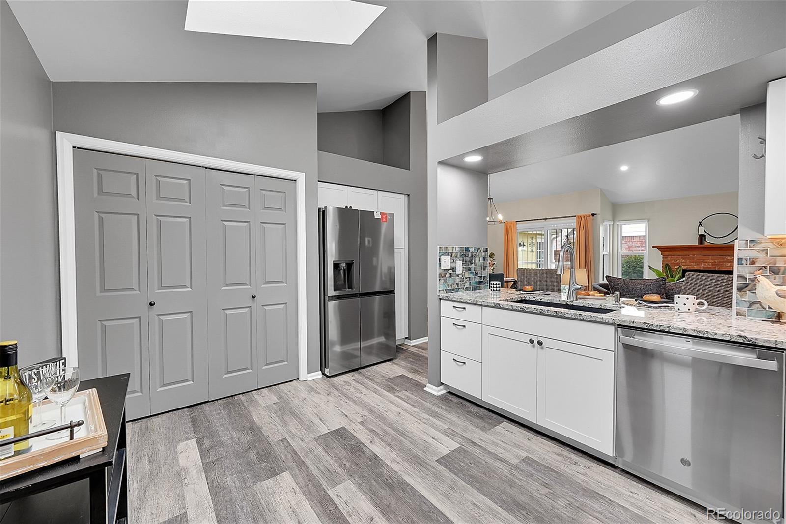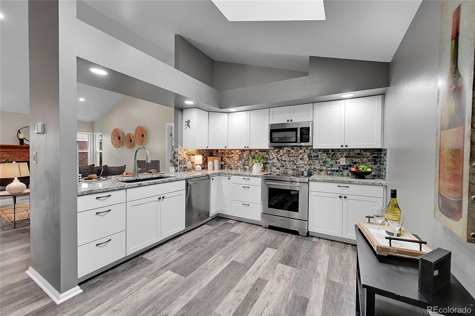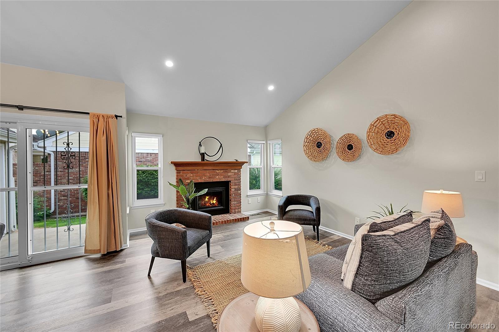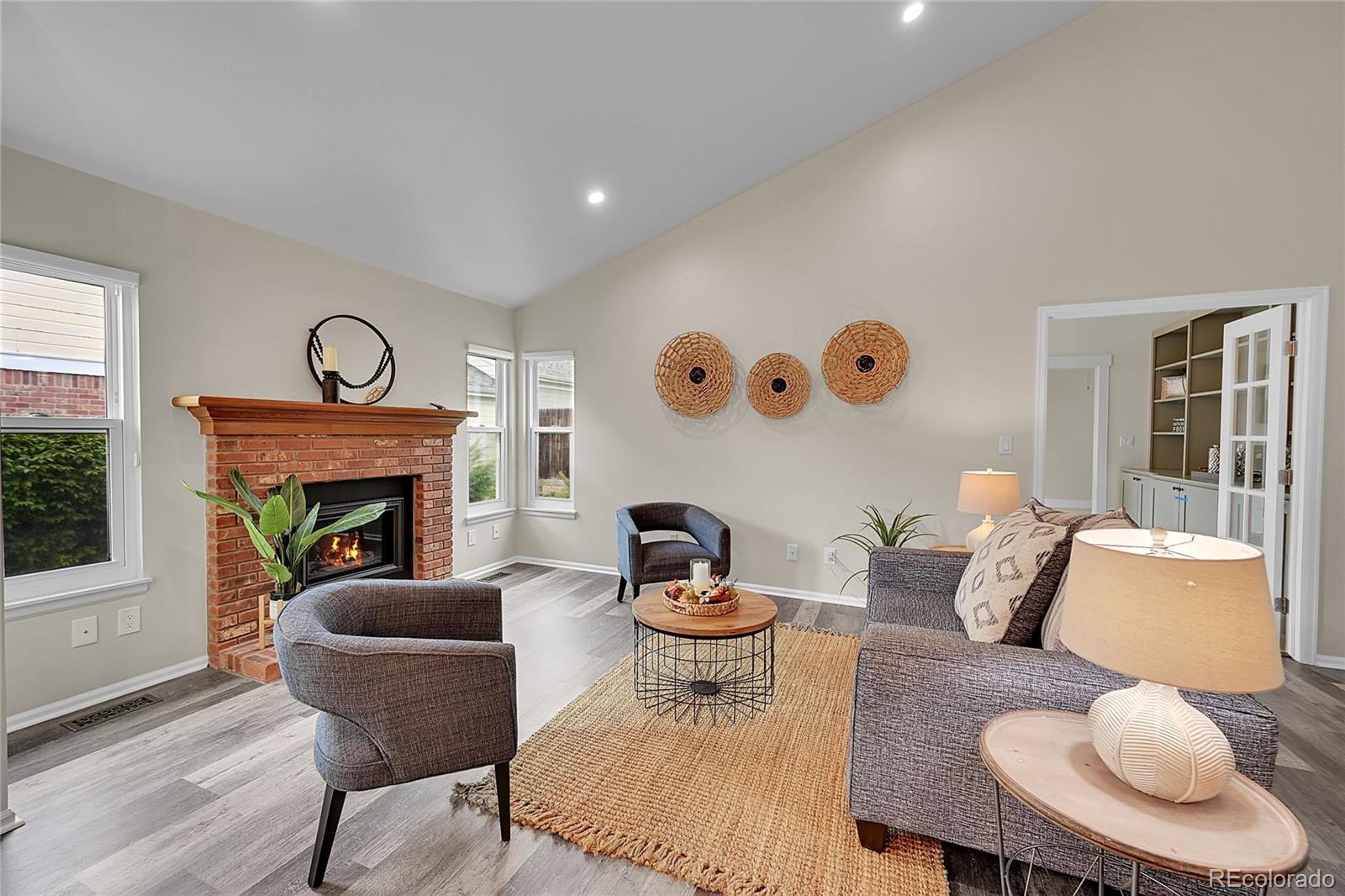 Welcome Home! Buyers are going to LOVE this updated ranch style home nestled in a quiet community called Parkside in Governor's Ranch. Check out the soaring vaulted ceilings & stylish upgrades throughout. The front bedroom is filled with natural light, with brand new carpet & paint. There's a full size bathroom right off this bedroom, perfect for guests or family members. At the heart of the home is an expansive great room that seamlessly connects the living, dining, & kitchen areas, making it the perfect entertaining space. Get ready for cooler nights & enjoy the new Jotul fireplace insert. Many updates since 2023 include newer roof, newer plank flooring, paint, window coverings, furnace and AC systems, tankless NG water heater, NUVO H2O system, basement floor & wall paint, brand new Wolf induction range, kitchen sink & garbage disposal, garage heaters & insulation. The kitchen is nicely updated with newer shaker style cabinets, high end granite, stainless steel appliances, & paint. Two skylights just flood this kitchen with natural light. Just off the great room is a cozy den with NEW custom built-in book cases, tile floor, door, base and casing, and paint. The recent updated vaulted primary site offers a luxurious retreat with dual sinks, a spacious walk-in shower, a new tub, new plumbing fixtures, & tile flooring. These owners had exquisite taste and it shows throughout the updates. The unfinished basement is waiting for your designer touches. There are 2 covered patios to enjoy in all 4 seasons. Step outside & enjoy a private yard, a garden area for flowers/vegetables. The two car insulated garage is roomy & heated. Home is near Belleview Shores shopping center, Southwest Plaza Mall, Racoon Creek Golf Course, & Clement Park. Ideally located near Cody Park & Governor's Ranch Park, a short drive to downtown Denver, Chatfield State Park, & Red Rocks Amphitheatre. The HOA offers a pool, tennis and pickle ball courts, a clubhouse, parks & trails.