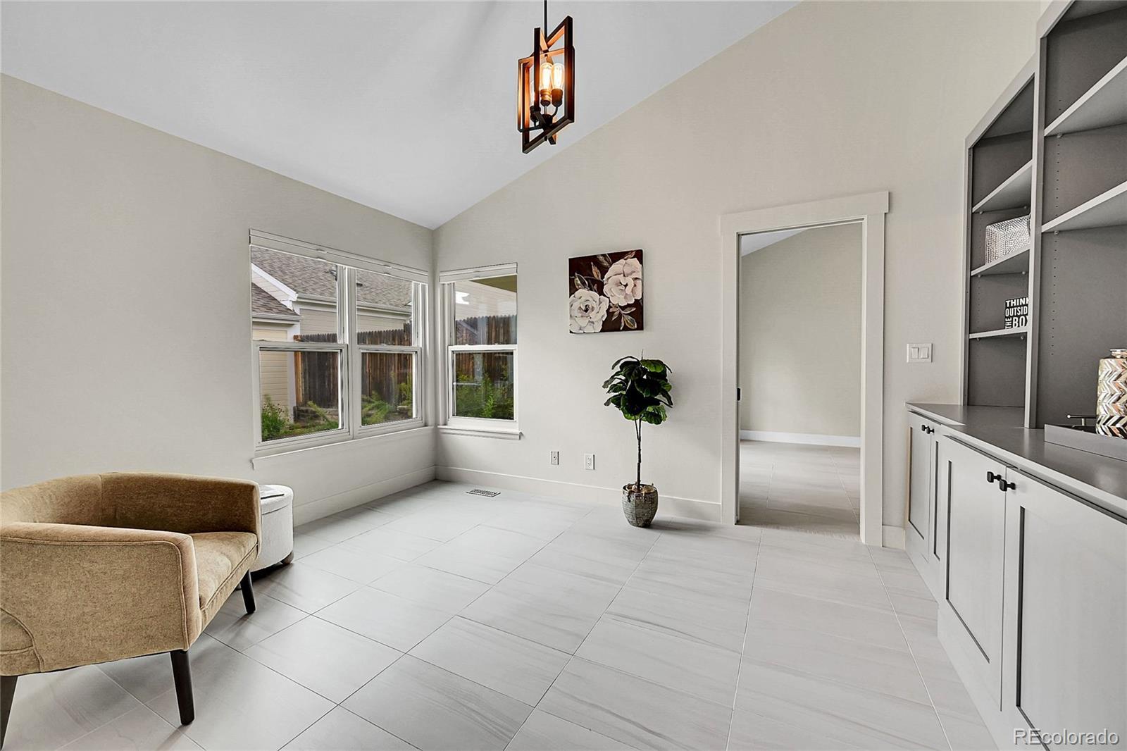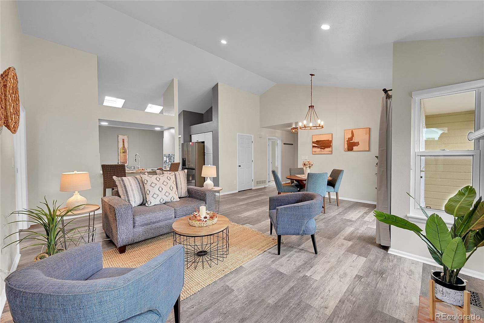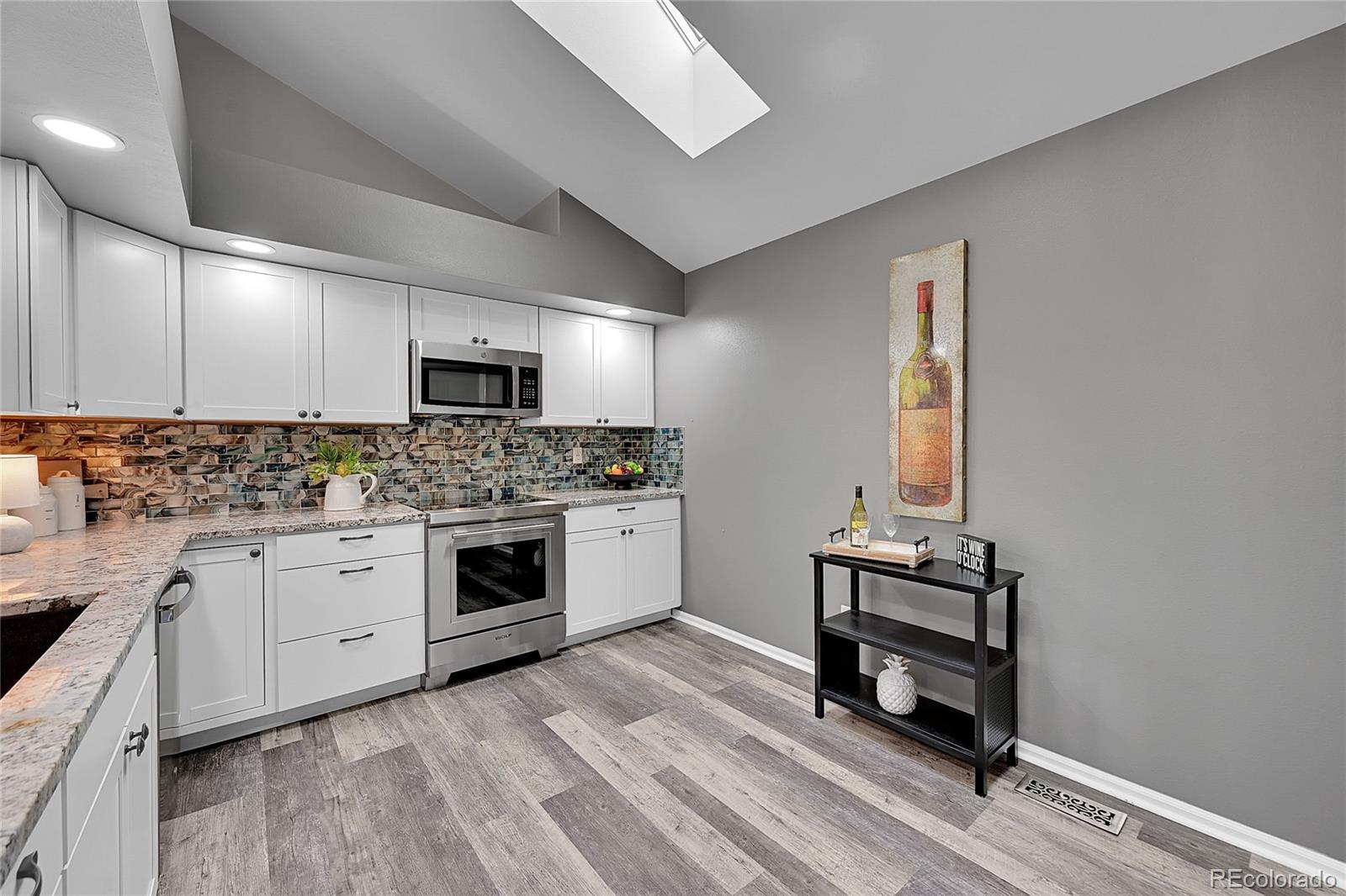 Welcome Home! Buyers are going to LOVE this updated ranch style home nestled in a quiet community called Parkside in Governor's Ranch. Check out the soaring vaulted ceilings & stylish upgrades throughout. The front bedroom is filled with natural light, with brand new carpet & paint. There's a full size bathroom right off this bedroom, perfect for guests or family members. At the heart of the home is an expansive great room that seamlessly connects the living, dining, & kitchen areas, making it the perfect entertaining space. Get ready for cooler nights & enjoy the new Jotul fireplace insert. Many updates since 2023 include newer roof, newer plank flooring, paint, window coverings, furnace and AC systems, tankless NG water heater, NUVO H2O system, basement floor & wall paint, brand new Wolf induction range, kitchen sink & garbage disposal, garage heaters & insulation. The kitchen is nicely updated with newer shaker style cabinets, high end granite, stainless steel appliances, & paint. Two skylights just flood this kitchen with natural light. Just off the great room is a cozy den with NEW custom built-in book cases, tile floor, door, base and casing, and paint. The recent updated vaulted primary site offers a luxurious retreat with dual sinks, a spacious walk-in shower, a new tub, new plumbing fixtures, & tile flooring. These owners had exquisite taste and it shows throughout the updates. The unfinished basement is waiting for your designer touches. There are 2 covered patios to enjoy in all 4 seasons. Step outside & enjoy a private yard, a garden area for flowers/vegetables. The two car insulated garage is roomy & heated. Home is near Belleview Shores shopping center, Southwest Plaza Mall, Racoon Creek Golf Course, & Clement Park. Ideally located near Cody Park & Governor's Ranch Park, a short drive to downtown Denver, Chatfield State Park, & Red Rocks Amphitheatre. The HOA offers a pool, tennis and pickle ball courts, a clubhouse, parks & trails.