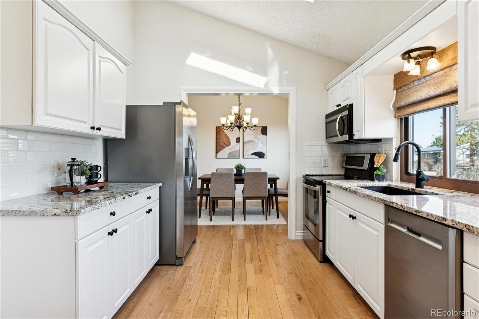 Welcome to Carefree Living at its Finest in this Beautifully Updated & Maintained Luxury Home in the Award-Winning Cherry Creek School District! The moment you arrive you'll be delighted by the professionally landscaped front yard w mature trees & a front patio w a relaxing swing. As you enter the grand front doors the foyer invites you to pause to take in the sparkling hardwoods featured on all the floors along w this elegant home design. Continuing up a few stairs to the main level you'll be delighted by the soaring vaults featuring a stunning accent beam in the expansive living room w a sun-kissed interior. You'll feel right at home as you enjoy the open design that flows from the living room w ease into the vaulted dining room & kitchen. All your guests will fit around a large dining table however there's extra room for more seating in the kitchen. The kitchen is a chef's dream w abundant granite counters & ample cabinetry for storage galore paired w stainless steel appliances along a wall of windows capturing the backyard beauty of mature trees, lavish flower gardens, 2 glorious patios & romantic lighting. The upper level boasts a private primary suite w a 10'6' walk-in, sparkling hardwoods, a custom closet built-in next to the updated vanity paired w an expanded shower w tile surround. Down the hall three spacious secondary bedrooms easily host beds along w desks & reading nooks or flex for other purposes all w soft carpet. An updated 3/4 bath w ideal separation allows for easy sharing & the linen closet is icing on the cake. The lower level is a delight, highlighting a large family room w cozy fireplace, an office w French doors, a large laundry room & updated powder bath. The backyard is truly an oasis offering a daily retreat w 2 patios, a pergola w a cover & privacy. The neighborhood is a treasure w trails, 3 parks, a short walk to the elementary & local library as well as short 30-minute commutes to Denver, DIA, Southlands or Park Meadows. Welcome Home!