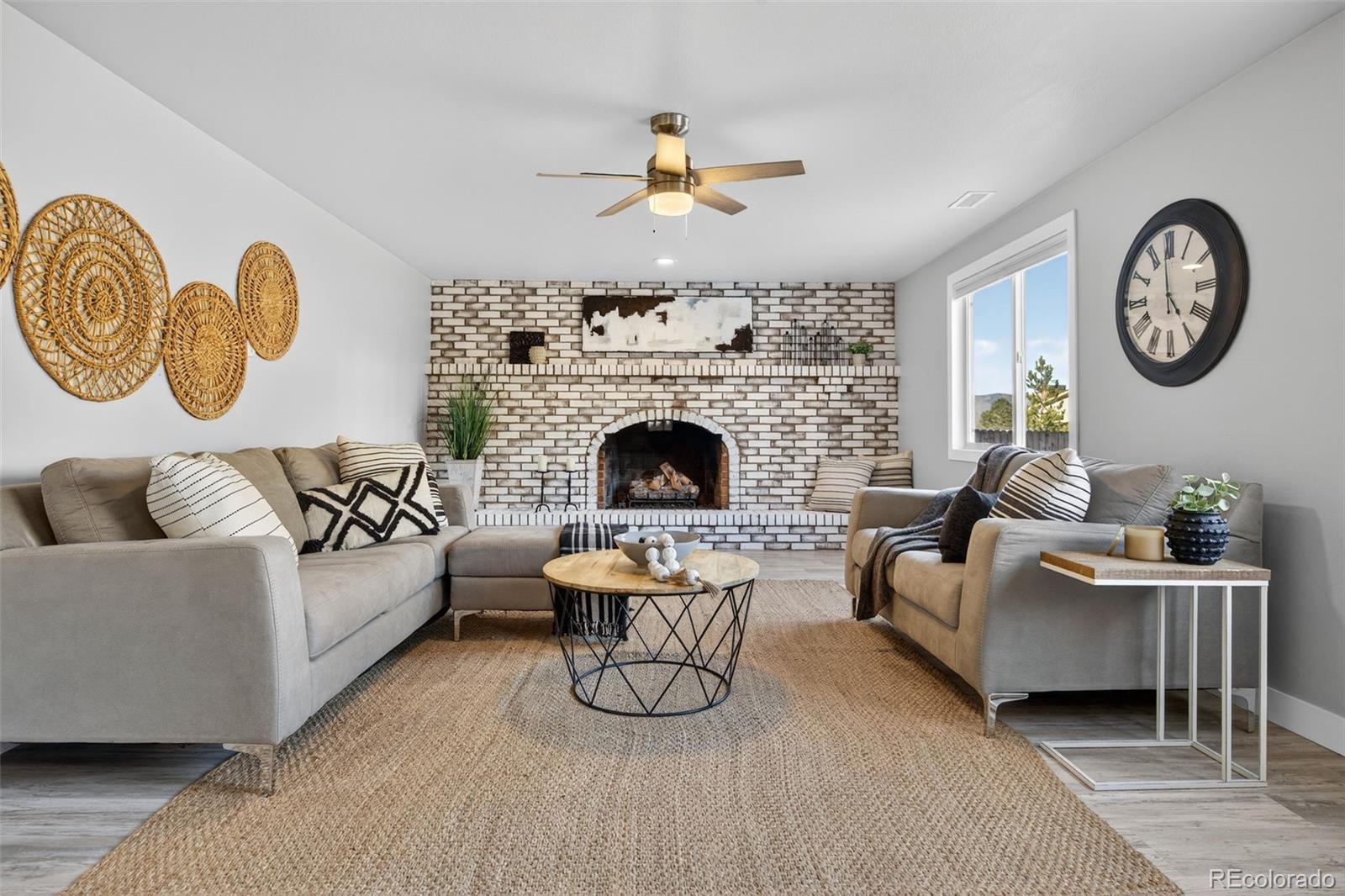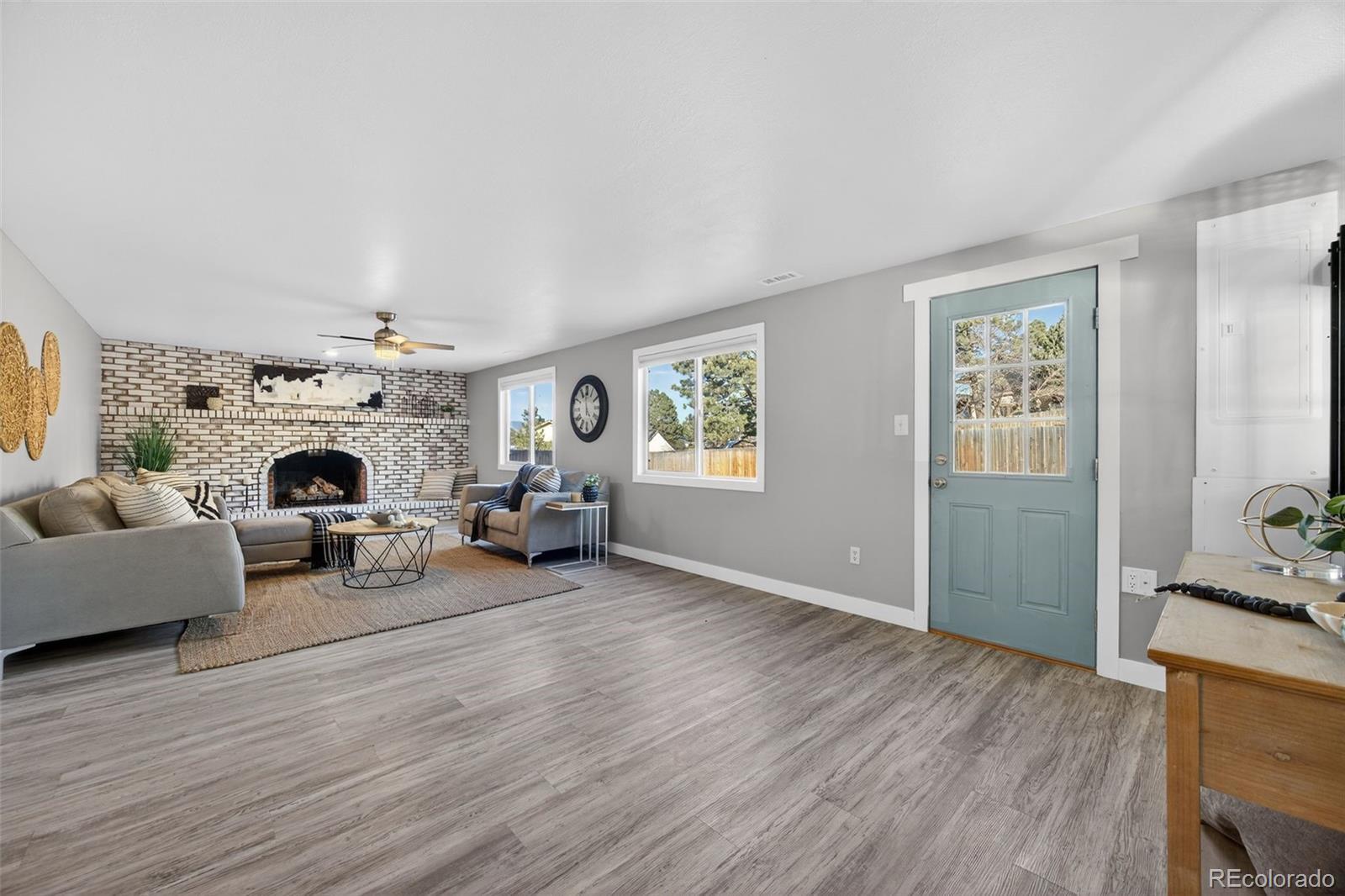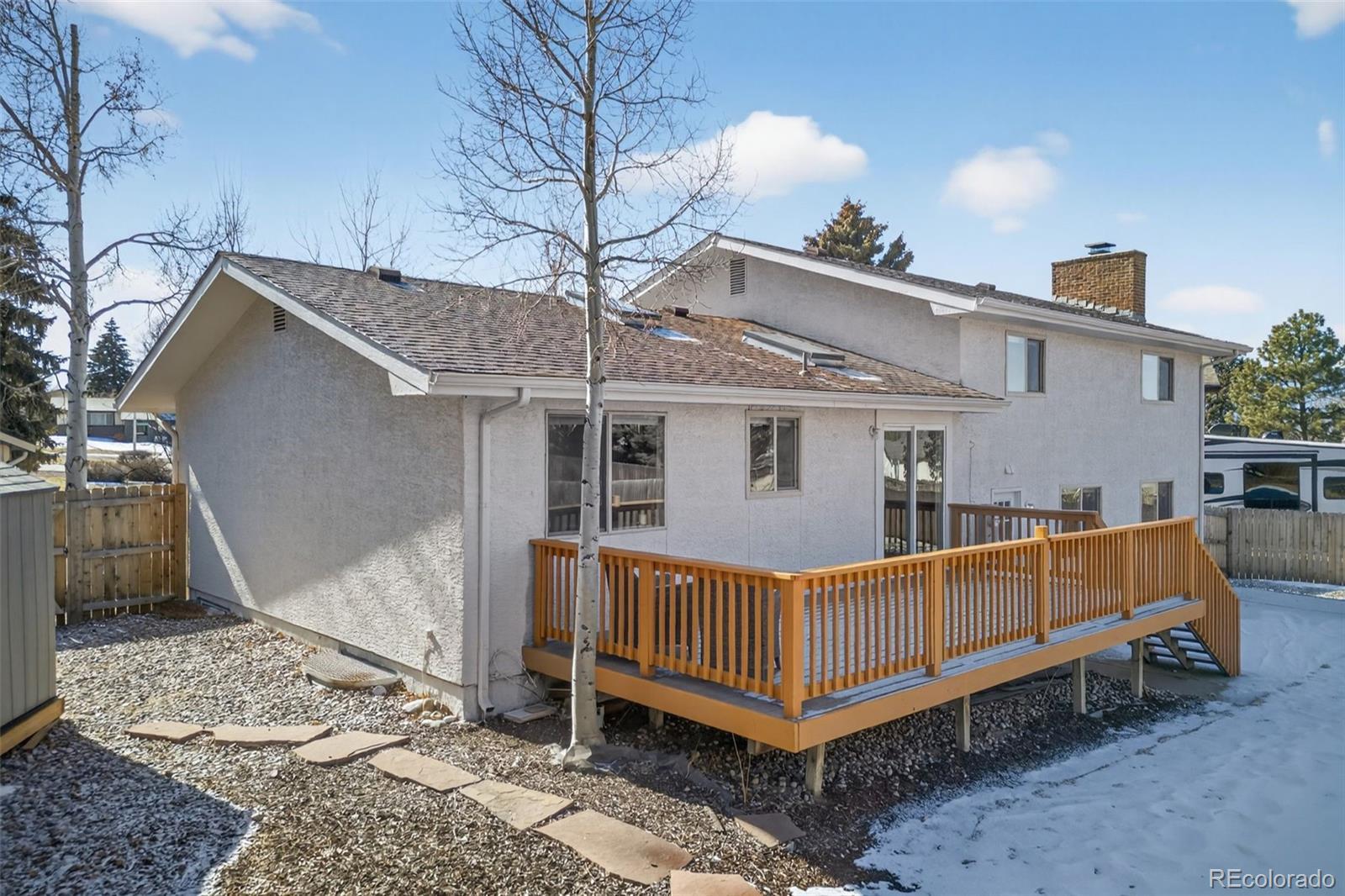 Beautifully updated home in desirable Homestead, tucked in a quiet cul-de-sac, rare yard space and added privacy. The welcoming entry features built-in cabinetry for easy organization. The remodeled kitchen is the heart of the home with cream cabinetry, white tile backsplash, clay farmhouse sink, KitchenAid stove, stainless-steel appliances, and a stunning 10-ft granite island perfect for prep, seating, and gathering. Fresh interior and exterior paint, newer carpet, LVP flooring, and updated lighting create a bright, cohesive feel. Bathrooms have been refreshed with tiled showers, new fixtures, and updated pans. The oversized primary suite offers a five-piece bath with soaking tub and separate shower. Multiple living areas provide space to gather or relax, and the gas-burning fireplace adds cozy Colorado charm. The professionally graded backyard includes an upgraded sprinkler system, deck, storage shed, two new gates and new fencing on both sides. Major upgrades include a smart Leviton electrical panel, upgraded windows and doors, epoxy garage floors, and a new roof prior to closing. Home has been professionally cleaned, including windows and duct system. Prime location near theaters, Lowe’s, major shopping (TJ Maxx, In-N-Out), Peterson AFB and close to trails. Spacious, centrally located, and move-in ready — comfort, without HOA.