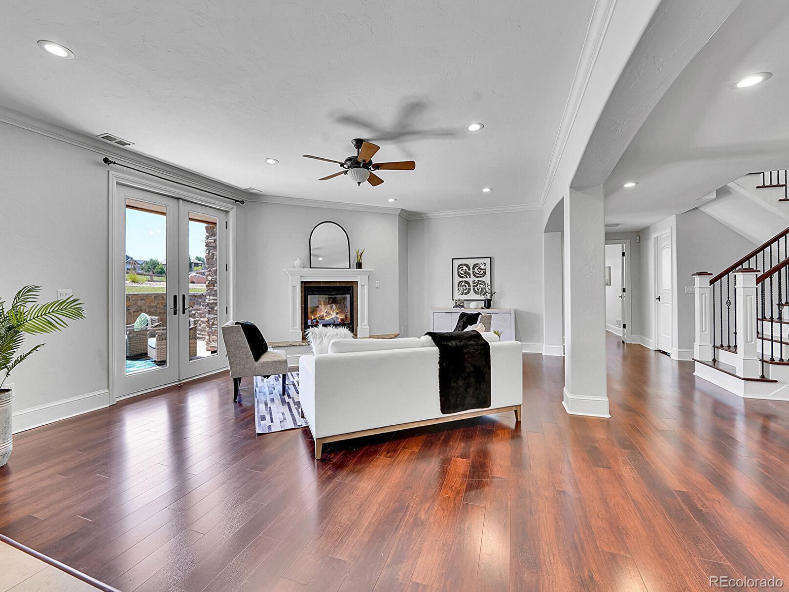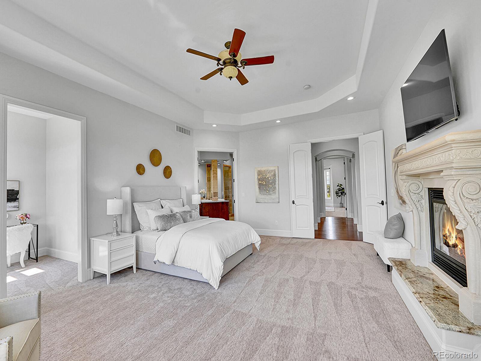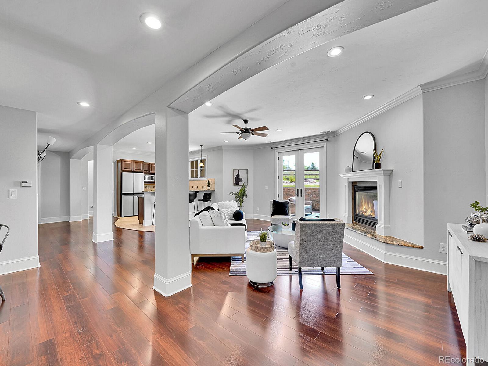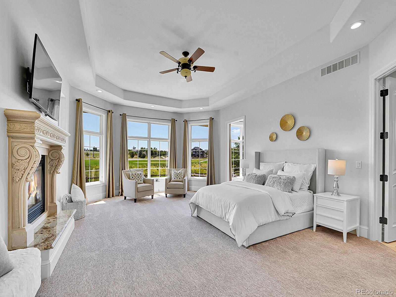 Welcome to 2131 Drive Lane, a masterfully crafted custom ranch home nestled within the exclusive Enclave at Vista Ridge. Perched on the 4th tee box of the Colorado National Golf Course, this residence was thoughtfully designed to capture panoramic views in every direction—from tranquil horse ranches and pristine fairways to breathtaking, unobstructed mountain vistas. Step into a grand, sun-drenched living room where expansive windows invite the outdoors in, setting a dramatic backdrop to the refined interiors. A dual-sided fireplace anchors both the elegant living space and the warm, inviting family room—perfectly adjoining the chef’s kitchen, which features a generous center island, charming breakfast nook, and a spacious walk-in pantry. The luxurious primary suite is a true retreat, complete with its own fireplace, an intimate reading nook, and a lavish 5-piece bath boasting dual vanities, a jetted soaking tub, and two walk-in closets. A second main-level bedroom—ideal as a guest room or office—offers serene mountain views and opens onto a private front patio. The expansive, walk-out basement is ideal for multi-generational living, with a stylish kitchenette, three additional bedrooms and three bathrooms. A flexible bonus space offers endless possibilities for a gym, studio, or additional office. Enjoy seamless indoor-outdoor living with two covered patios that invite alfresco dining and sunset lounging. Don't miss the vintage golf cart, included with the property! Located in the vibrant Vista Ridge community, you'll have access to premier amenities including a pool, clubhouse, scenic trails, and lush parks.