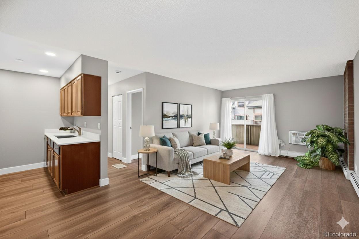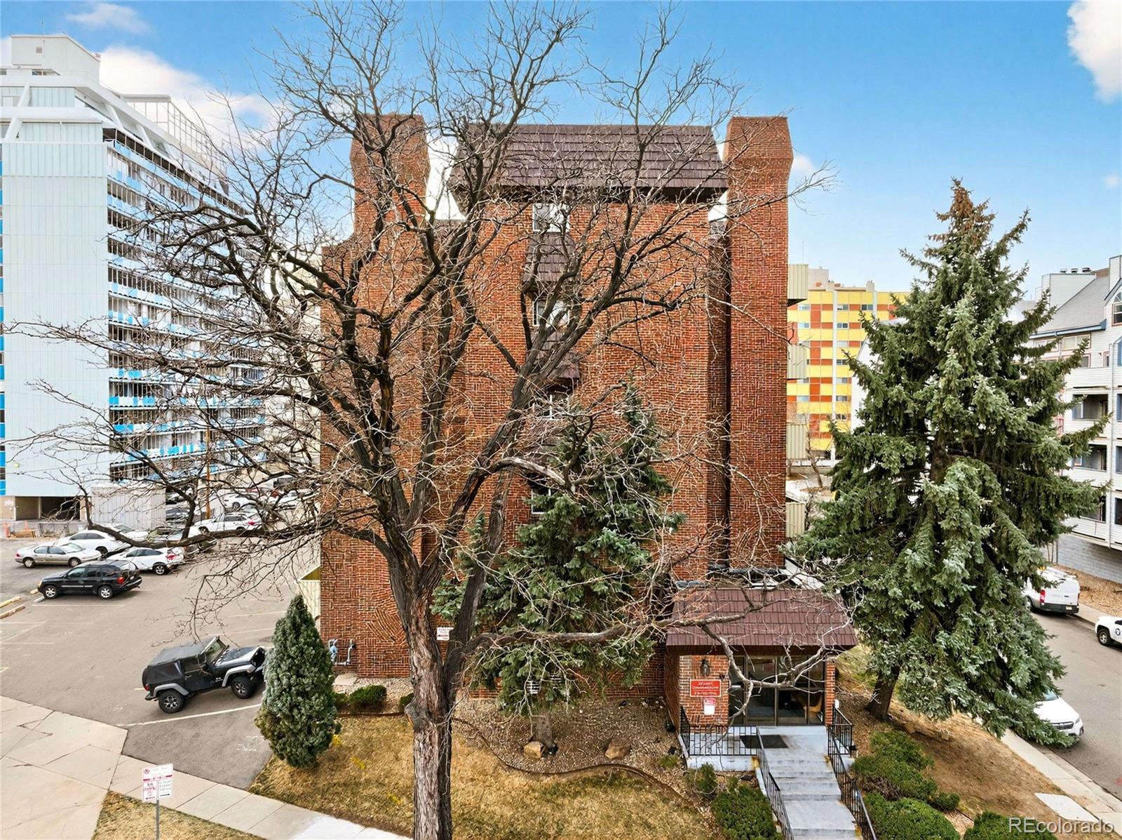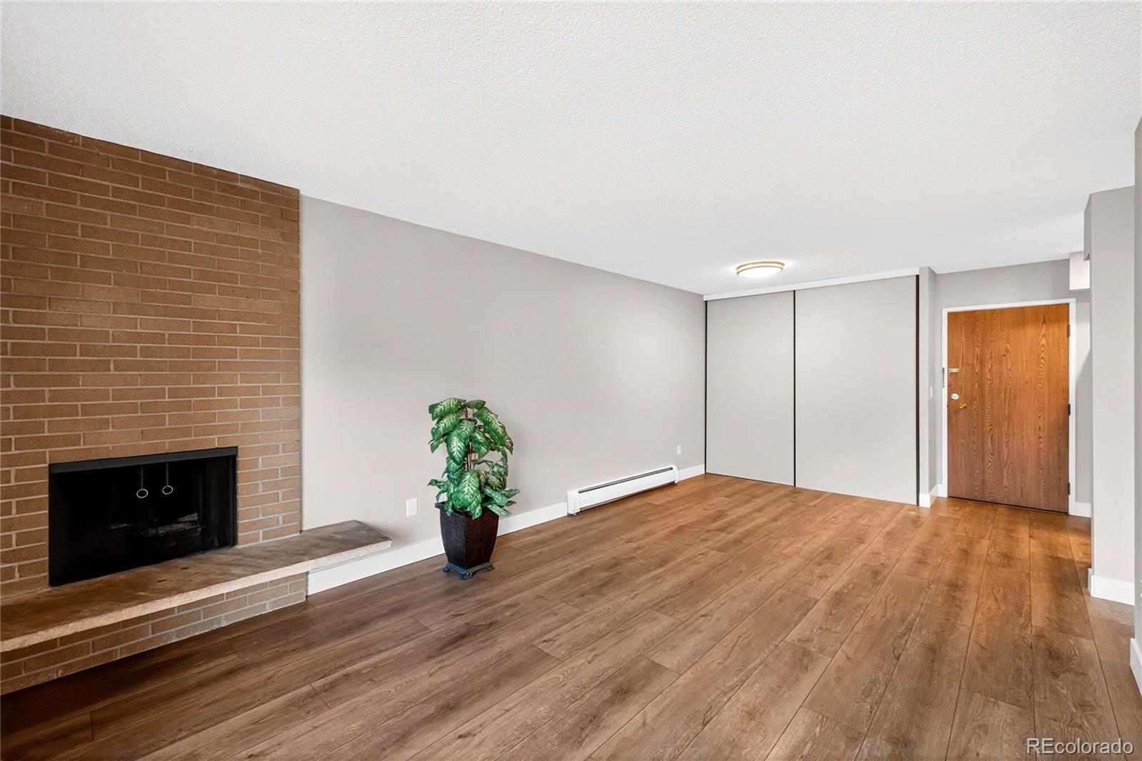 Updated in 2025 and not lived in since the renovation, this residence at 4110 Hale Parkway #5A, Denver, CO 80220 offers modern finishes and convenient central Denver access. Situated as a corner unit on the 5th floor with no one living above you, the home provides added privacy and a quiet living experience. The freshly painted interior features new LVP flooring throughout and an open living area centered around a wood-burning fireplace with brick surround. A sliding glass door opens to a private enclosed deck, providing outdoor space directly off the living room. The updated kitchen (2025) includes stainless steel appliances, stainless undermount sink, quartz counters, recessed lighting, and wood cabinetry. The bedroom offers LVP flooring, a ceiling fan with light, and secondary deck access via sliding glass doors. The bathroom and interior finishes were updated for a truly move-in-ready presentation. Home features a brand new window air-conditioning unit. Additional practical amenities include a secured building with elevator access, one deeded parking space, a private storage locker, and shared laundry facilities in the building. The location is ideal—just blocks from Trader Joe’s, AMC Theatre, and popular restaurants like Snooze. Enjoy easy access to nearby parks such as Lindsley Park (0.3 mi) and major cultural destinations including the Denver Museum of Nature & Science (˜1.3 mi), City Park Denver (˜1.7 mi), and the Denver Zoo (˜1.7 mi). Don’t miss the opportunity to make this pristine, never-lived-in home your own!