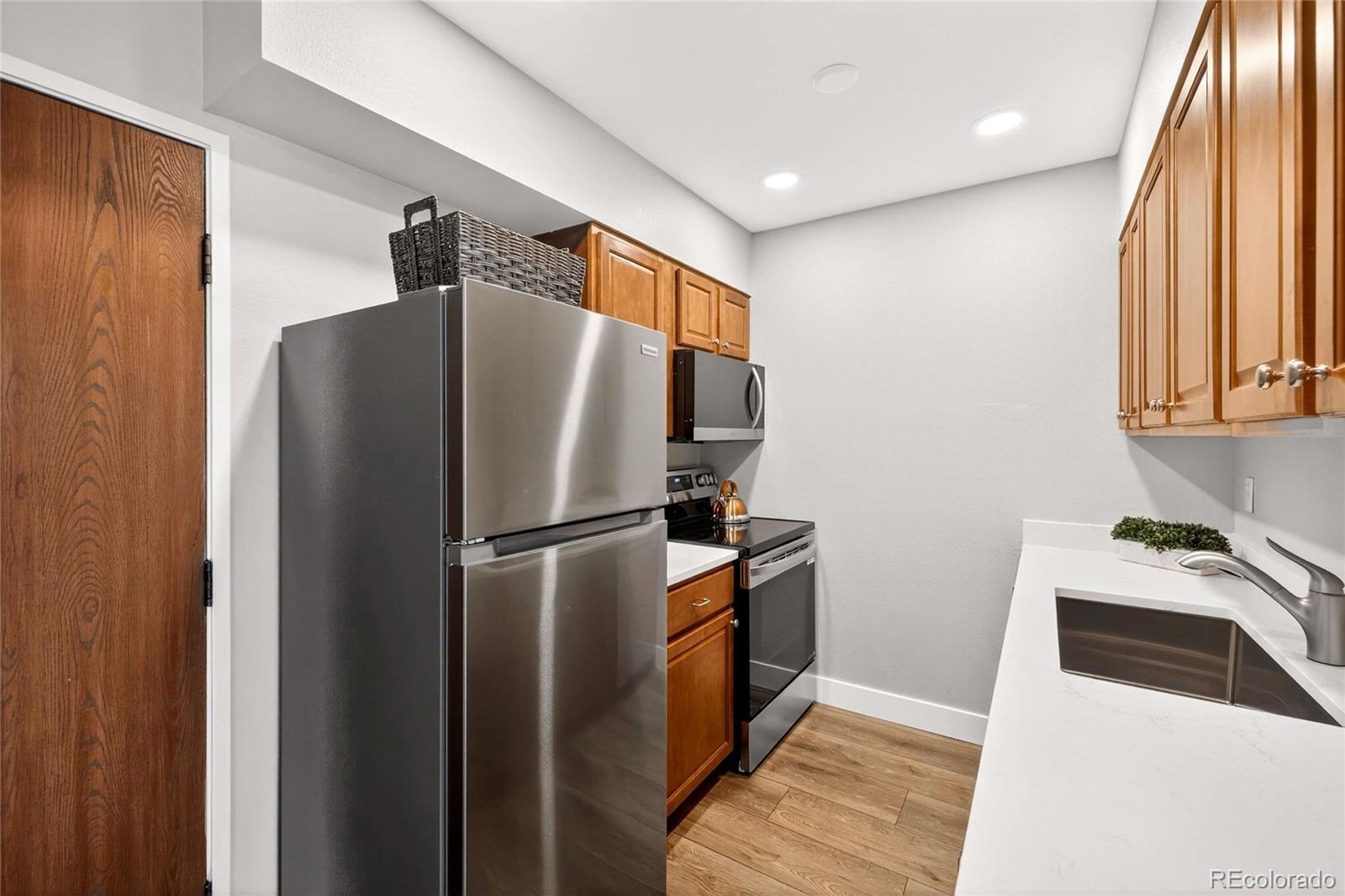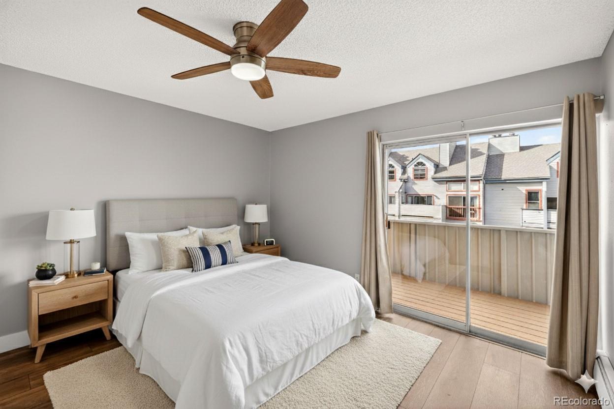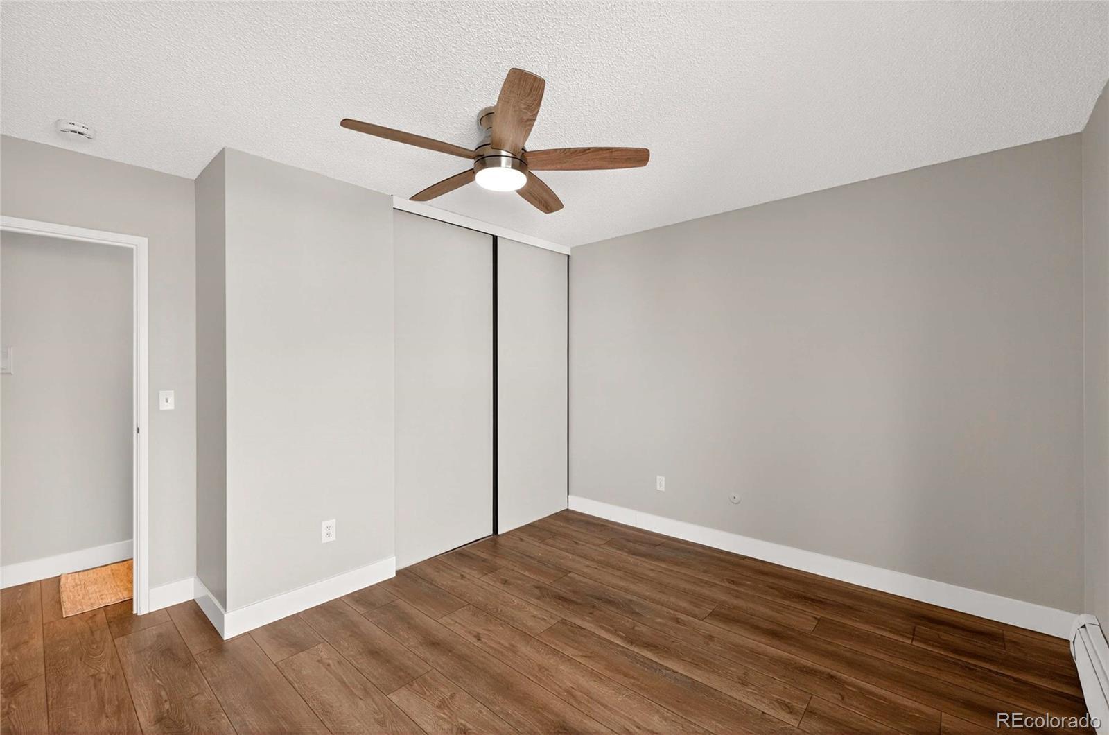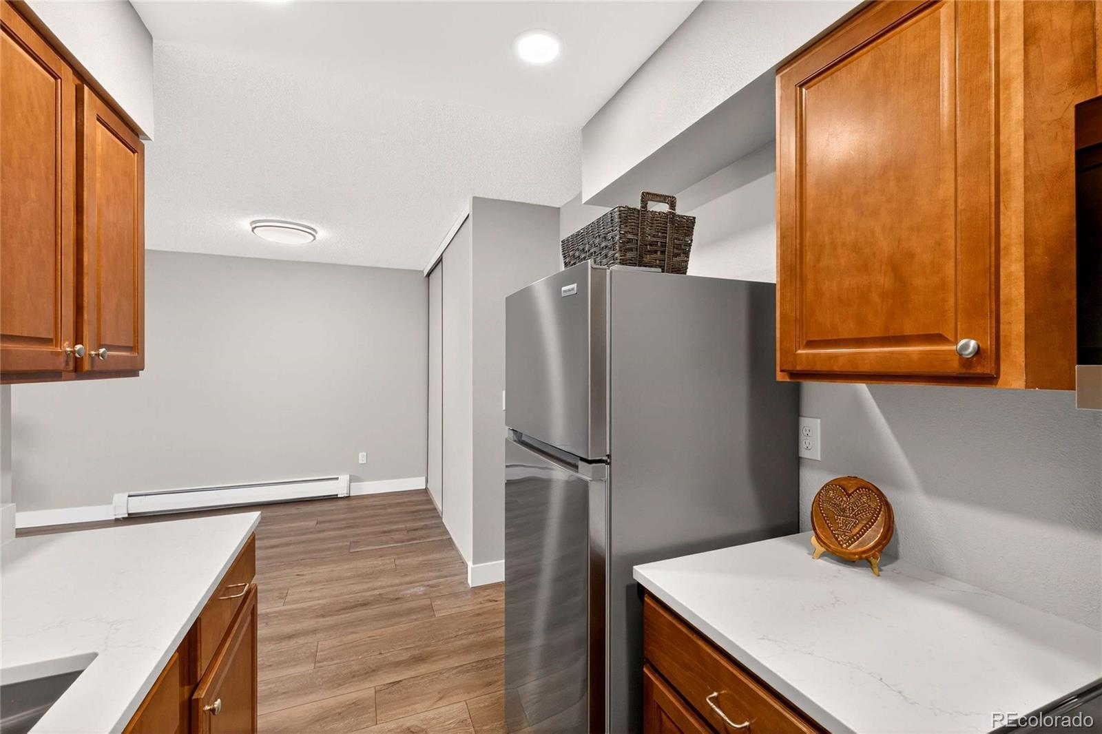 Updated in 2025 and not lived in since the renovation, this residence at 4110 Hale Parkway #5A, Denver, CO 80220 offers modern finishes and convenient central Denver access. Situated as a corner unit on the 5th floor with no one living above you, the home provides added privacy and a quiet living experience. The freshly painted interior features new LVP flooring throughout and an open living area centered around a wood-burning fireplace with brick surround. A sliding glass door opens to a private enclosed deck, providing outdoor space directly off the living room. The updated kitchen (2025) includes stainless steel appliances, stainless undermount sink, quartz counters, recessed lighting, and wood cabinetry. The bedroom offers LVP flooring, a ceiling fan with light, and secondary deck access via sliding glass doors. The bathroom and interior finishes were updated for a truly move-in-ready presentation. Home features a brand new window air-conditioning unit. Additional practical amenities include a secured building with elevator access, one deeded parking space, a private storage locker, and shared laundry facilities in the building. The location is ideal—just blocks from Trader Joe’s, AMC Theatre, and popular restaurants like Snooze. Enjoy easy access to nearby parks such as Lindsley Park (0.3 mi) and major cultural destinations including the Denver Museum of Nature & Science (˜1.3 mi), City Park Denver (˜1.7 mi), and the Denver Zoo (˜1.7 mi). Don’t miss the opportunity to make this pristine, never-lived-in home your own!