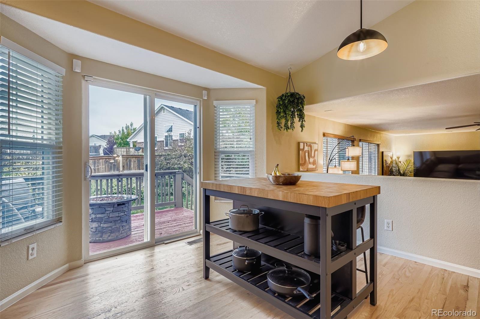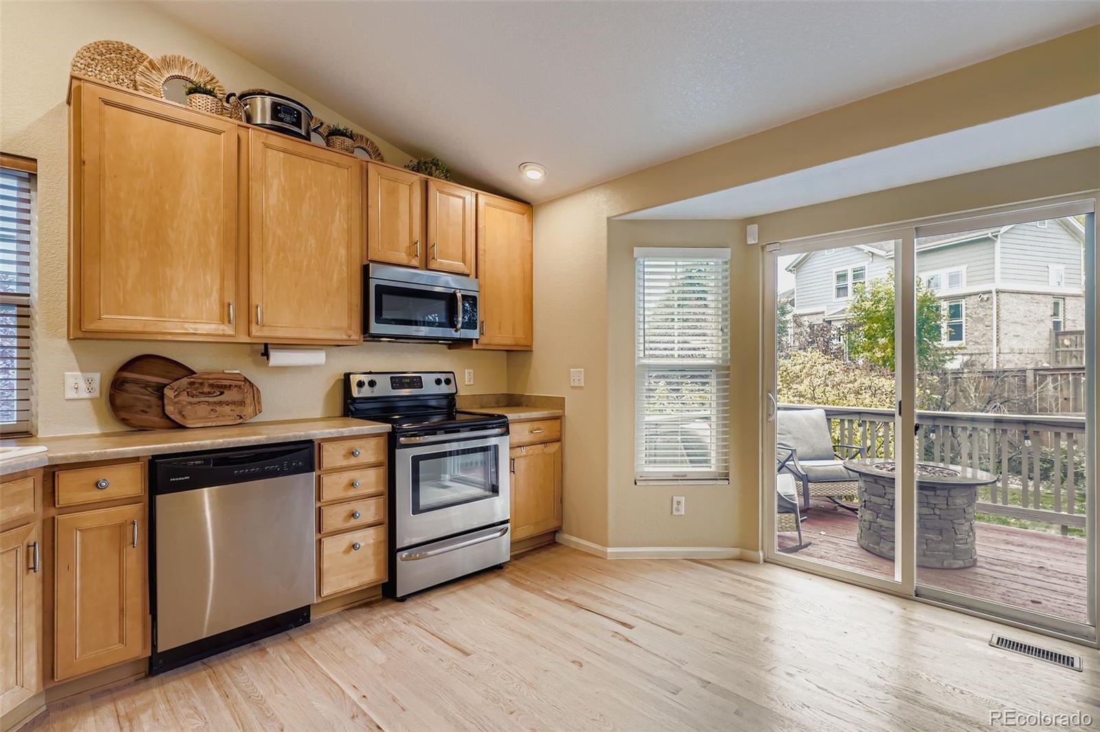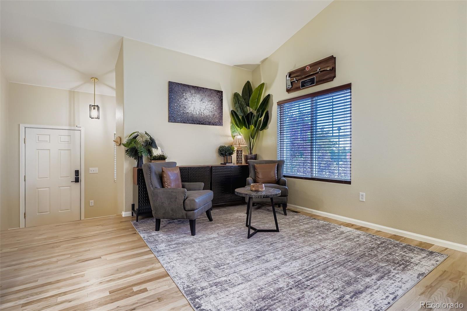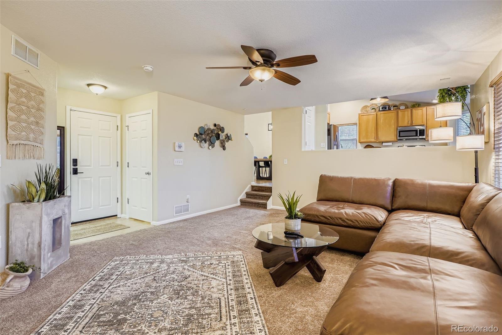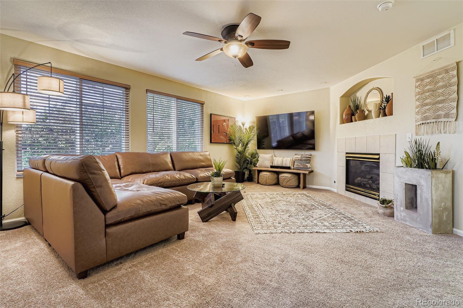 Welcome to The Conservatory! This beautifully updated 3-bedroom, 3-bath home offers comfort, space, and style throughout. Step inside to an inviting living and dining area with vaulted ceilings, abundant natural light, and high-end lighting fixtures. The spacious kitchen overlooks the family room and includes stainless steel appliances, generous counter space, and ample cabinetry for storage. A separate, oversized family room with a cozy fireplace provides the perfect place to relax or entertain. Throughout the home, you will find newly refinished real hardwood floors, newer carpet, and fresh interior paint. Major updates include a brand-new Class 4 impact-resistant roof (installed March 2025) and high-end double-pane windows designed for added insulation and efficiency. Upstairs, the primary suite includes a walk-in closet and private bath with room to spare for a king-sized bed. Two additional large bedrooms comfortably fit queen-sized beds and share a full bath. The unfinished basement offers plenty of potential for future expansion or storage. Step outside and enjoy nearby walking and biking trails at The Conservatory on the Plains, along with community amenities such as a pool, playground, and open green spaces. Conveniently located near E-470, DIA, shopping, and dining, this move-in-ready home is ready for its next owner.
