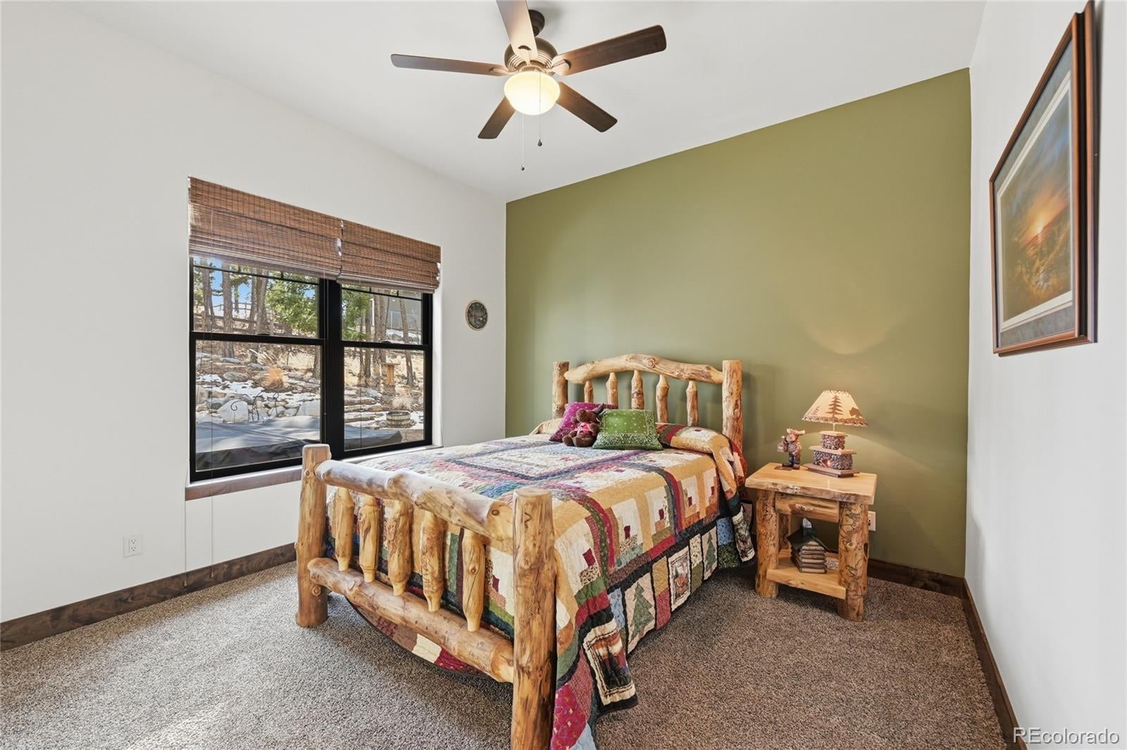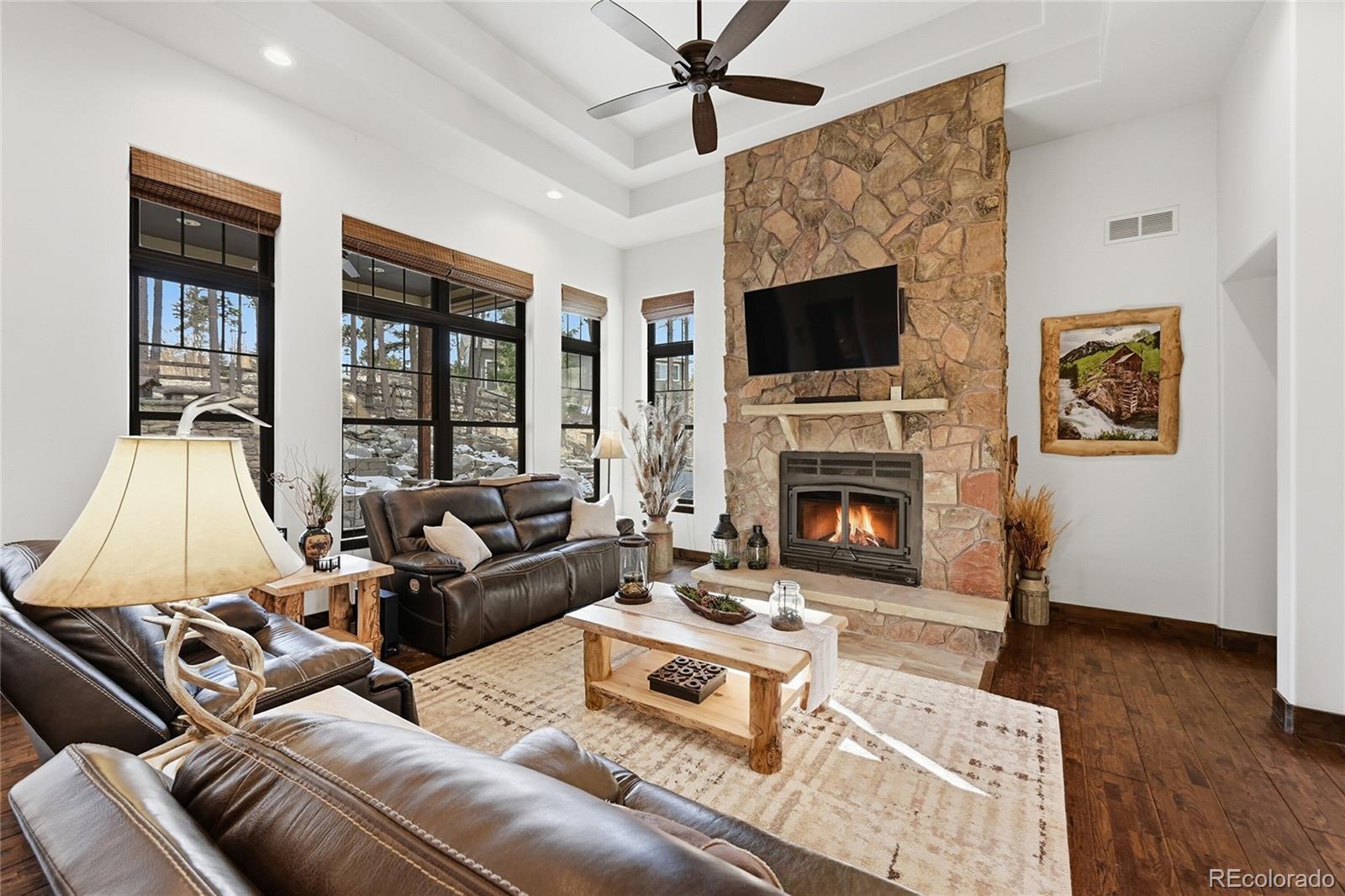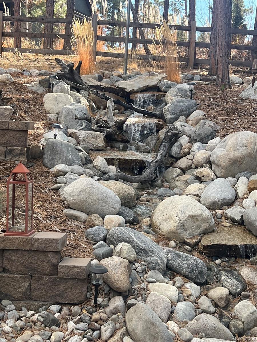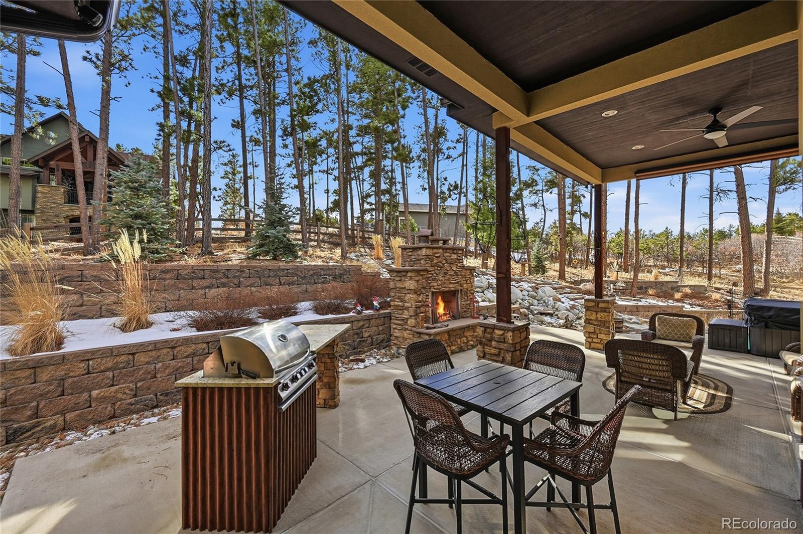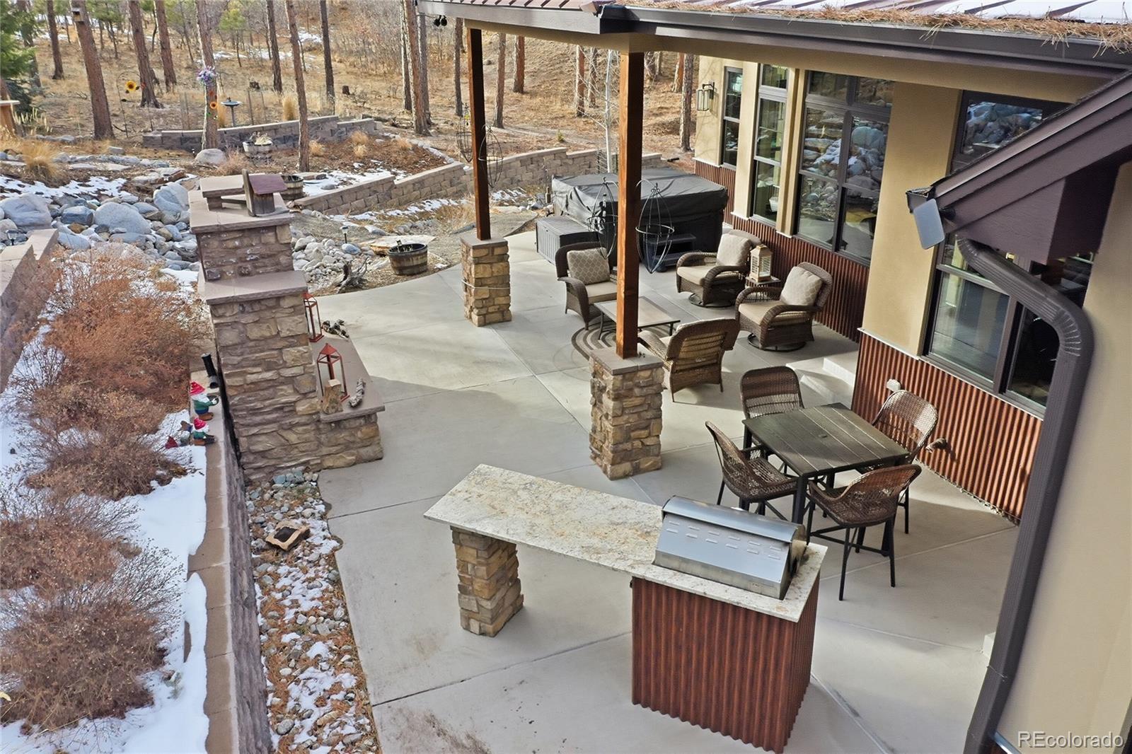 A must see nestled on nearly an acre in the picturesque mountain community of Larkspur, Colorado. This custom home has it all! From the expansive 6 car garage with RV door and 1/2 bath to the exceptional custom luxury residence offering beautifully finished living space. This home is designed for relaxation, comfort and entertaining. High ceilings, 8 ft doors, Rich knotty alder cabinetry, gas stove, upgraded appliances, large island with "leathered" granite countertops, expansive large-plank wood floors, and a dramatic oversized stone fireplace anchor the inviting main living area, creating a warm yet refined atmosphere throughout the home. The spacious primary suite is a true retreat, featuring private access to the back deck, a generous walk-in closet, and a stunning spa-inspired bathroom with radiant heated flooring. Two additional guest bedrooms share a well-appointed bathroom, offering both convenience and privacy. The fully finished, overly spacious walk-out basement expands the living space with a full bar, fourth bedroom, additional bathroom, and a dedicated office area—perfect for guests, multigenerational living, or working from home. Plus, more storage room than you can fill. Outdoor living is equally impressive, with over $75,000 in professional landscaping transforming the backyard into a private oasis. Enjoy year-round entertaining on the covered back patio with ceiling fan, built-in grill, outdoor fireplace, and hot tub area all while taking in the peaceful Colorado surroundings. This remarkable home seamlessly blends luxury finishes, thoughtful design, and exceptional indoor-outdoor living in one of Larkspur’s most desirable settings. Very close to Bear Dance Golf course