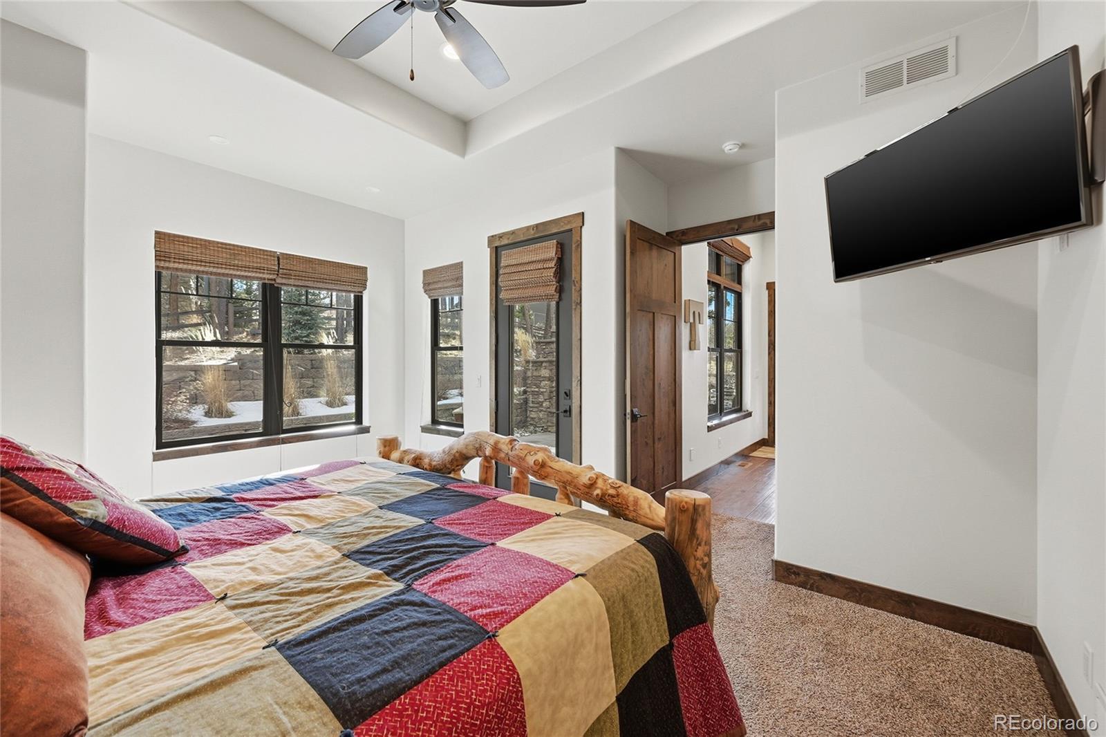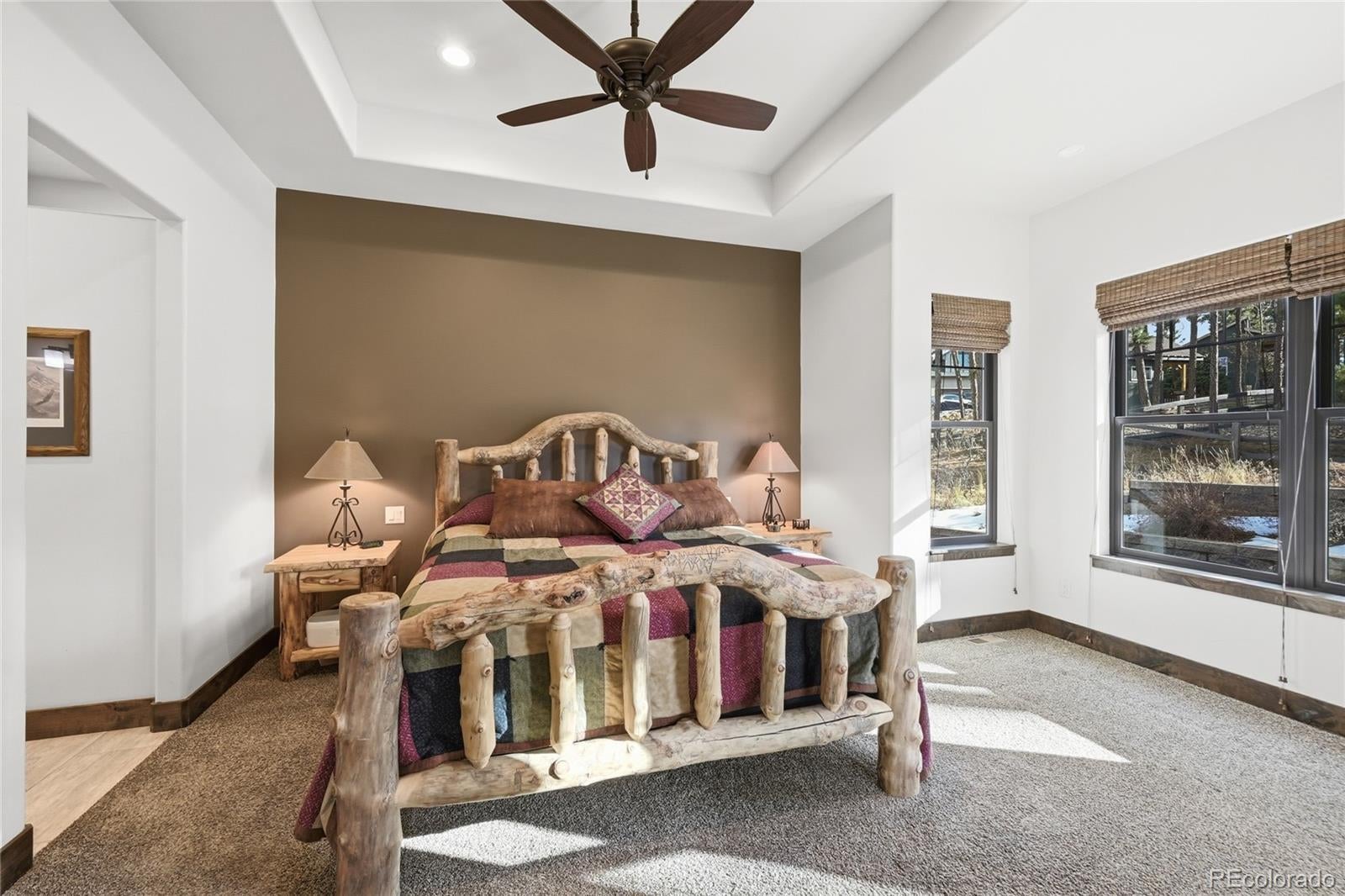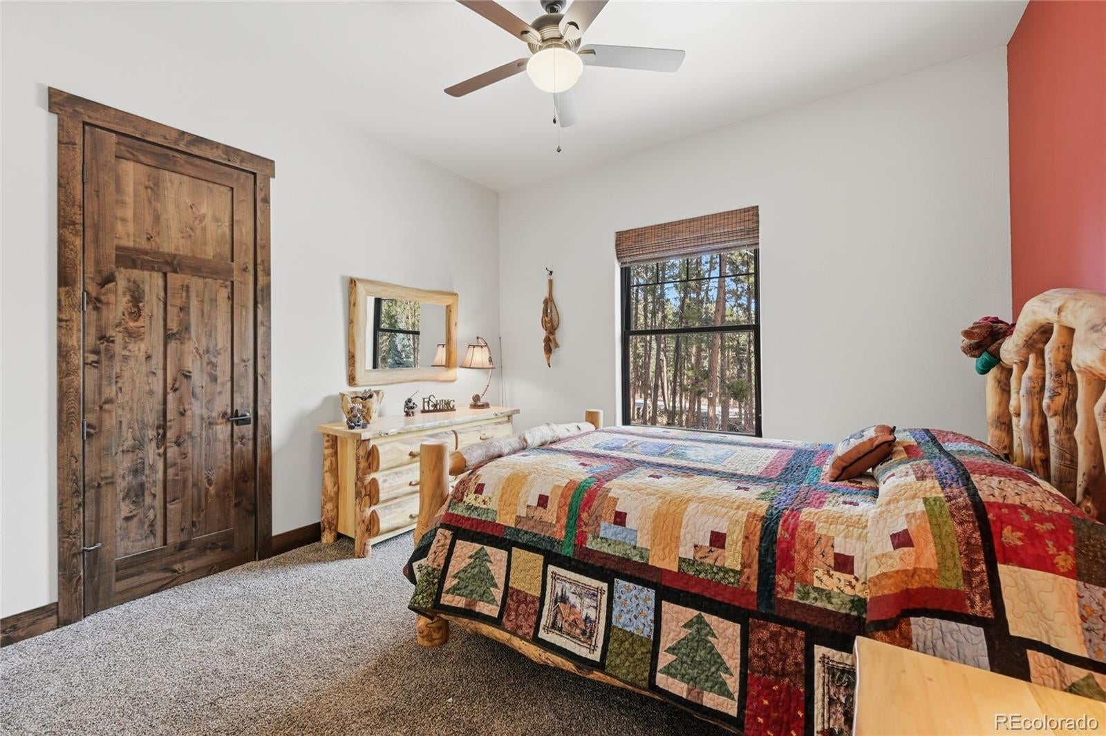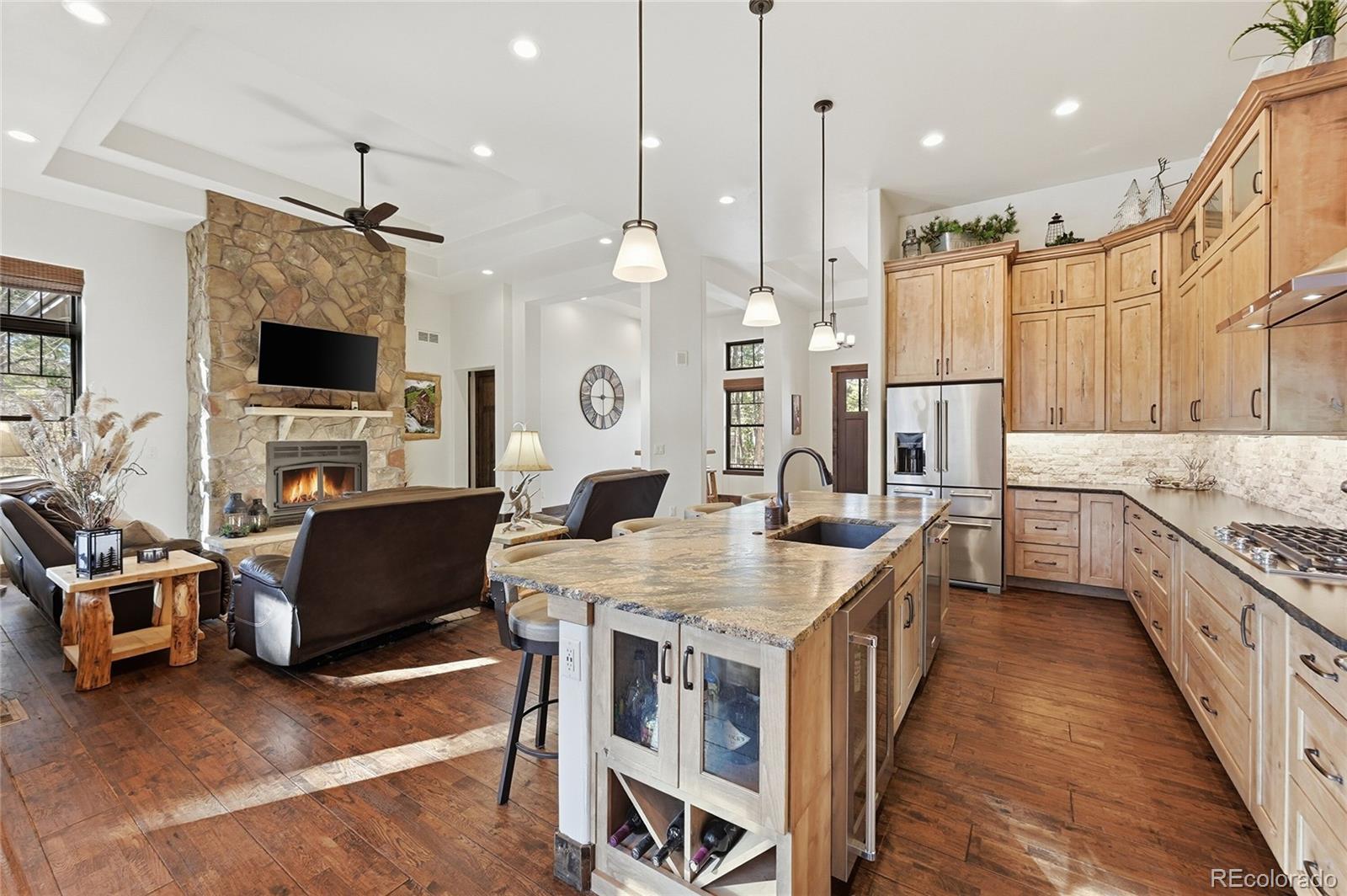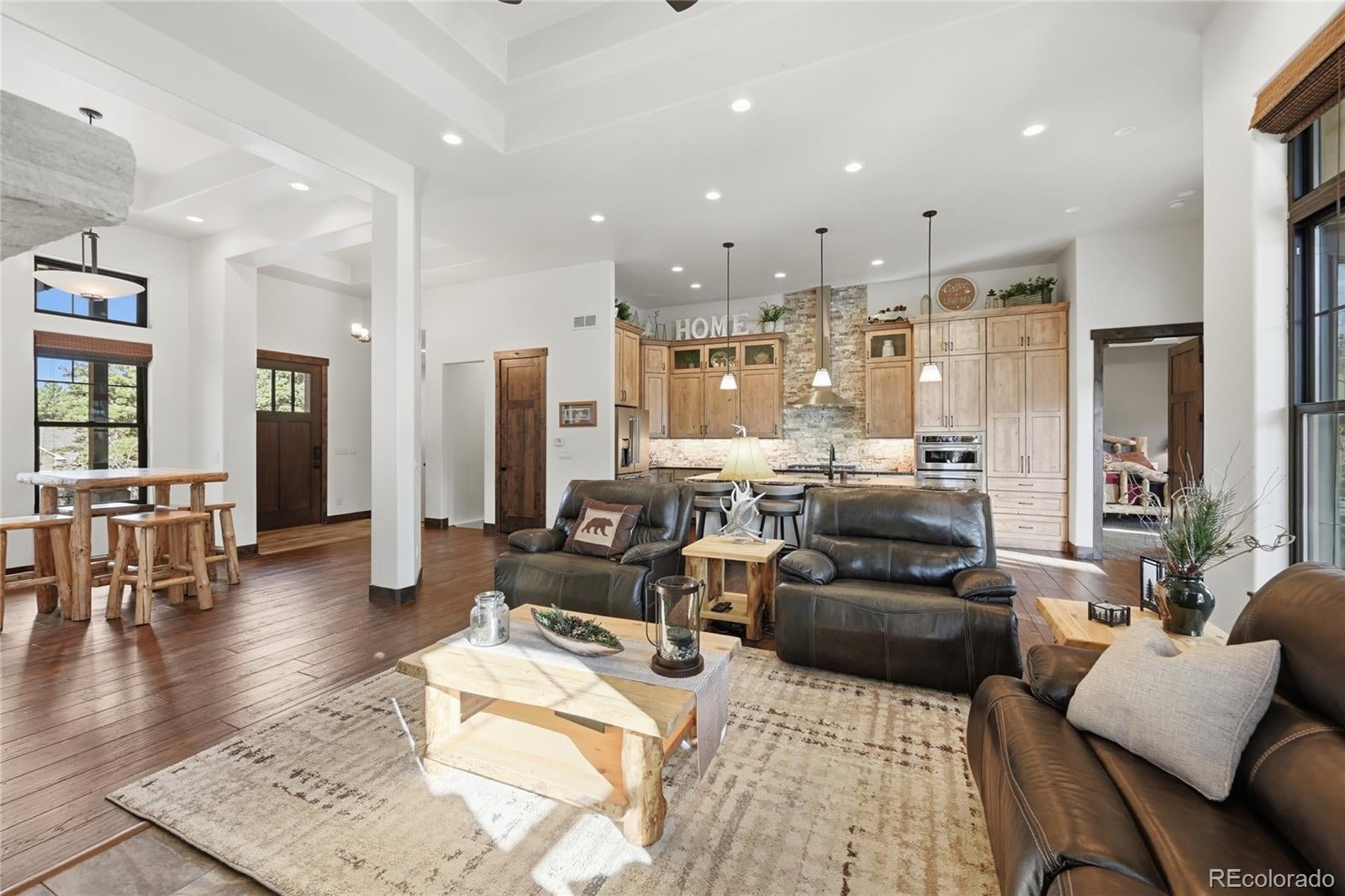 A must see nestled on nearly an acre in the picturesque mountain community of Larkspur, Colorado. This custom home has it all! From the expansive 6 car garage with RV door and 1/2 bath to the exceptional custom luxury residence offering beautifully finished living space. This home is designed for relaxation, comfort and entertaining. High ceilings, 8 ft doors, Rich knotty alder cabinetry, gas stove, upgraded appliances, large island with "leathered" granite countertops, expansive large-plank wood floors, and a dramatic oversized stone fireplace anchor the inviting main living area, creating a warm yet refined atmosphere throughout the home. The spacious primary suite is a true retreat, featuring private access to the back deck, a generous walk-in closet, and a stunning spa-inspired bathroom with radiant heated flooring. Two additional guest bedrooms share a well-appointed bathroom, offering both convenience and privacy. The fully finished, overly spacious walk-out basement expands the living space with a full bar, fourth bedroom, additional bathroom, and a dedicated office area—perfect for guests, multigenerational living, or working from home. Plus, more storage room than you can fill. Outdoor living is equally impressive, with over $75,000 in professional landscaping transforming the backyard into a private oasis. Enjoy year-round entertaining on the covered back patio with ceiling fan, built-in grill, outdoor fireplace, and hot tub area all while taking in the peaceful Colorado surroundings. This remarkable home seamlessly blends luxury finishes, thoughtful design, and exceptional indoor-outdoor living in one of Larkspur’s most desirable settings. Very close to Bear Dance Golf course