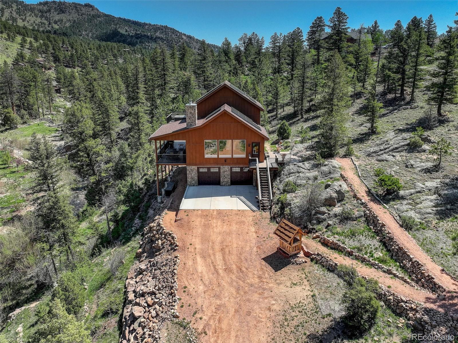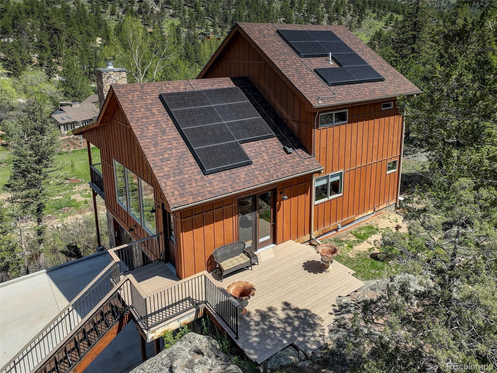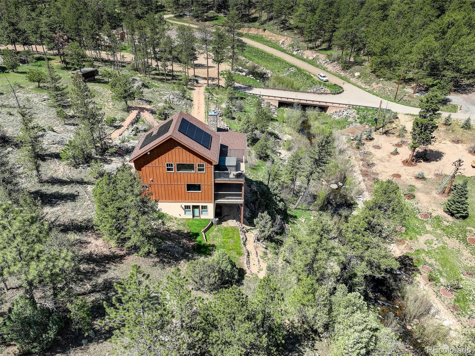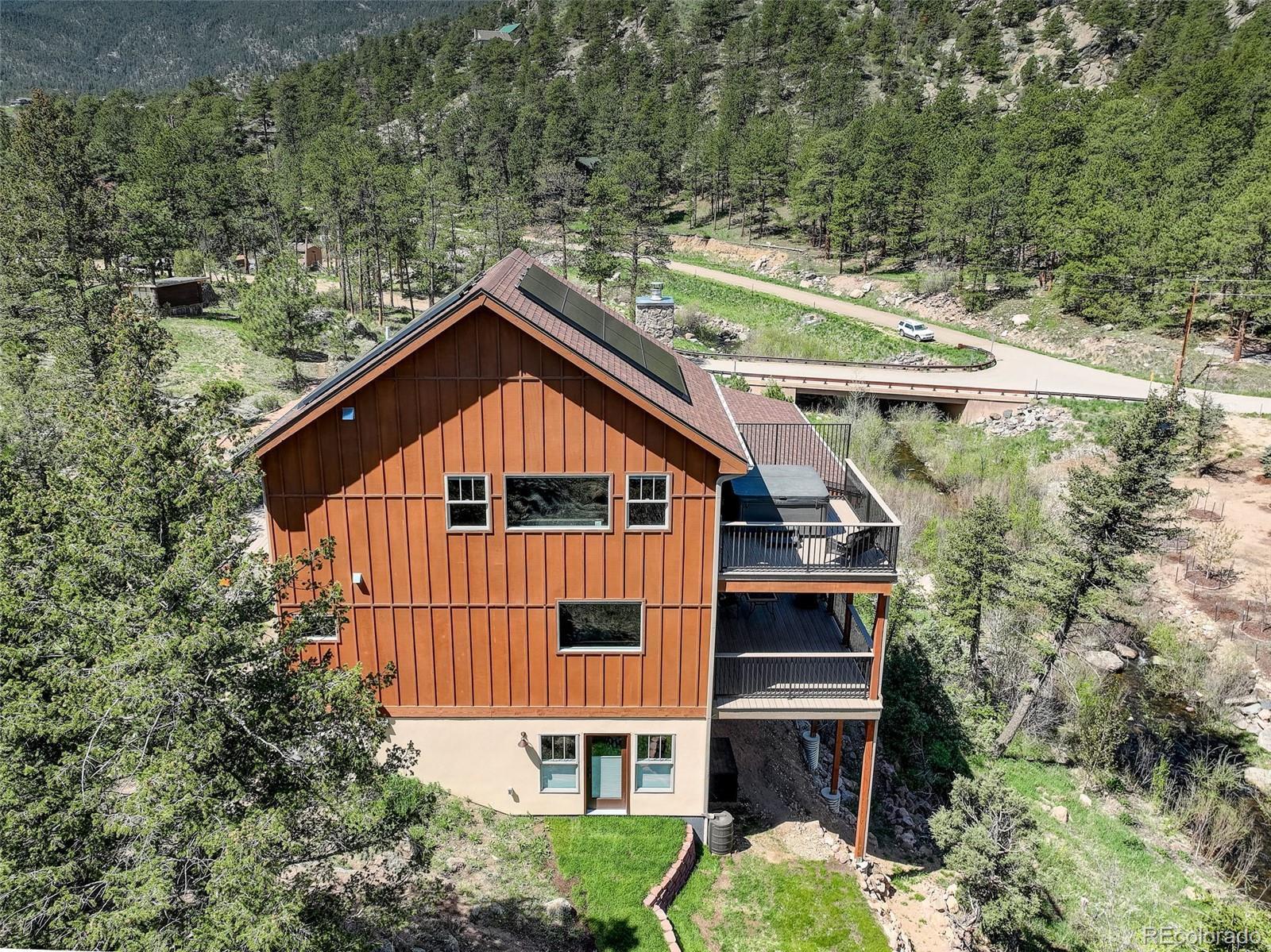 One-of-a-kind waterfront property! Step outside your new construction custom home & fish in the Little Thompson River. Stunning new estate in Pinewood Springs is a true haven, combining unrivaled elegance, seclusion, & exceptional craftsmanship. Set on 1.5 acres, enjoy access to Roosevelt National Forest. Enjoy scenic wildlife encounters & mountain views out every window. Upon entering, your eyes will be drawn to the hickory flooring that extends throughout the home. The gourmet kitchen boasts elegant alder cabinets, a copper hood & sink, dual ovens, & plenty of storage. The open floor plan guides you with effortless flow into the living area, where electronic blinds offer climate control for the windows that provide an abundance of natural light & unbeatable mountain views. Cozy wood fireplace with eye-catching floor-to-ceiling moss rock. Designed for exceptional indoor-outdoor living, the expansive, no-maintenance covered deck offers a private setting for dining & entertaining, all while enjoying the soothing sounds of the flowing river. Upstairs, the secluded primary suite commands tremendous views & features a private patio with a hot tub, the perfect place to savor mountain living at nightfall, gazing at the stars. A sumptuous bath has a generously sized shower, copper sinks, & deep walk-in closet providing plenty of storage space. A secondary bedroom on the main level has deck access & an ensuite bath. Bedroom on the lower level has walk-out access to the river. Oversized garage & south-facing driveway top off the ideal home! Fire-resistant siding offers peace of mind, & you'll love the energy-saving benefits of the solar panels & the passive solar design of the house. A 120 sq ft greenhouse provides the garden hobbyist a nice place to bloom. This luxury retreat is an ideal opportunity for the discerning buyer looking for tranquility & privacy in an ideal location between Estes Park & Lyons, only 35 min from Boulder, 35 min to Longmont, & 45 min to Loveland.