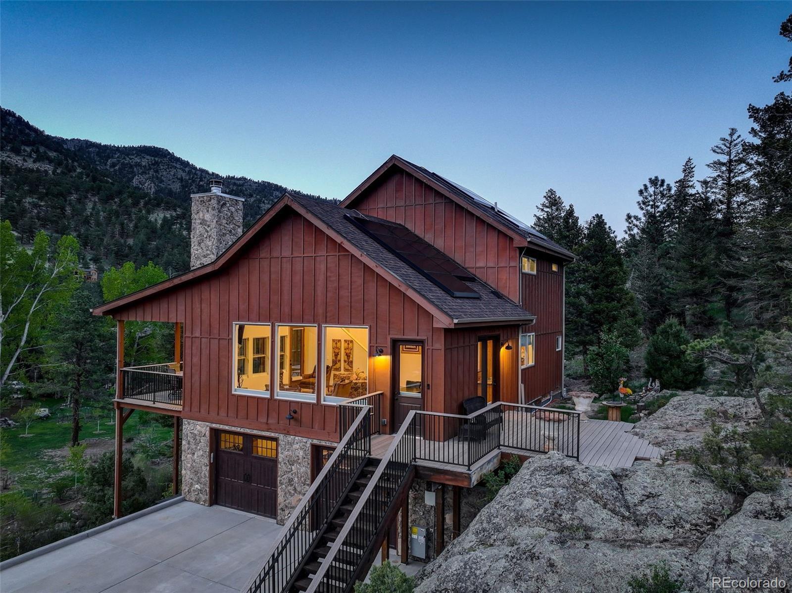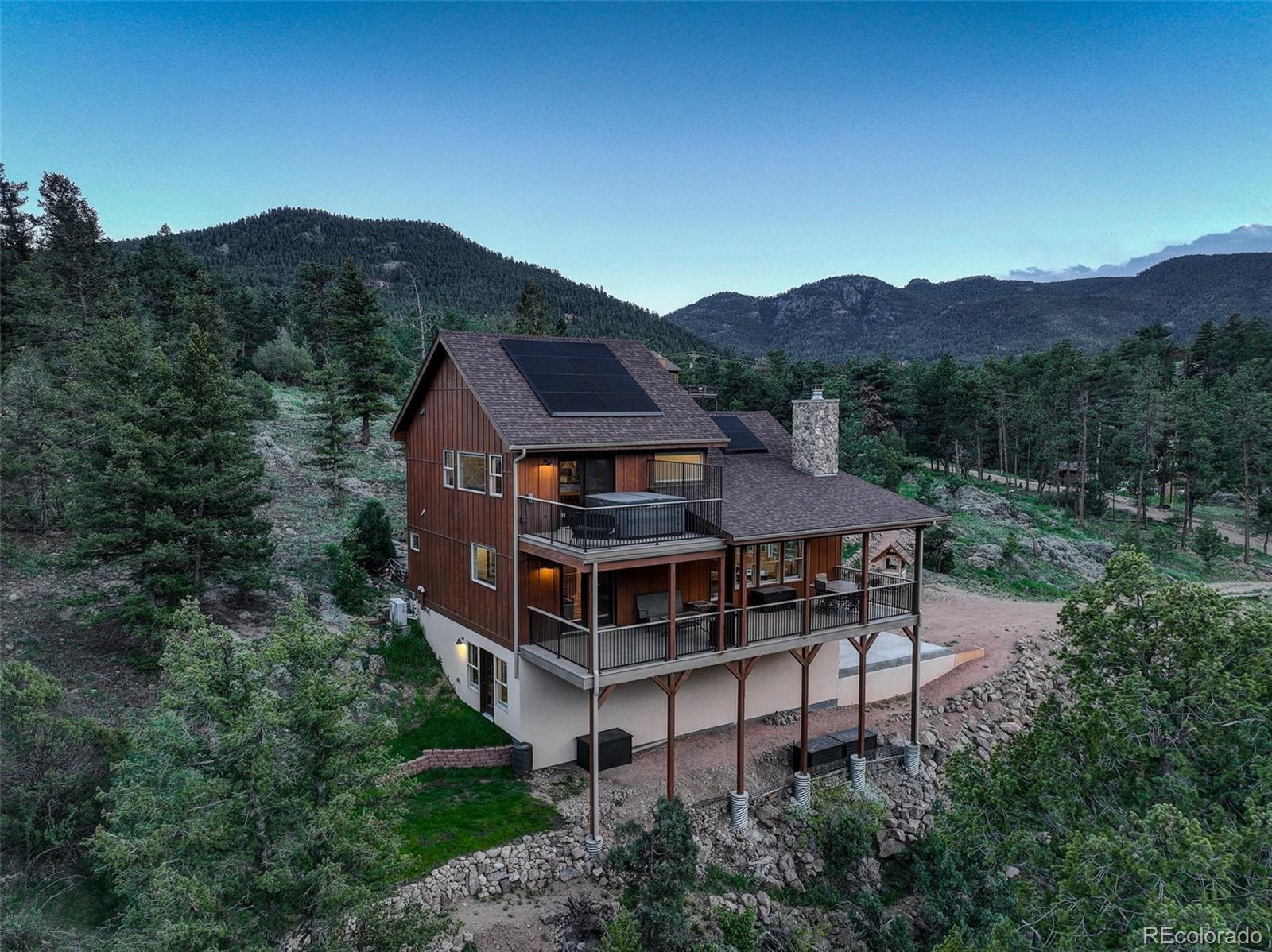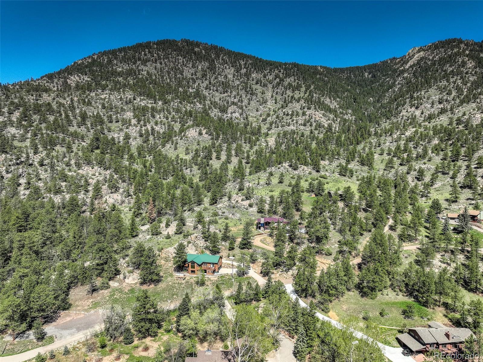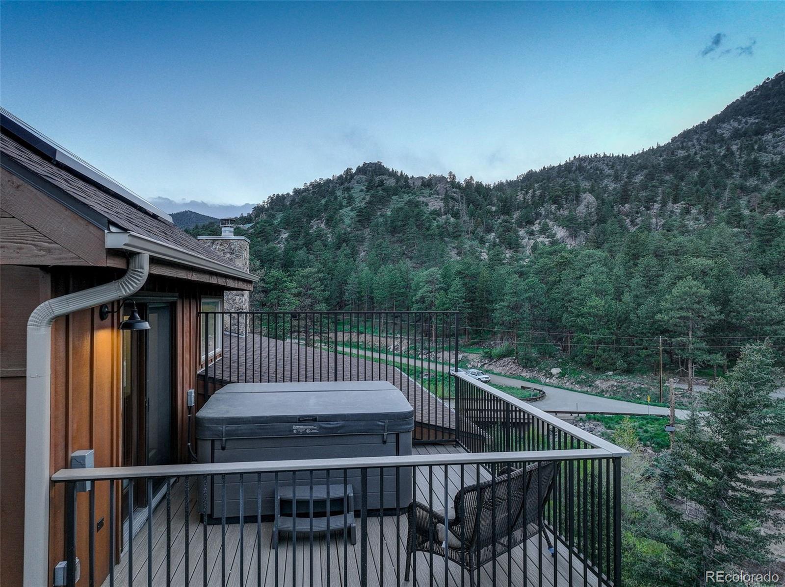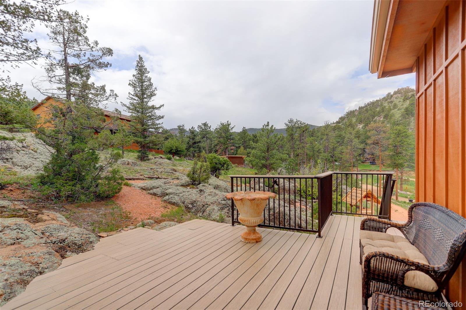 One-of-a-kind waterfront property! Step outside your new construction custom home & fish in the Little Thompson River. Stunning new estate in Pinewood Springs is a true haven, combining unrivaled elegance, seclusion, & exceptional craftsmanship. Set on 1.5 acres, enjoy access to Roosevelt National Forest. Enjoy scenic wildlife encounters & mountain views out every window. Upon entering, your eyes will be drawn to the hickory flooring that extends throughout the home. The gourmet kitchen boasts elegant alder cabinets, a copper hood & sink, dual ovens, & plenty of storage. The open floor plan guides you with effortless flow into the living area, where electronic blinds offer climate control for the windows that provide an abundance of natural light & unbeatable mountain views. Cozy wood fireplace with eye-catching floor-to-ceiling moss rock. Designed for exceptional indoor-outdoor living, the expansive, no-maintenance covered deck offers a private setting for dining & entertaining, all while enjoying the soothing sounds of the flowing river. Upstairs, the secluded primary suite commands tremendous views & features a private patio with a hot tub, the perfect place to savor mountain living at nightfall, gazing at the stars. A sumptuous bath has a generously sized shower, copper sinks, & deep walk-in closet providing plenty of storage space. A secondary bedroom on the main level has deck access & an ensuite bath. Bedroom on the lower level has walk-out access to the river. Oversized garage & south-facing driveway top off the ideal home! Fire-resistant siding offers peace of mind, & you'll love the energy-saving benefits of the solar panels & the passive solar design of the house. A 120 sq ft greenhouse provides the garden hobbyist a nice place to bloom. This luxury retreat is an ideal opportunity for the discerning buyer looking for tranquility & privacy in an ideal location between Estes Park & Lyons, only 35 min from Boulder, 35 min to Longmont, & 45 min to Loveland.