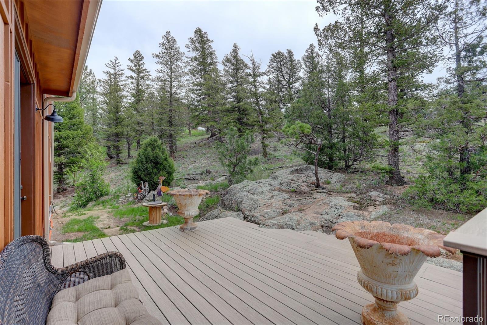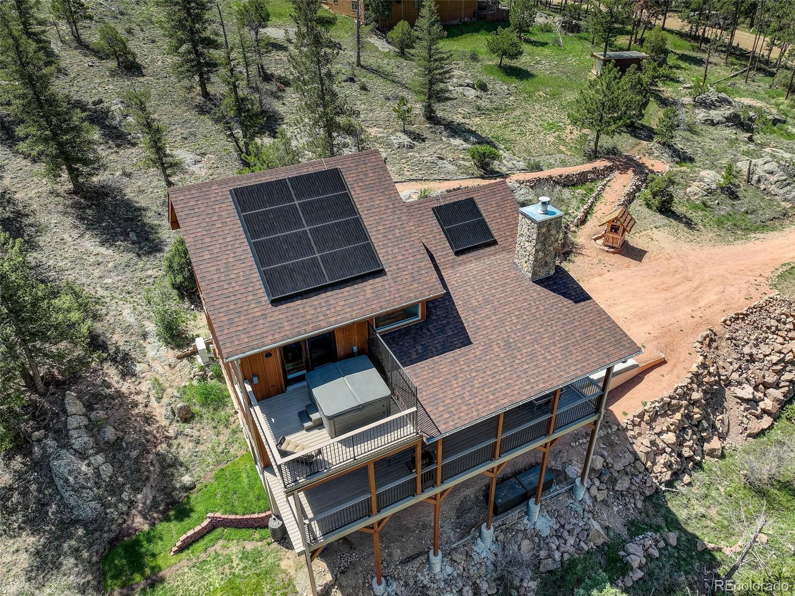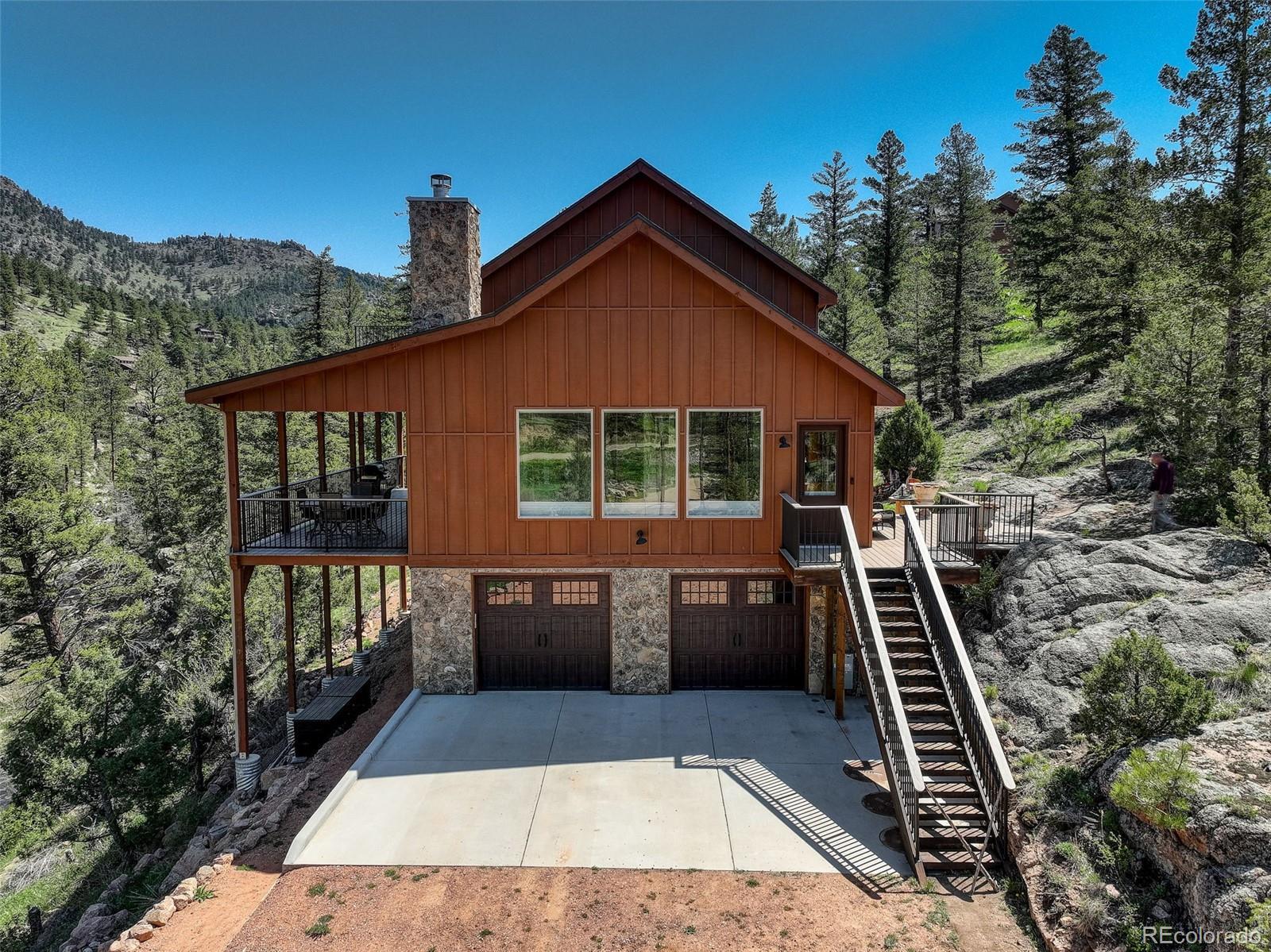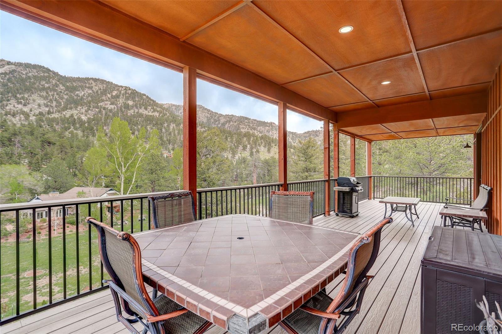 One-of-a-kind waterfront property! Step outside your new construction custom home & fish in the Little Thompson River. Stunning new estate in Pinewood Springs is a true haven, combining unrivaled elegance, seclusion, & exceptional craftsmanship. Set on 1.5 acres, enjoy access to Roosevelt National Forest. Enjoy scenic wildlife encounters & mountain views out every window. Upon entering, your eyes will be drawn to the hickory flooring that extends throughout the home. The gourmet kitchen boasts elegant alder cabinets, a copper hood & sink, dual ovens, & plenty of storage. The open floor plan guides you with effortless flow into the living area, where electronic blinds offer climate control for the windows that provide an abundance of natural light & unbeatable mountain views. Cozy wood fireplace with eye-catching floor-to-ceiling moss rock. Designed for exceptional indoor-outdoor living, the expansive, no-maintenance covered deck offers a private setting for dining & entertaining, all while enjoying the soothing sounds of the flowing river. Upstairs, the secluded primary suite commands tremendous views & features a private patio with a hot tub, the perfect place to savor mountain living at nightfall, gazing at the stars. A sumptuous bath has a generously sized shower, copper sinks, & deep walk-in closet providing plenty of storage space. A secondary bedroom on the main level has deck access & an ensuite bath. Bedroom on the lower level has walk-out access to the river. Oversized garage & south-facing driveway top off the ideal home! Fire-resistant siding offers peace of mind, & you'll love the energy-saving benefits of the solar panels & the passive solar design of the house. A 120 sq ft greenhouse provides the garden hobbyist a nice place to bloom. This luxury retreat is an ideal opportunity for the discerning buyer looking for tranquility & privacy in an ideal location between Estes Park & Lyons, only 35 min from Boulder, 35 min to Longmont, & 45 min to Loveland.