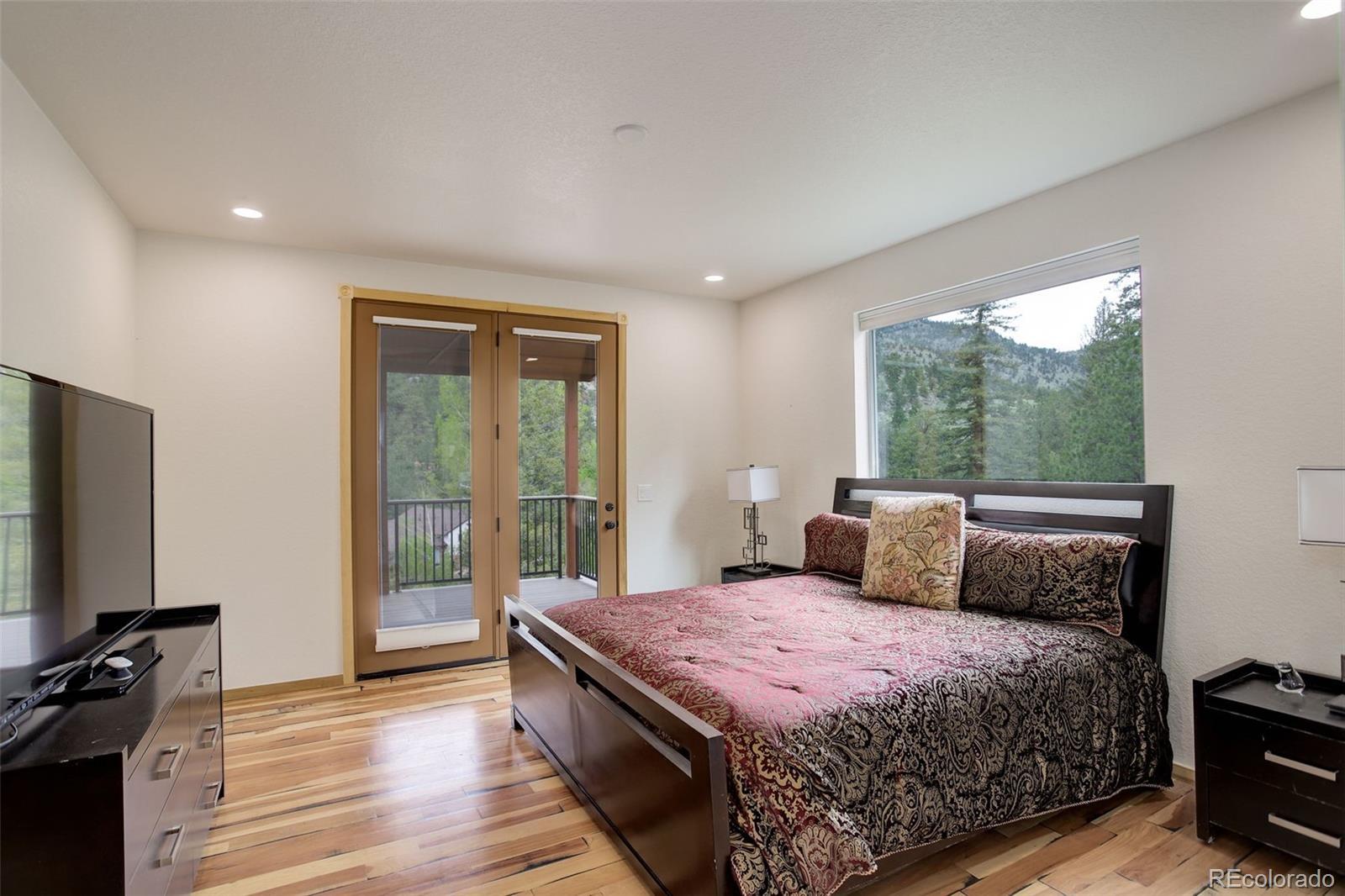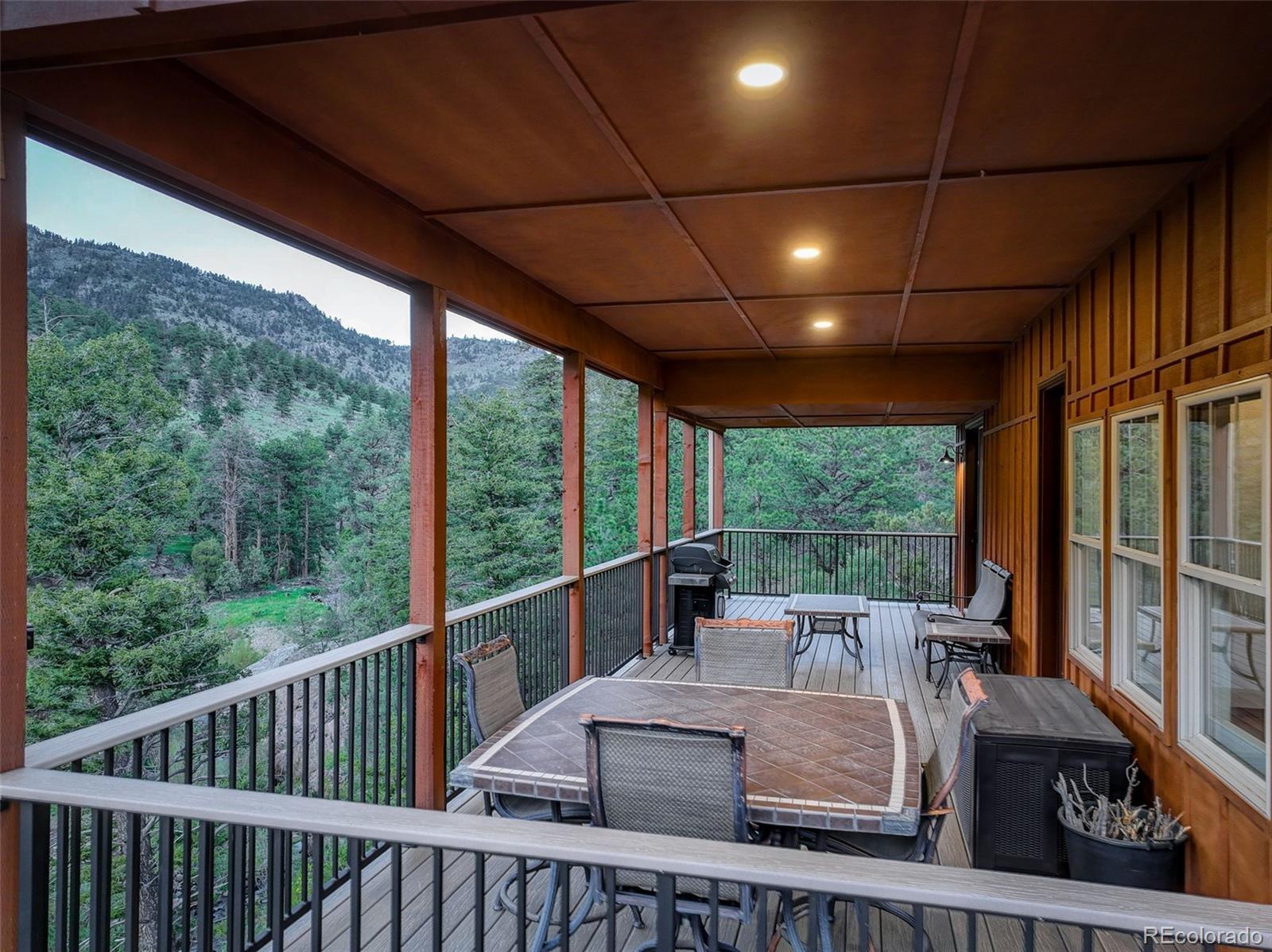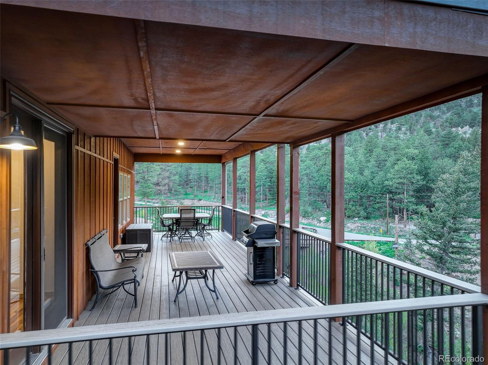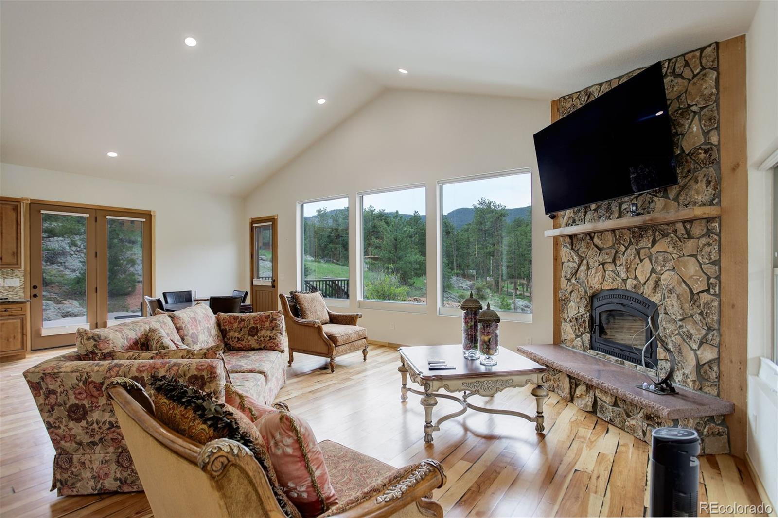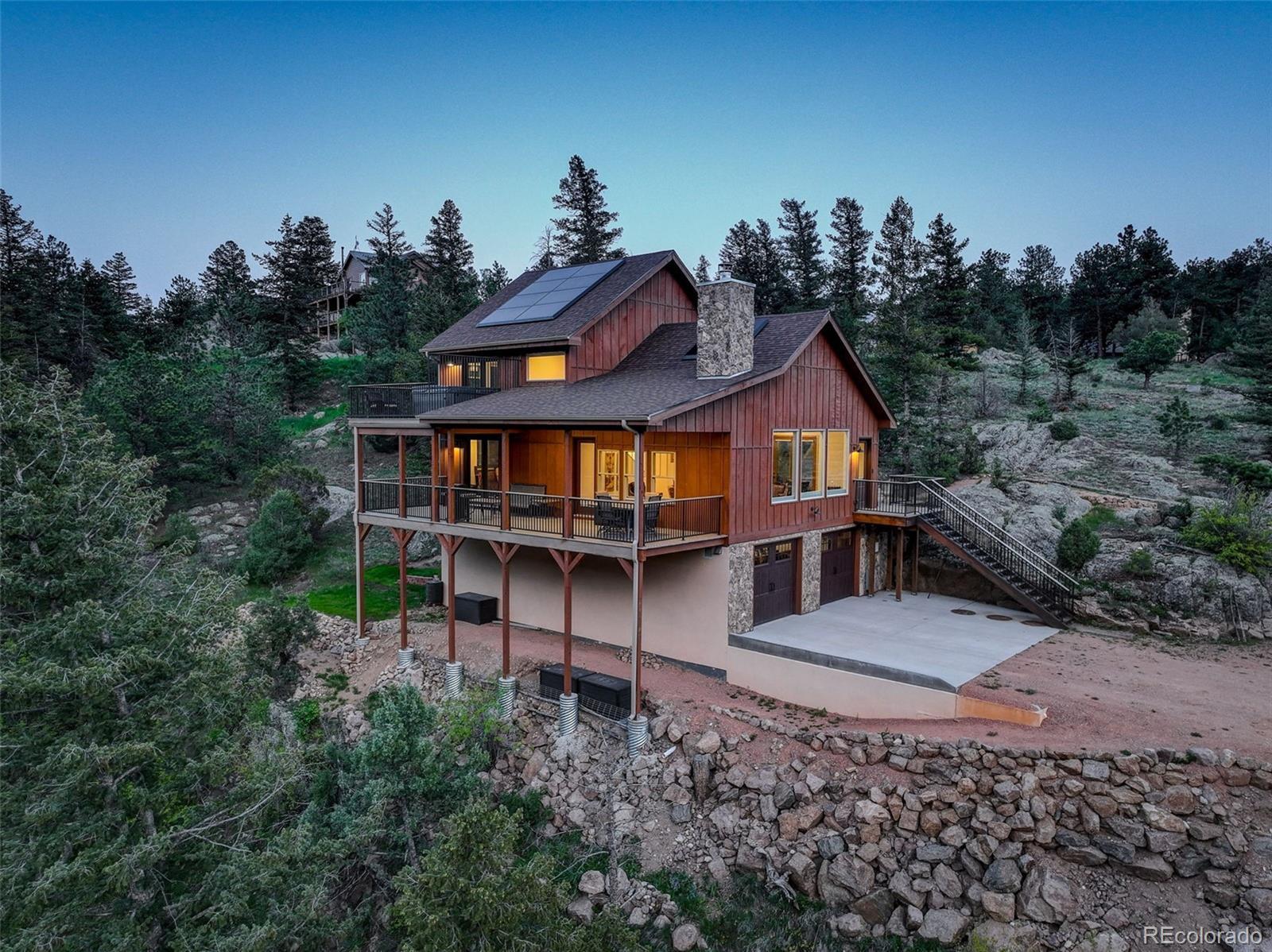 One-of-a-kind waterfront property! Step outside your new construction custom home & fish in the Little Thompson River. Stunning new estate in Pinewood Springs is a true haven, combining unrivaled elegance, seclusion, & exceptional craftsmanship. Set on 1.5 acres, enjoy access to Roosevelt National Forest. Enjoy scenic wildlife encounters & mountain views out every window. Upon entering, your eyes will be drawn to the hickory flooring that extends throughout the home. The gourmet kitchen boasts elegant alder cabinets, a copper hood & sink, dual ovens, & plenty of storage. The open floor plan guides you with effortless flow into the living area, where electronic blinds offer climate control for the windows that provide an abundance of natural light & unbeatable mountain views. Cozy wood fireplace with eye-catching floor-to-ceiling moss rock. Designed for exceptional indoor-outdoor living, the expansive, no-maintenance covered deck offers a private setting for dining & entertaining, all while enjoying the soothing sounds of the flowing river. Upstairs, the secluded primary suite commands tremendous views & features a private patio with a hot tub, the perfect place to savor mountain living at nightfall, gazing at the stars. A sumptuous bath has a generously sized shower, copper sinks, & deep walk-in closet providing plenty of storage space. A secondary bedroom on the main level has deck access & an ensuite bath. Bedroom on the lower level has walk-out access to the river. Oversized garage & south-facing driveway top off the ideal home! Fire-resistant siding offers peace of mind, & you'll love the energy-saving benefits of the solar panels & the passive solar design of the house. A 120 sq ft greenhouse provides the garden hobbyist a nice place to bloom. This luxury retreat is an ideal opportunity for the discerning buyer looking for tranquility & privacy in an ideal location between Estes Park & Lyons, only 35 min from Boulder, 35 min to Longmont, & 45 min to Loveland.