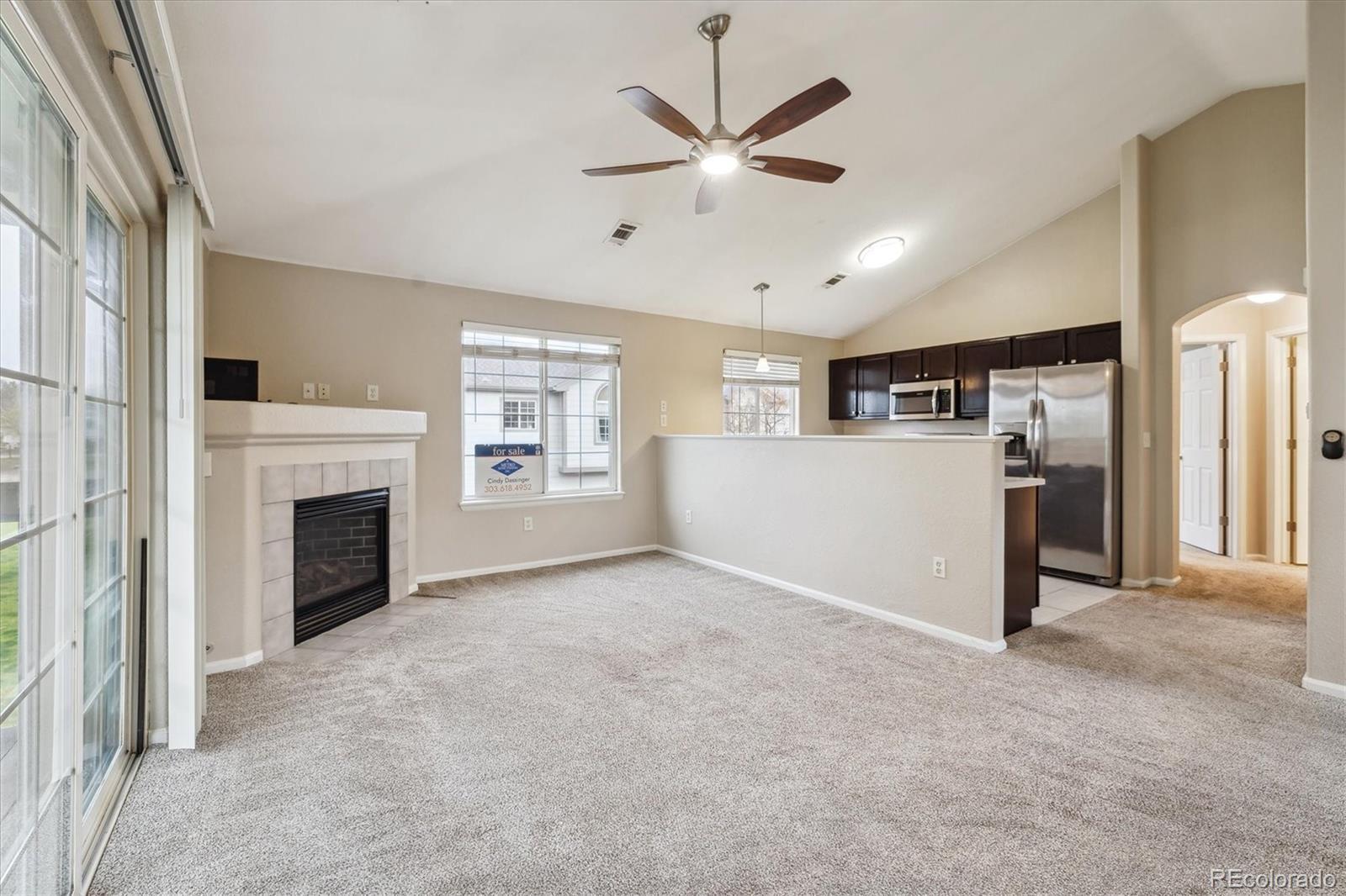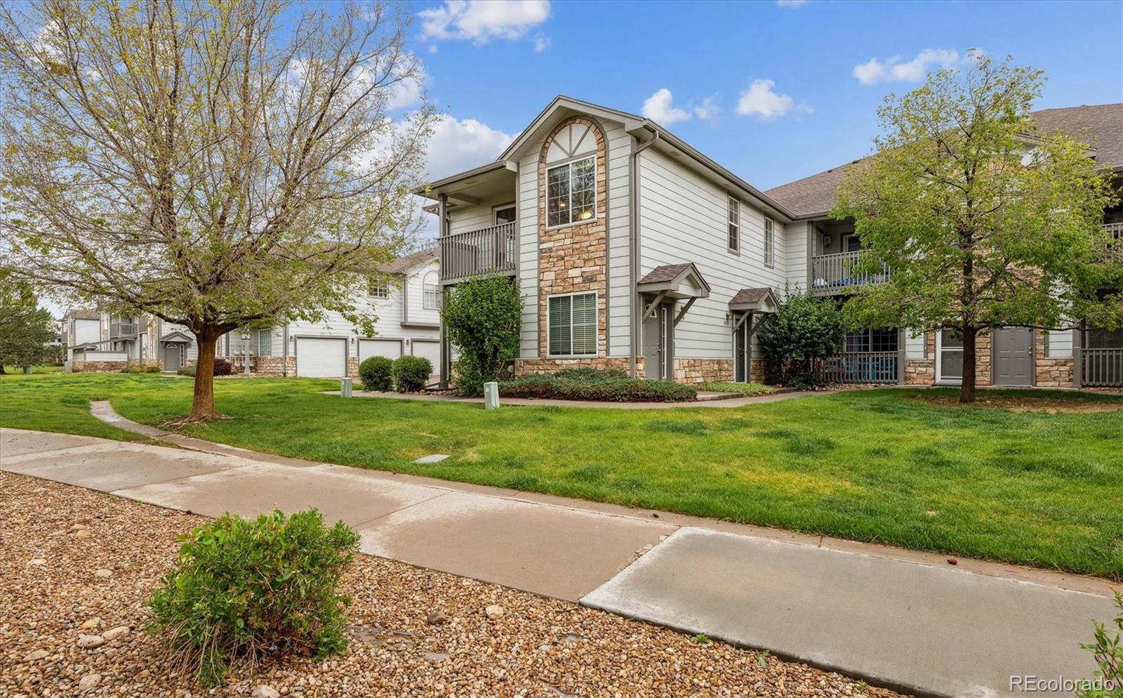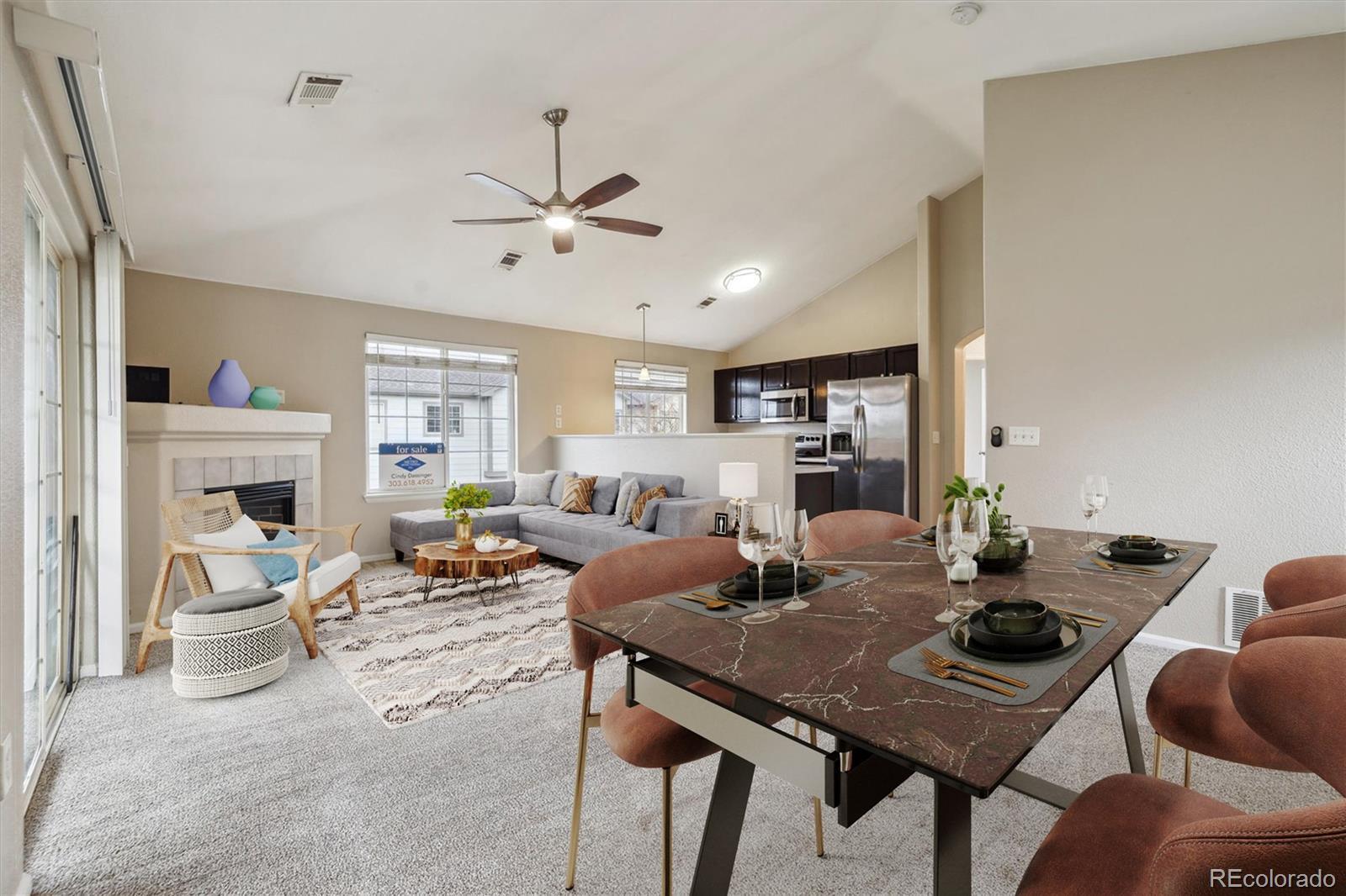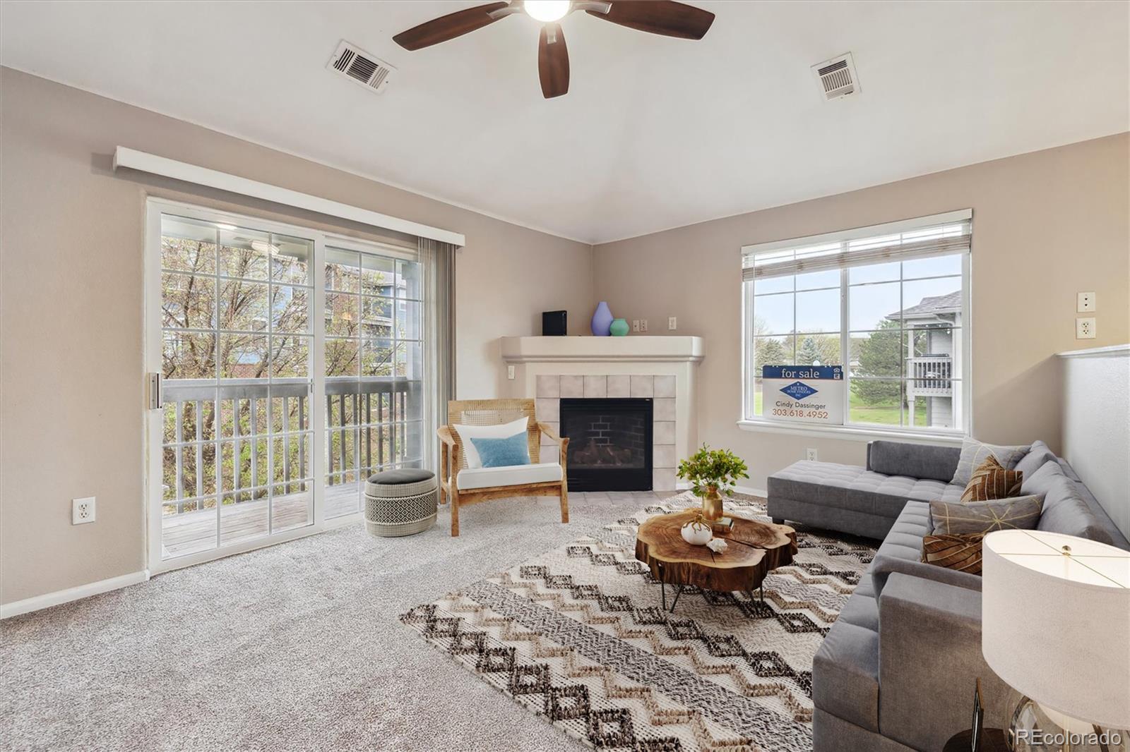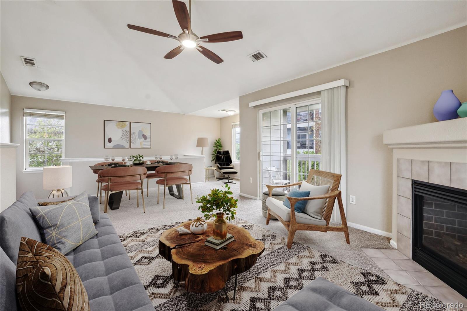 Welcome to this spacious and inviting 1-bedroom condo in a gated community! With 906 sq. ft. of thoughtfully designed living space, this home offers the ideal balance of comfort and functionality. The open layout features vaulted ceilings, a cozy fireplace, and abundant natural light, creating a warm and welcoming atmosphere. The kitchen has stainless steel appliances, ample counter space, and plenty of cabinetry—great for everyday cooking or entertaining. A separate laundry area adds convenience, while the large bedroom easily fits a king-size bed and includes a walk-in closet. Working from home? There’s plenty of room in the open-concept living and dining area to create a dedicated workspace without sacrificing comfort. Step out to your private balcony and enjoy serene views overlooking the grassy community park and basketball court. Additional features include central A/C, a refinished tub and tile, an attached 1-car garage, and an additional reserved parking space. This well-kept community offers fantastic amenities—clubhouse, fitness center, pool, and hot tub—plus an unbeatable location. You’re just minutes from the light rail, shopping, dining, and parks, with Riverdale Open Space and Carpenter Recreation Center nearby for outdoor adventures.Don’t miss this opportunity to own a home that combines space, convenience, and value in one of Thornton’s most desirable neighborhoods!