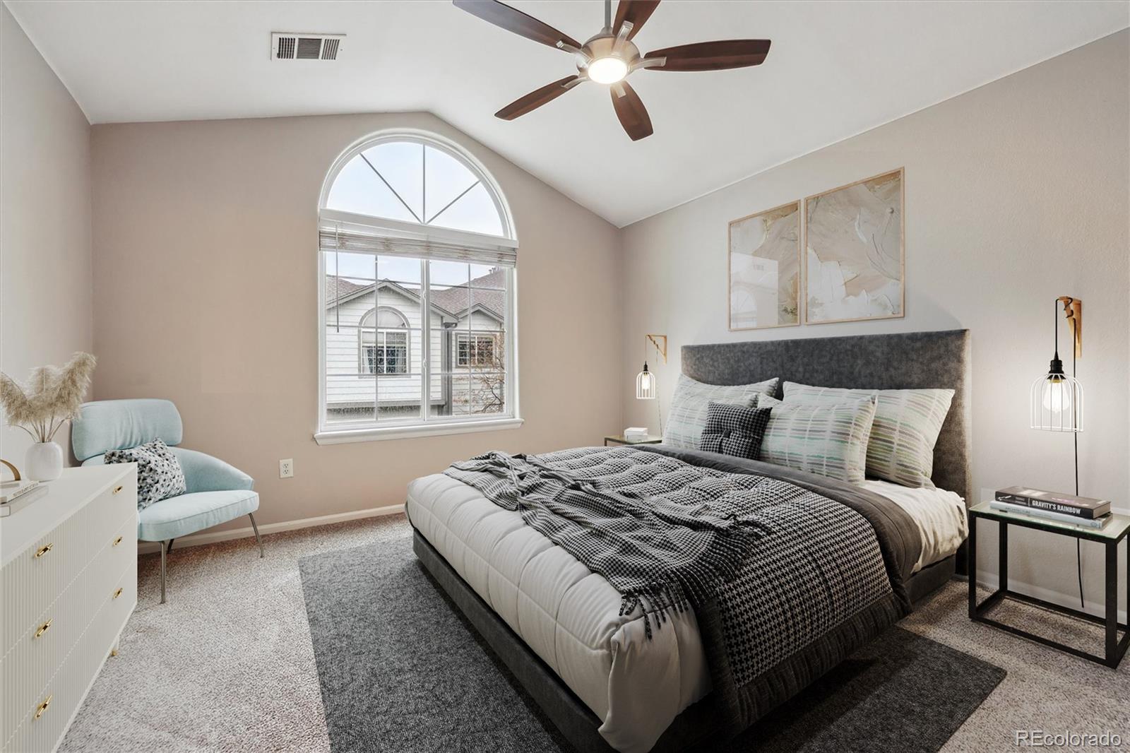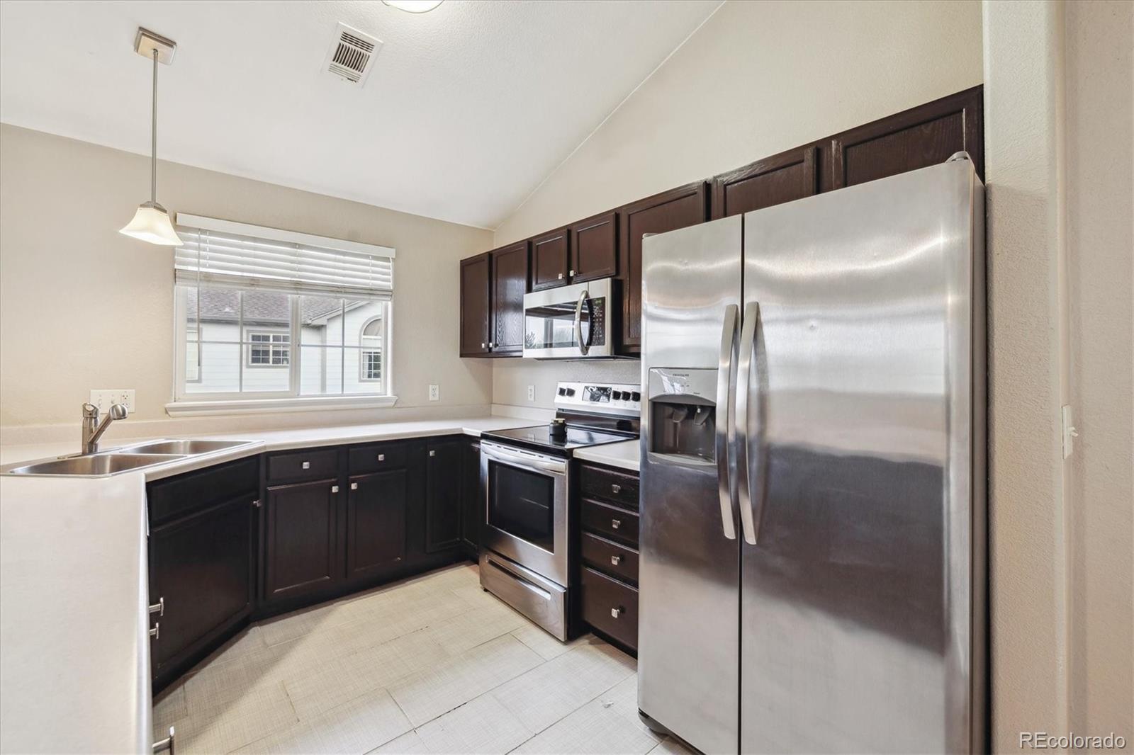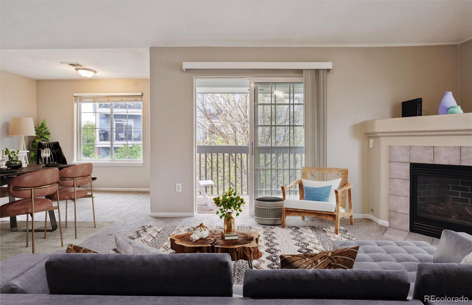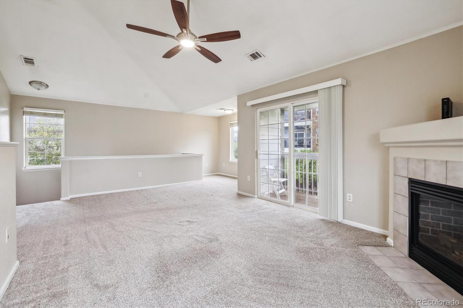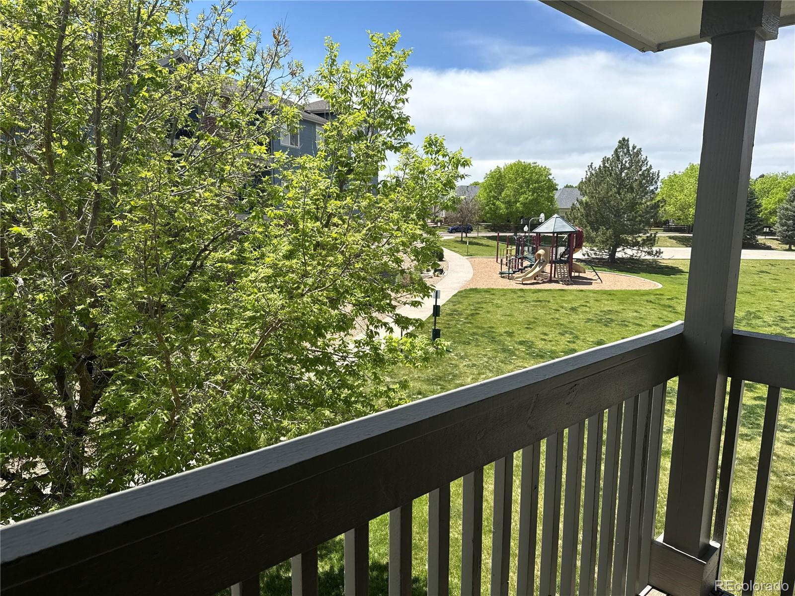 Welcome to this spacious and inviting 1-bedroom condo in a gated community! With 906 sq. ft. of thoughtfully designed living space, this home offers the ideal balance of comfort and functionality. The open layout features vaulted ceilings, a cozy fireplace, and abundant natural light, creating a warm and welcoming atmosphere. The kitchen has stainless steel appliances, ample counter space, and plenty of cabinetry—great for everyday cooking or entertaining. A separate laundry area adds convenience, while the large bedroom easily fits a king-size bed and includes a walk-in closet. Working from home? There’s plenty of room in the open-concept living and dining area to create a dedicated workspace without sacrificing comfort. Step out to your private balcony and enjoy serene views overlooking the grassy community park and basketball court. Additional features include central A/C, a refinished tub and tile, an attached 1-car garage, and an additional reserved parking space. This well-kept community offers fantastic amenities—clubhouse, fitness center, pool, and hot tub—plus an unbeatable location. You’re just minutes from the light rail, shopping, dining, and parks, with Riverdale Open Space and Carpenter Recreation Center nearby for outdoor adventures.Don’t miss this opportunity to own a home that combines space, convenience, and value in one of Thornton’s most desirable neighborhoods!