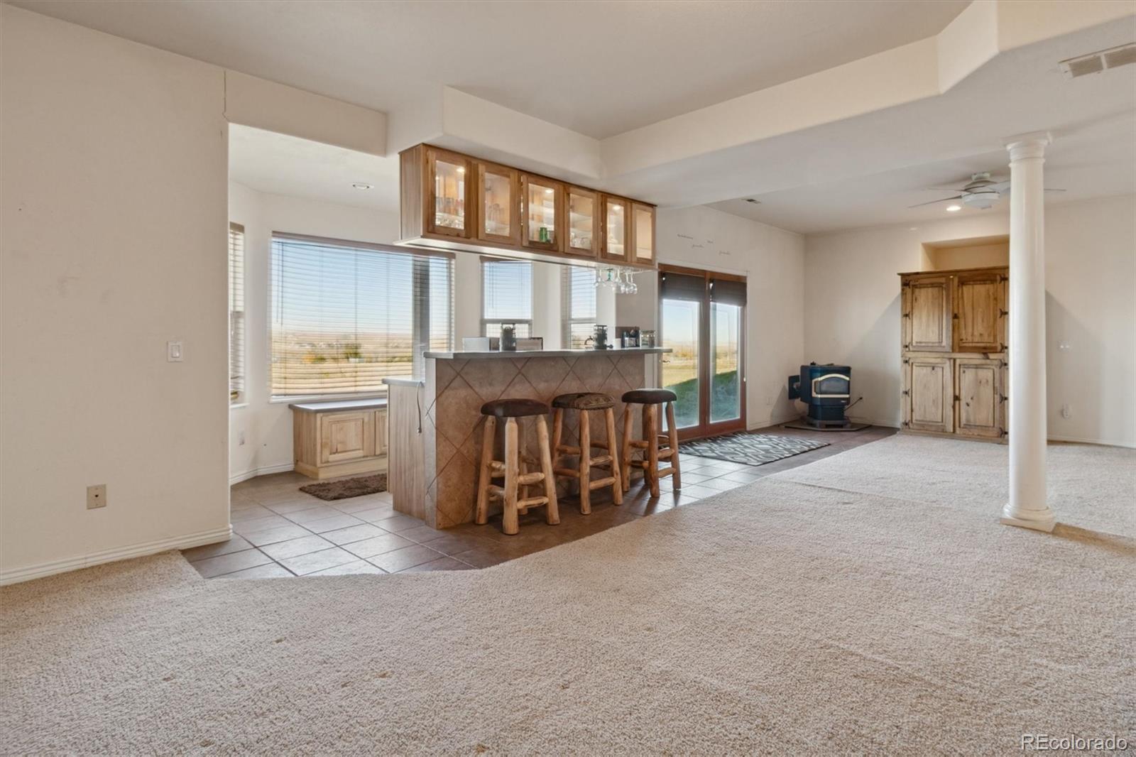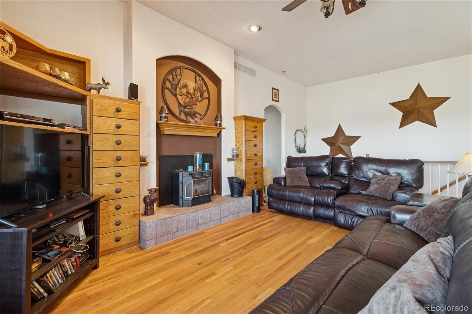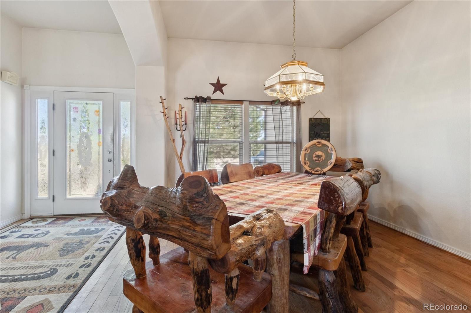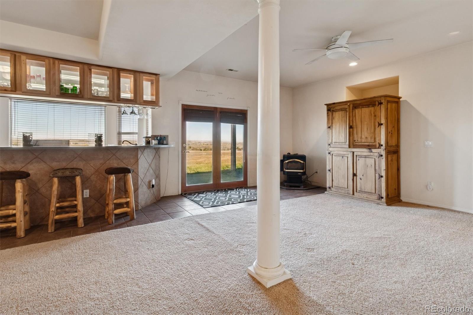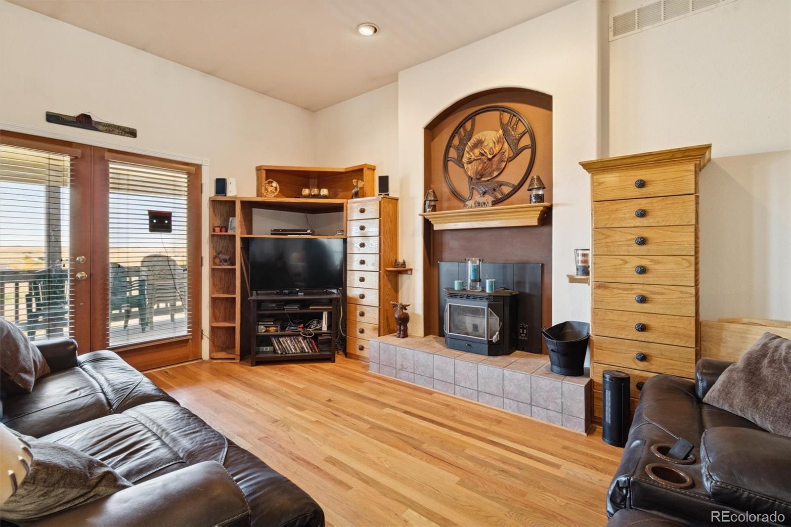 Welcome to the country life! This lovely, open floorplan home has hardwood floors throughout the main level living areas and in the primary suite with 12' high ceilings and TONS of windows that really bring the beauty of the country inside. Situated on almost 35 acres with NO HOA, the opportunities are endless - bring your livestock, horses, toys, you name it! This ranch home with a fully finished walkout basement has plenty of room for everybody. There are 3 bedrooms and 2 bathrooms on the main level plus your large kitchen with eat-in dining area and island with built-in seating, the main living room with a pellet stove fireplace, as well as a beautiful formal dining room and spacious office with a custom, built-in desk. In the basement, you will find another bedroom and a full bathroom with a steam-sauna shower that has audio controls for music, as well as a bar with kitchenette, another pellet stove fireplace and a workout area/flex space waiting for your enjoyment. Step outside onto the HUGE wrap-around Trex deck from the kitchen or the primary bedroom and enjoy the mountain views! The basement also has a walk-out entrance, which could be a great multi-generational living option, if needed. There is plenty of space for storage in the basement maintenance closet/storage closet plus an oversized 3-car garage that is drywalled and insulated! With a recently new roof (Class 4, hail resistant shingles), new septic lids, new well pump, newer hot water tank and 1,000 gallon propane tank that is owned outright, this property is move-in ready and waiting for its new owners. Don't miss this lovely country gem - schedule your showing today!