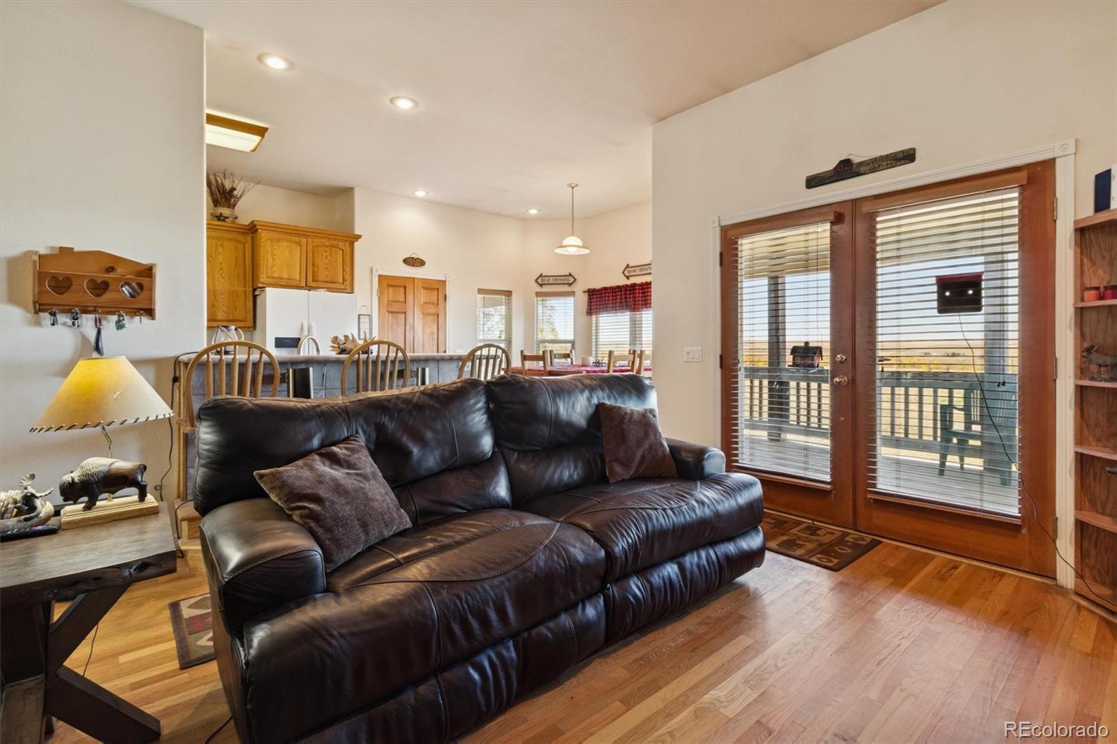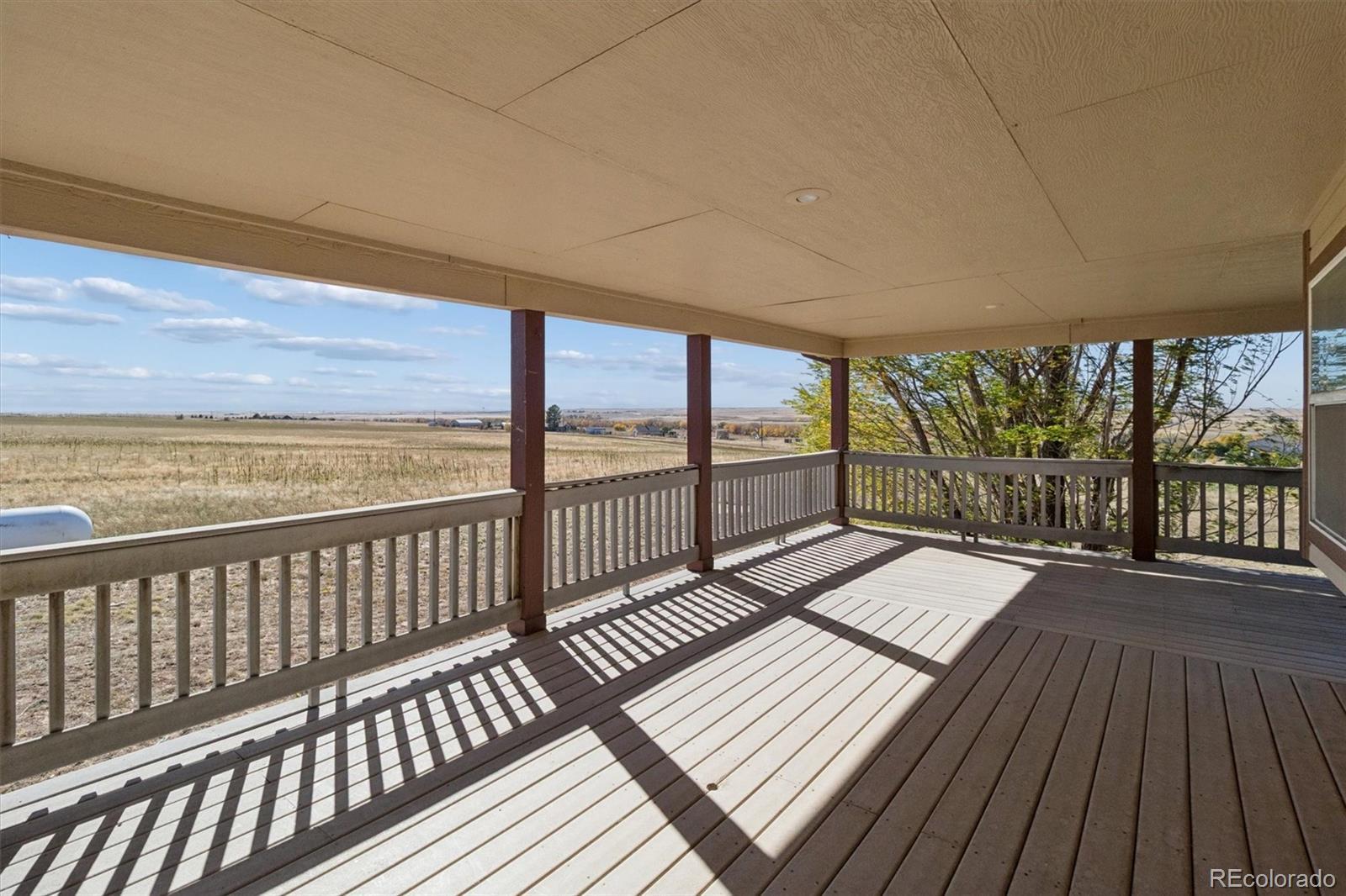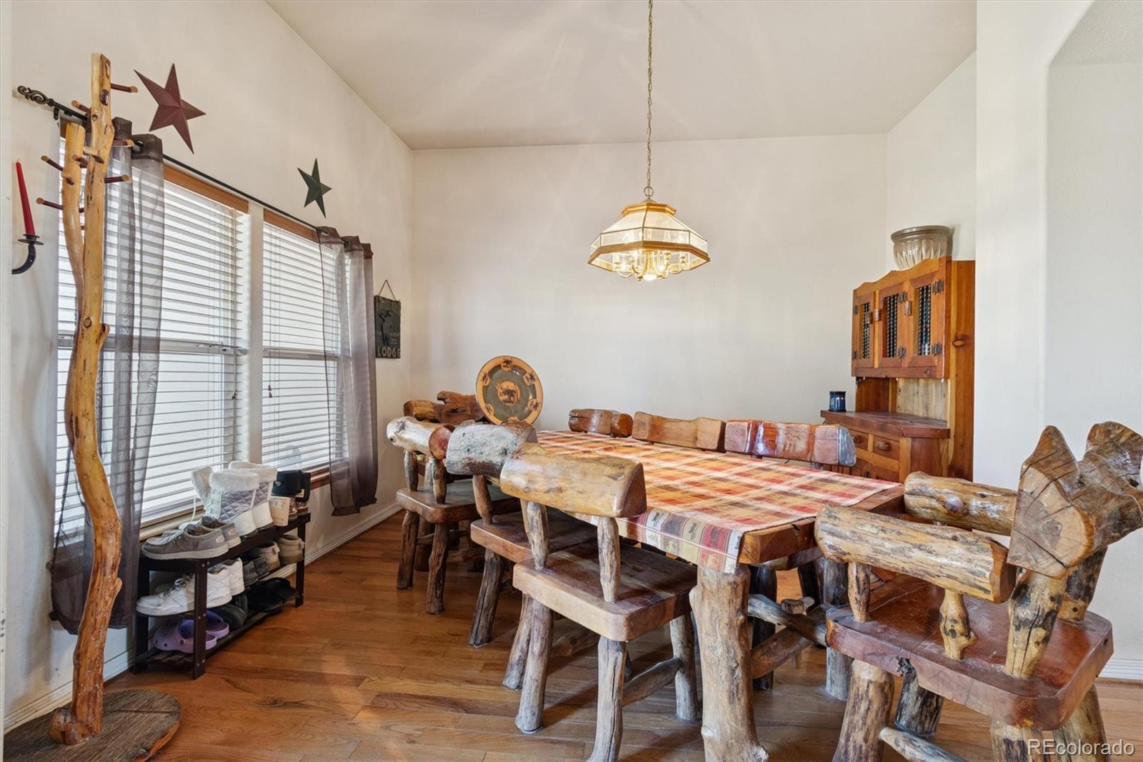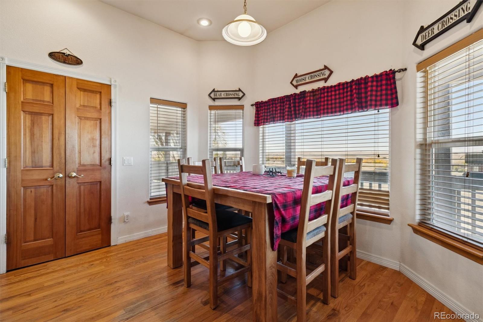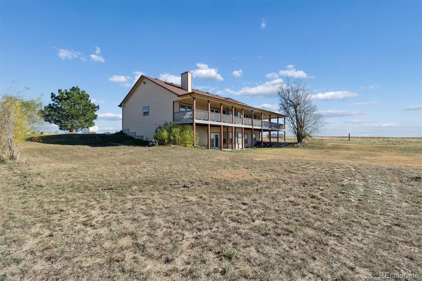 Welcome to the country life! This lovely, open floorplan home has hardwood floors throughout the main level living areas and in the primary suite with 12' high ceilings and TONS of windows that really bring the beauty of the country inside. Situated on almost 35 acres with NO HOA, the opportunities are endless - bring your livestock, horses, toys, you name it! This ranch home with a fully finished walkout basement has plenty of room for everybody. There are 3 bedrooms and 2 bathrooms on the main level plus your large kitchen with eat-in dining area and island with built-in seating, the main living room with a pellet stove fireplace, as well as a beautiful formal dining room and spacious office with a custom, built-in desk. In the basement, you will find another bedroom and a full bathroom with a steam-sauna shower that has audio controls for music, as well as a bar with kitchenette, another pellet stove fireplace and a workout area/flex space waiting for your enjoyment. Step outside onto the HUGE wrap-around Trex deck from the kitchen or the primary bedroom and enjoy the mountain views! The basement also has a walk-out entrance, which could be a great multi-generational living option, if needed. There is plenty of space for storage in the basement maintenance closet/storage closet plus an oversized 3-car garage that is drywalled and insulated! With a recently new roof (Class 4, hail resistant shingles), new septic lids, new well pump, newer hot water tank and 1,000 gallon propane tank that is owned outright, this property is move-in ready and waiting for its new owners. Don't miss this lovely country gem - schedule your showing today!