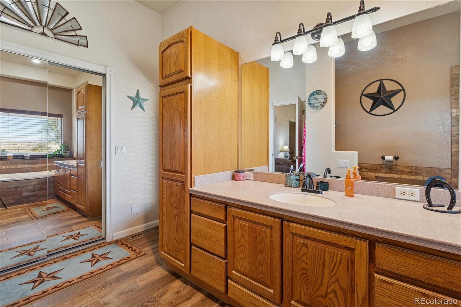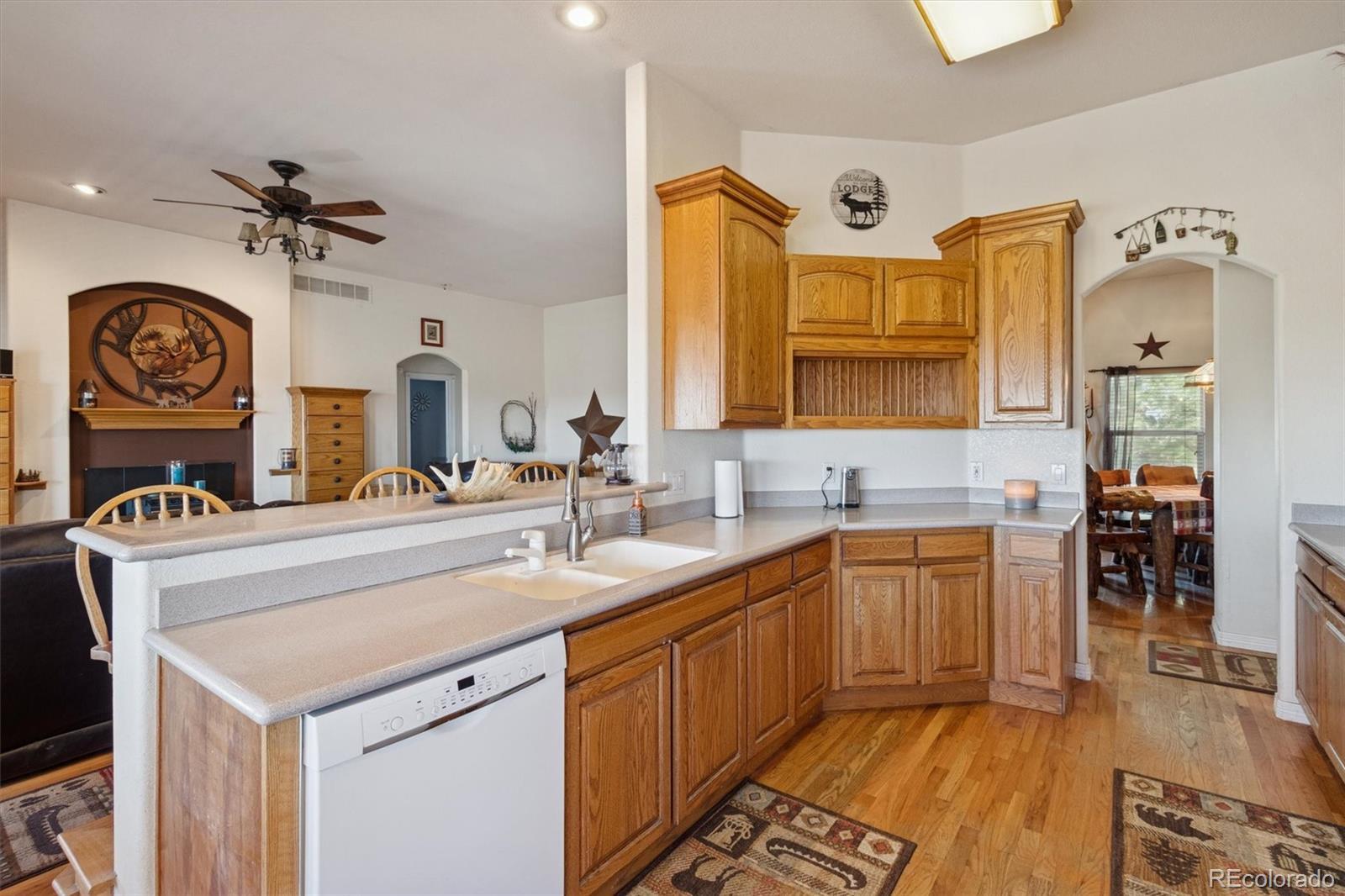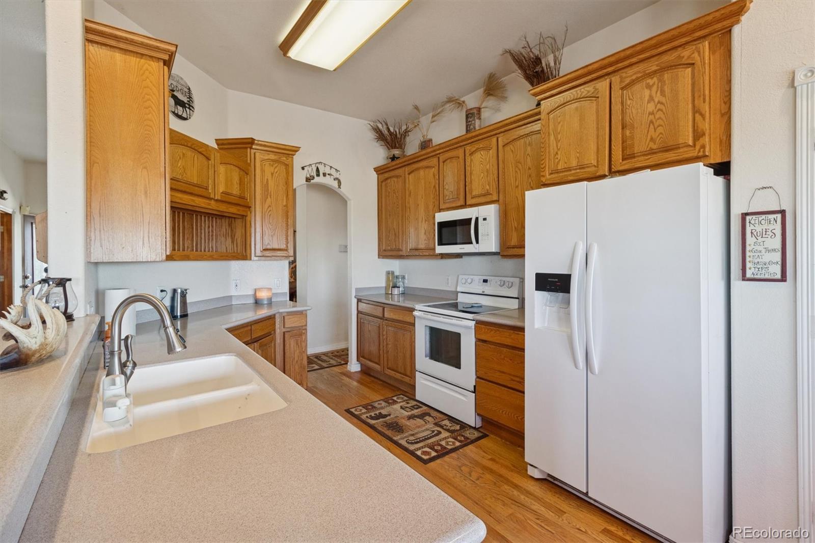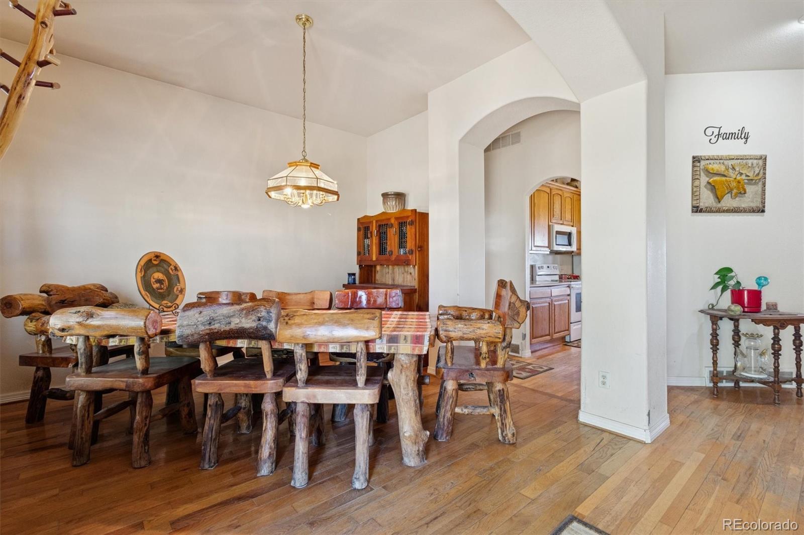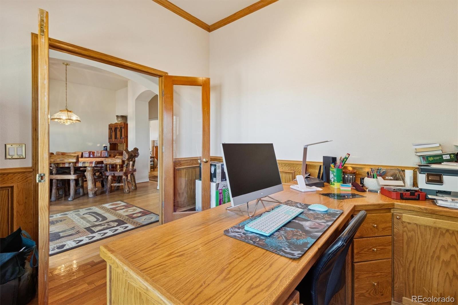 Welcome to the country life! This lovely, open floorplan home has hardwood floors throughout the main level living areas and in the primary suite with 12' high ceilings and TONS of windows that really bring the beauty of the country inside. Situated on almost 35 acres with NO HOA, the opportunities are endless - bring your livestock, horses, toys, you name it! This ranch home with a fully finished walkout basement has plenty of room for everybody. There are 3 bedrooms and 2 bathrooms on the main level plus your large kitchen with eat-in dining area and island with built-in seating, the main living room with a pellet stove fireplace, as well as a beautiful formal dining room and spacious office with a custom, built-in desk. In the basement, you will find another bedroom and a full bathroom with a steam-sauna shower that has audio controls for music, as well as a bar with kitchenette, another pellet stove fireplace and a workout area/flex space waiting for your enjoyment. Step outside onto the HUGE wrap-around Trex deck from the kitchen or the primary bedroom and enjoy the mountain views! The basement also has a walk-out entrance, which could be a great multi-generational living option, if needed. There is plenty of space for storage in the basement maintenance closet/storage closet plus an oversized 3-car garage that is drywalled and insulated! With a recently new roof (Class 4, hail resistant shingles), new septic lids, new well pump, newer hot water tank and 1,000 gallon propane tank that is owned outright, this property is move-in ready and waiting for its new owners. Don't miss this lovely country gem - schedule your showing today!