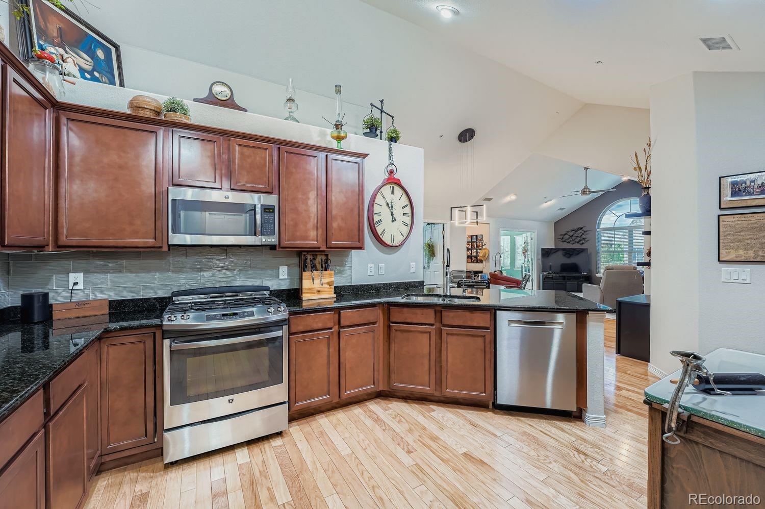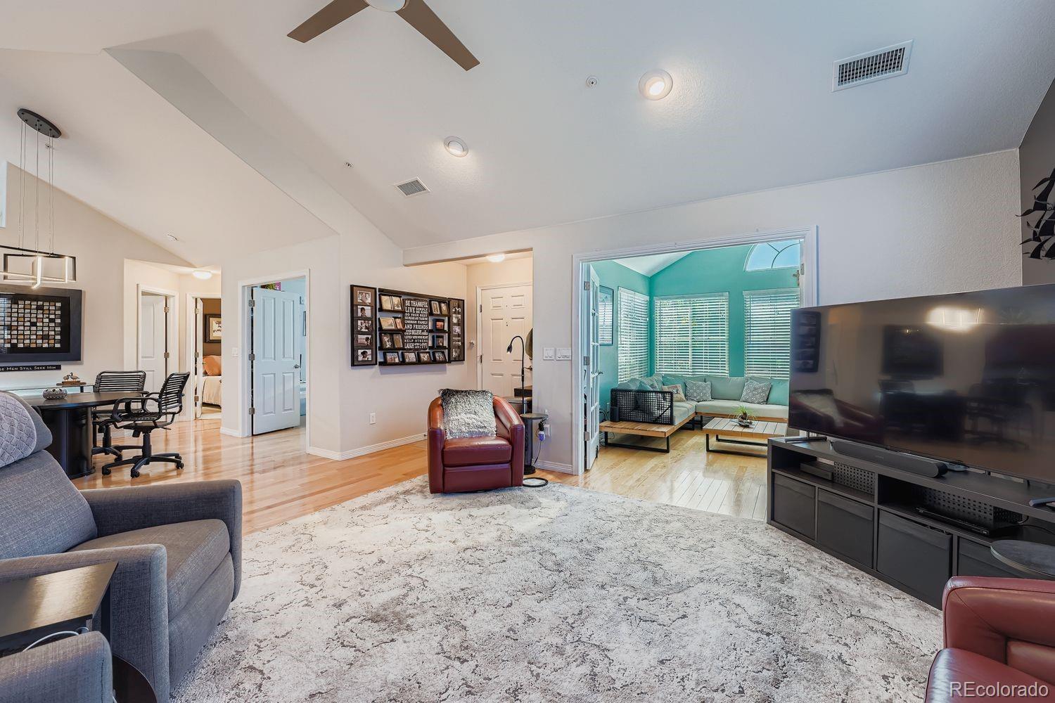 Welcome to this beautifully maintained ranch-style patio home with 2-beds and 2-baths in a desirable Aurora community. Featuring vaulted ceilings, LVP floors, and abundant natural light, this home offers an open and inviting layout perfect for everyday living and entertaining. The updated kitchen boasts granite countertops, stainless steel appliances, and ample cabinet space, opening seamlessly to the dining and living areas. A cozy fireplace anchors the vaulted living room, while the sun-filled bonus room with French doors provides the perfect spot to relax year-round. The spacious primary suite includes a walk-in closet and a primary bath with dual sinks and separate shower. Main bath includes a spa-like soaking tub with jets. Additional bedrooms and a flexible sunroom offer plenty of options for family, guests, or working from home. Enjoy convenience with a large laundry/mudroom, an attached two-car garage, and no-maintenance landscaping. Located close to shopping, dining, parks, and major roadways, this home blends style and practicality in an established neighborhood. Don’t miss your chance to make this move-in-ready Aurora gem yours!