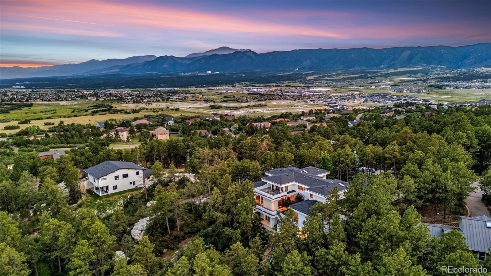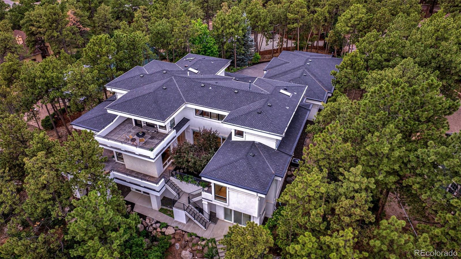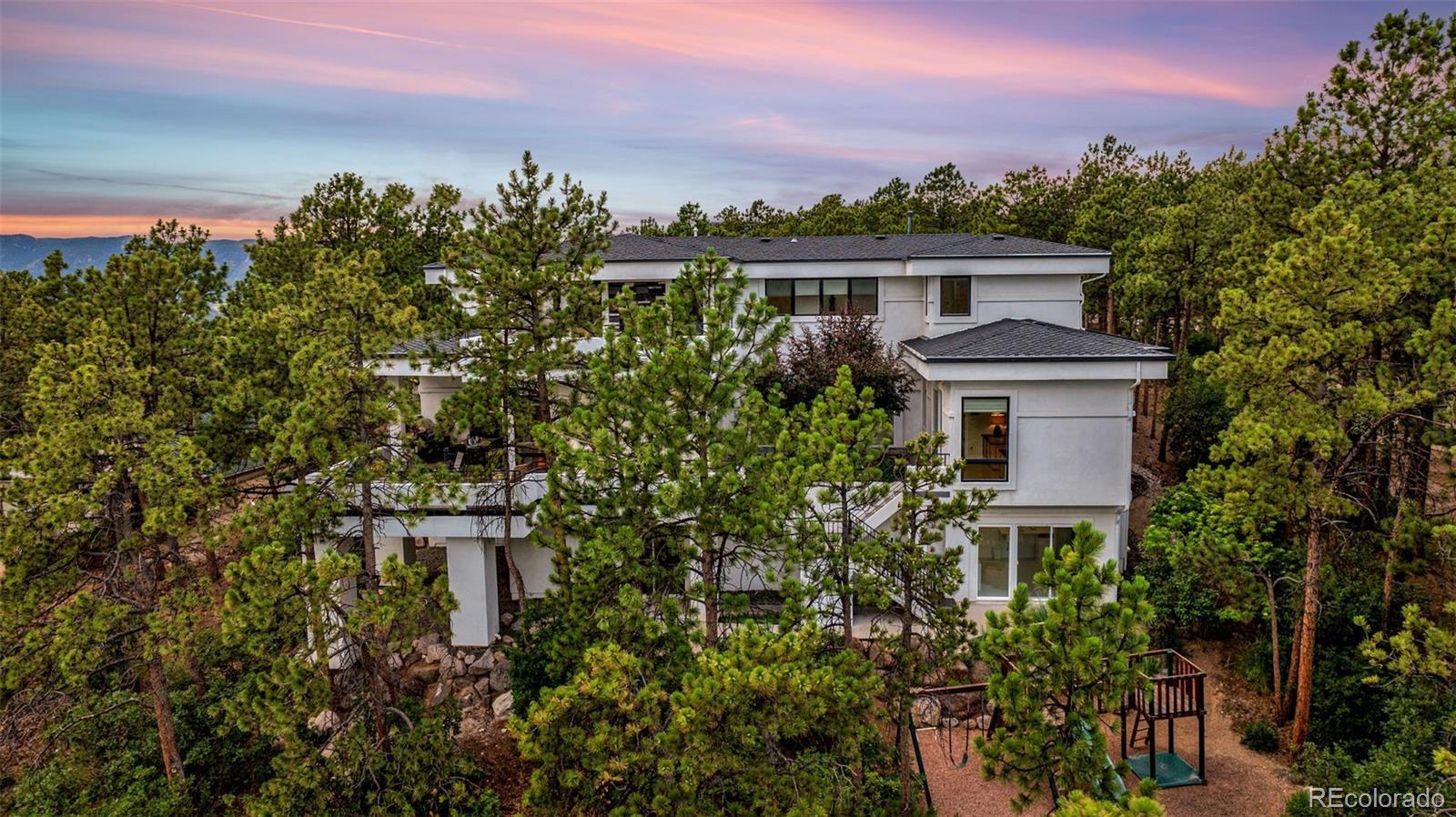 Discover a one-of-a-kind residence crafted by architect Mike Schock, a visionary in custom design. This 6023 sq. ft., 4-bedroom, 6 bath custom home seamlessly blends form and function, offering open concept living spaces, numerous large windows highlighting views of the surrounding lodge pole pines, Pikes Peak, the Air Force Academy, and the lights of Colorado Springs in the distance. The innovative layout maximizes natural light and flow, creating an airy, serene ambience perfect for both relaxation and entertaining. Nestled in the trees of South Woodmoor at the end of a peaceful cul-de-sac, this bespoke creation features 2 levels plus a finished walk-out basement all connected by an in-home elevator. The two wings of the upper level include the primary suite (sitting room with 2-sided fireplace onto upper deck, bedroom, dual bathrooms, each with heated floors, and dual walk-in closets), large upstairs laundry, and secondary bedroom with en-suite bath (heated floors) and walk-in closet. The main level (kitchen with walk-in pantry and butler’s pantry, family room, dining room, living room, powder room, 2-desk office, 2 bedrooms with Jack & Jill bath and mud room) surrounds a courtyard garden with a spring-flowering tree which connects to the concrete deck off the kitchen. The maintenance-free, concrete, main level deck, accessed from the nook, entry and office has a built-in gas barbeque grill as well as a fire pit –both connected to the house gas line. The full walk-out basement includes a wet bar, fridge, entertainment center, half bath, 2 shelved storage rooms, and a craft/plant room with sink. Completing the home is an over-sized 3-car garage and access to 24/7 Woodmoor Security. This unique home truly offers luxury, space, comfort, and location.