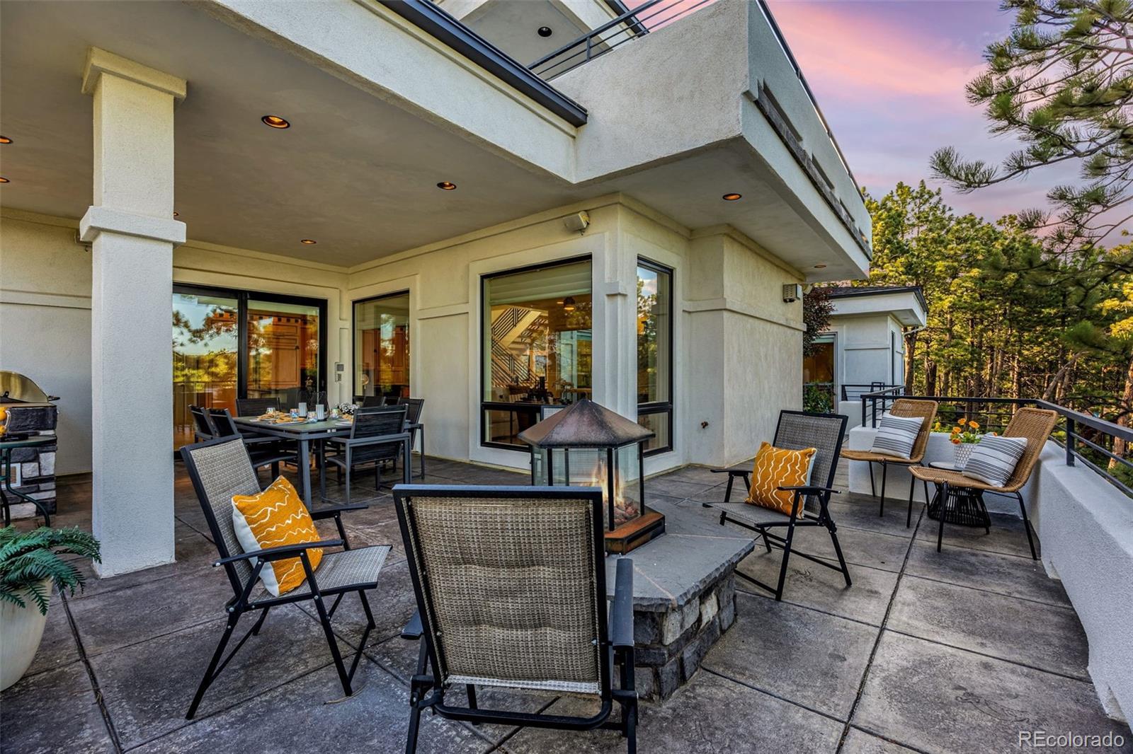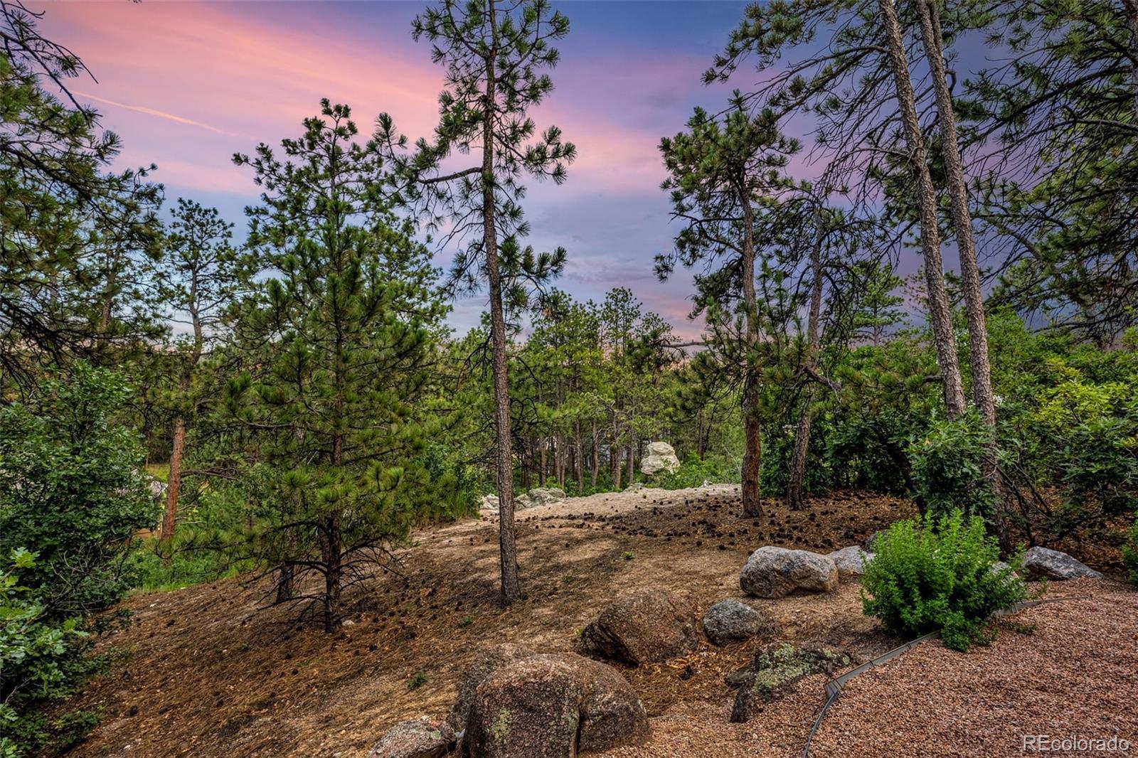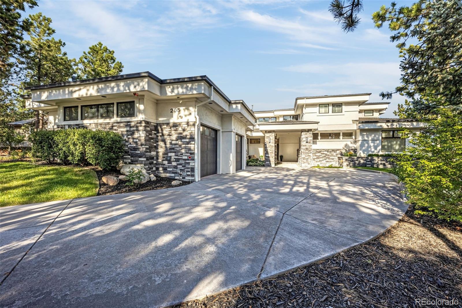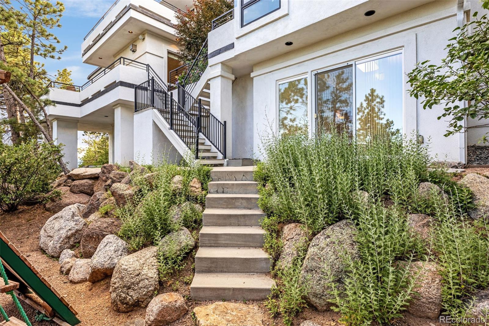 Discover a one-of-a-kind residence crafted by architect Mike Schock, a visionary in custom design. This 6023 sq. ft., 4-bedroom, 6 bath custom home seamlessly blends form and function, offering open concept living spaces, numerous large windows highlighting views of the surrounding lodge pole pines, Pikes Peak, the Air Force Academy, and the lights of Colorado Springs in the distance. The innovative layout maximizes natural light and flow, creating an airy, serene ambience perfect for both relaxation and entertaining. Nestled in the trees of South Woodmoor at the end of a peaceful cul-de-sac, this bespoke creation features 2 levels plus a finished walk-out basement all connected by an in-home elevator. The two wings of the upper level include the primary suite (sitting room with 2-sided fireplace onto upper deck, bedroom, dual bathrooms, each with heated floors, and dual walk-in closets), large upstairs laundry, and secondary bedroom with en-suite bath (heated floors) and walk-in closet. The main level (kitchen with walk-in pantry and butler’s pantry, family room, dining room, living room, powder room, 2-desk office, 2 bedrooms with Jack & Jill bath and mud room) surrounds a courtyard garden with a spring-flowering tree which connects to the concrete deck off the kitchen. The maintenance-free, concrete, main level deck, accessed from the nook, entry and office has a built-in gas barbeque grill as well as a fire pit –both connected to the house gas line. The full walk-out basement includes a wet bar, fridge, entertainment center, half bath, 2 shelved storage rooms, and a craft/plant room with sink. Completing the home is an over-sized 3-car garage and access to 24/7 Woodmoor Security. This unique home truly offers luxury, space, comfort, and location.