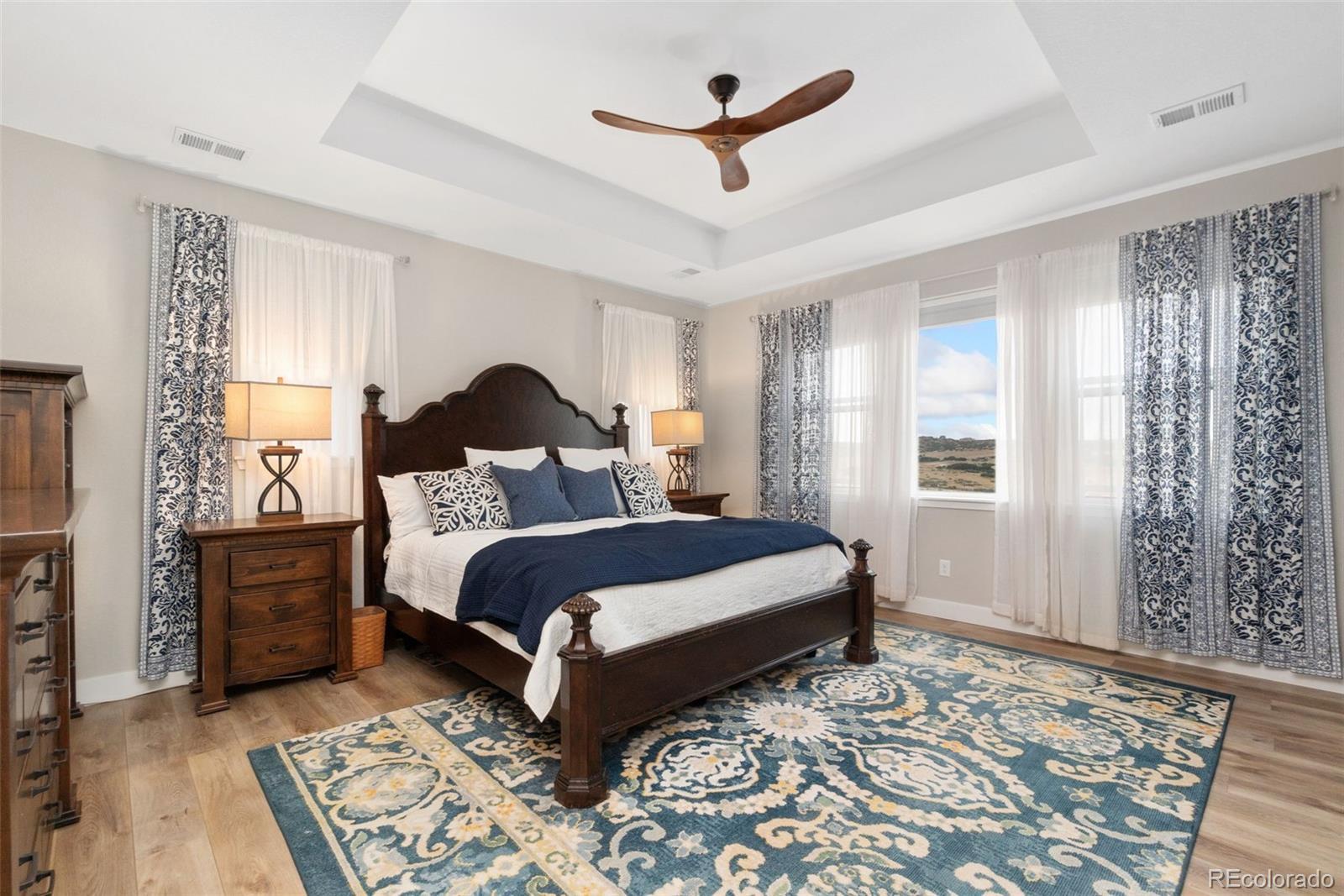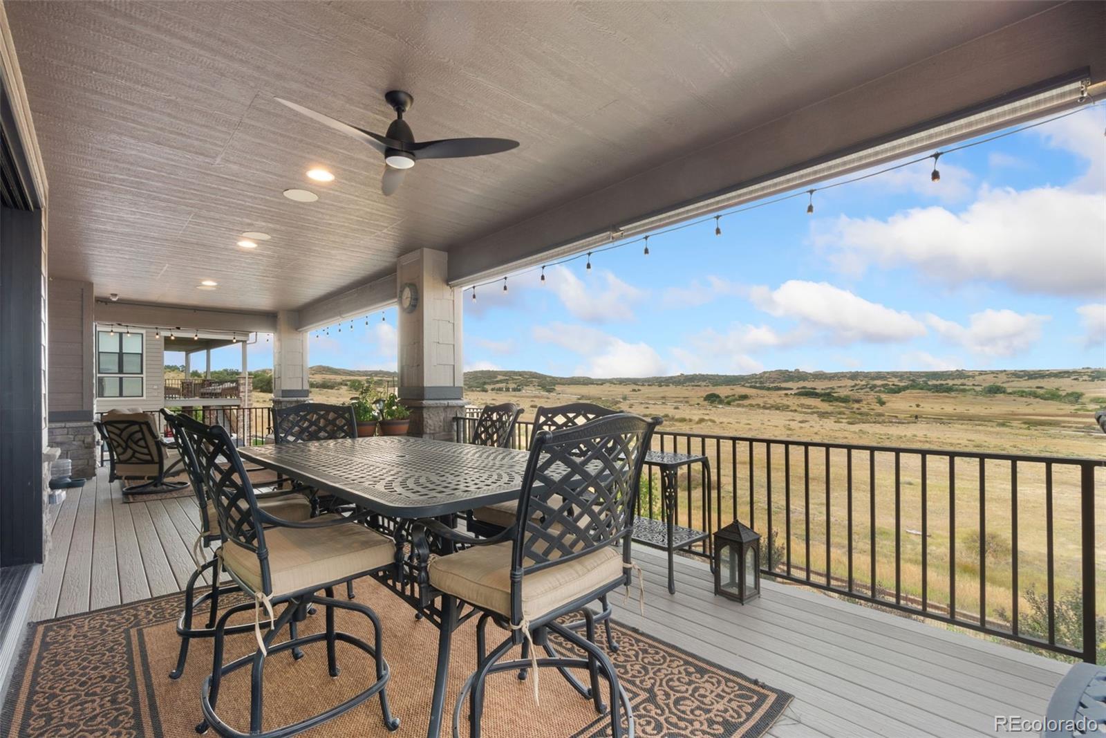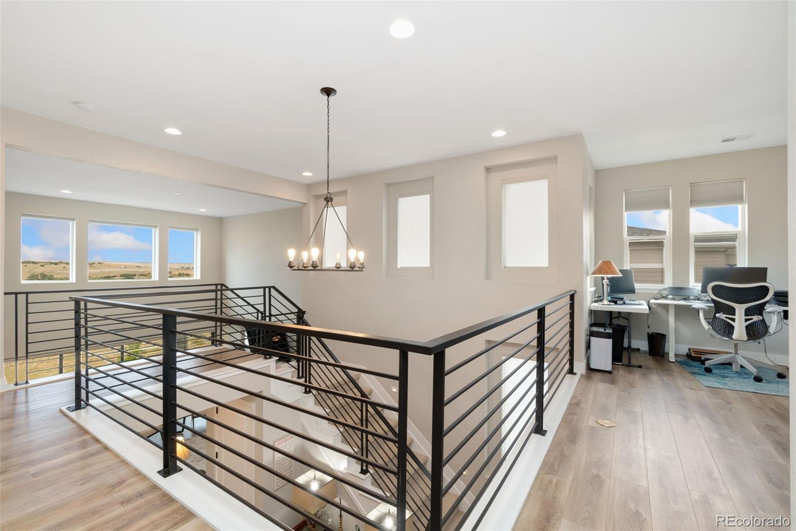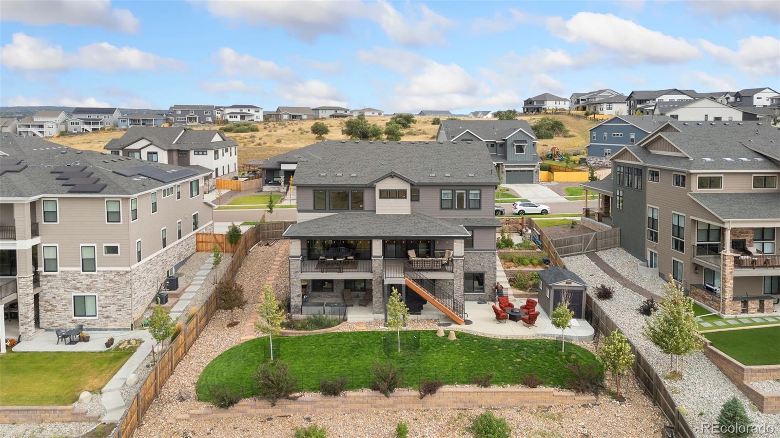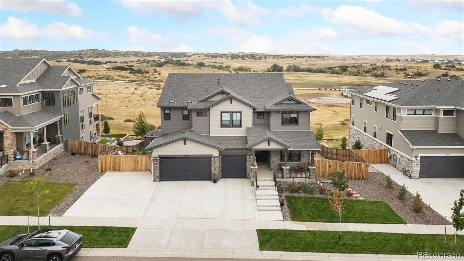 Experience modern elegance and Colorado sophistication in this semi-custom Trails at Crowfoot residence with $230K+ in curated upgrades. Perfectly situated on a premium walk-out lot backing to protected open space, this home offers breathtaking west-facing sunsets and seamless indoor-outdoor living. Step inside to soaring ceilings, sleek horizontal railings, and sun-filled windows that frame open views. The great room, anchored by a contemporary fireplace, flows through a 4-panel sliding glass wall to a covered deck—perfect for morning coffee or evening gatherings. Remote-controlled solar shades provide effortless privacy without sacrificing natural light. At the heart of the home, the gourmet kitchen showcases Thermador appliances, including a gas range, double ovens with side-swing doors, and a dishwasher. An oversized granite island, soft-close custom cabinetry, and a butler’s pantry with wet bar sink create both function and drama. Designer pendants, under-cabinet lighting, and thoughtful outlets elevate the space. The primary suite is a retreat with a coffered ceiling and a spa-inspired bath featuring a freestanding tub, frameless shower with dual heads, dual granite vanities, and upgraded cabinetry: three additional bedrooms plus a versatile loft offer flexible living. The outdoor spaces impress with tiered perennial gardens, an enlarged patio with a built-in gas line, and a Tuff Shed for storage. The oversized 4-car tandem garage is fully finished with insulation, paint, epoxy flooring, added outlets, and a 20-amp circuit—ideal for EVs, hobbies, or gear. Smart-home upgrades include a Qolsys security system, Wi-Fi coverage, smart garage doors, a tankless water heater, and upgraded electrical panels. Trails, parks, and a resort-style pool complete the lifestyle. This is more than a home—it’s defined as Colorado luxury.