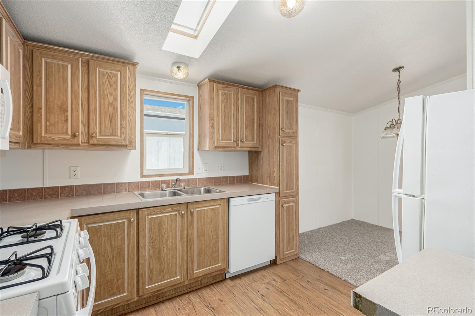 Welcome to this beautifully updated 2-bedroom, 2-bath home in the Bear Creek Village Community! From the moment you arrive, the charming exterior and private entryway set the stage for a bright and inviting living space. Inside, you’ll love the open layout with fresh paint, vaulted ceilings, and abundant natural light that create a warm, airy atmosphere. The spacious living room offers flexibility for both relaxation and entertaining, while the dining area flows seamlessly into a well-designed kitchen featuring rich cabinetry, ample counter space, cabinet storage, and all appliances included. The primary bedroom is spacious with extra storage in the closets and a private en suite with step in shower. The hall bath is bright and light with a tub. A dedicated laundry area with washer and dryer included adds everyday convenience with access to the side of the home and can double as a mud room. Outside, enjoy your side and back yard with off-street parking, a storage shed, and space for a patio set and BBQ or just relax. Bear Creek Village offers beautiful mature trees, and an scenic picnic area. Residents also enjoy access to amenities including a clubhouse, pool, laundry facilities, billiards and game room. Located just minutes from shopping, dining, and easy highway access, this home is a great option for comfortable living in a vibrant community.