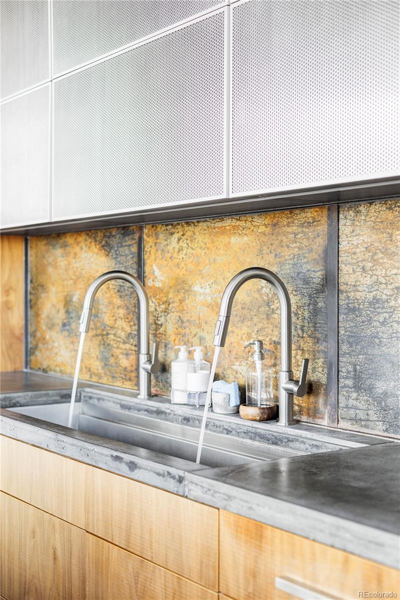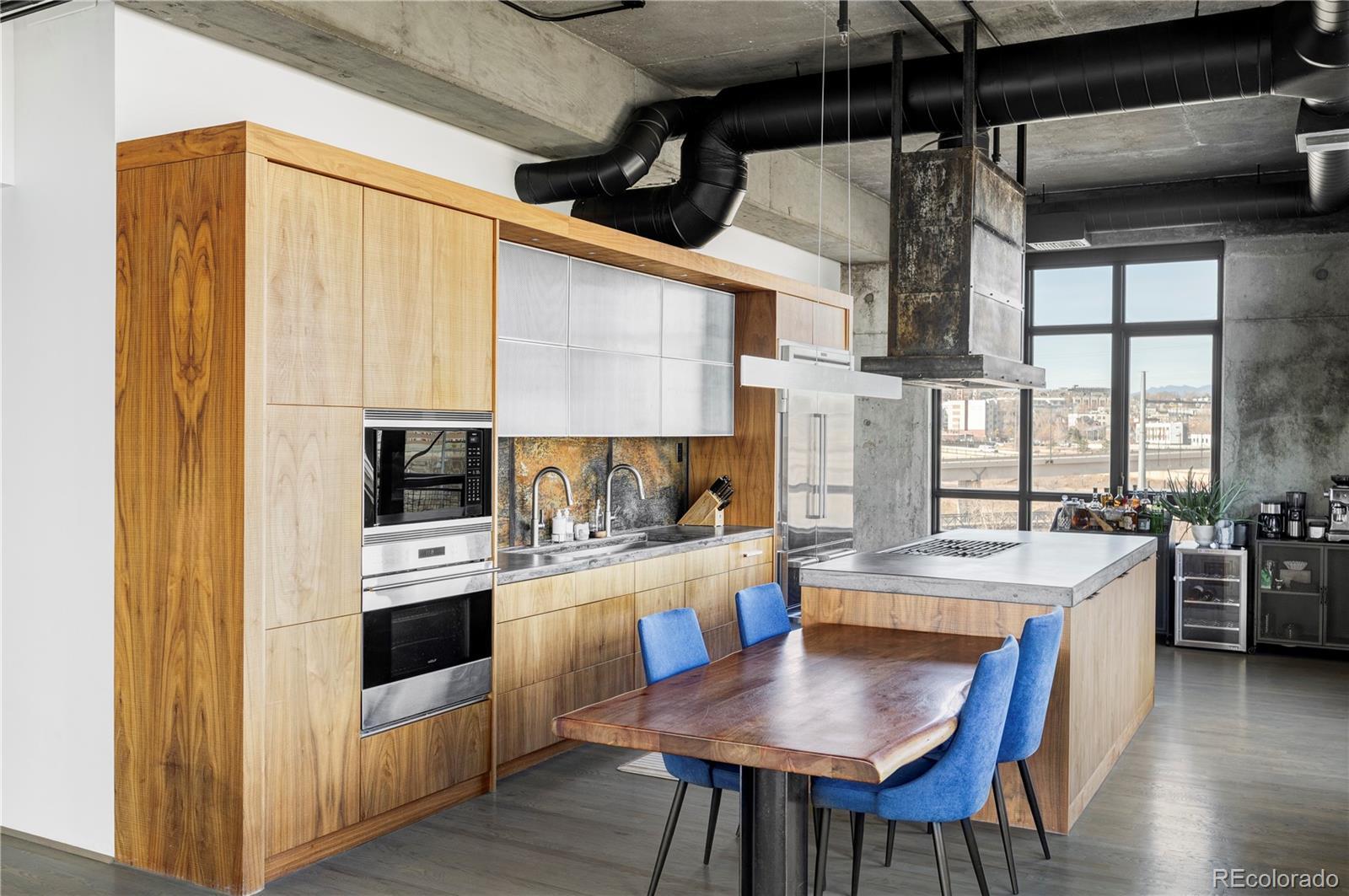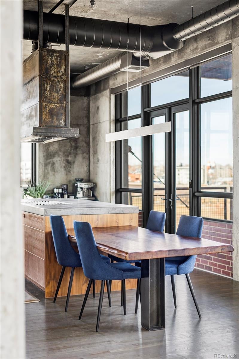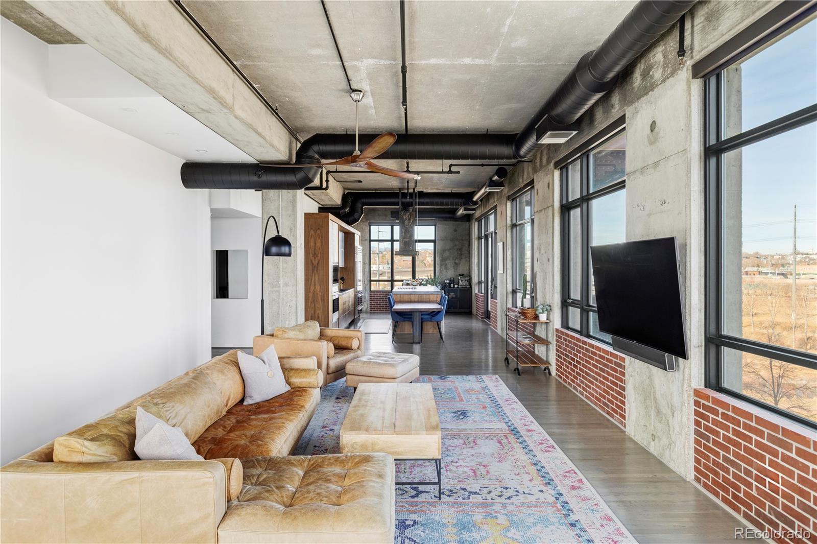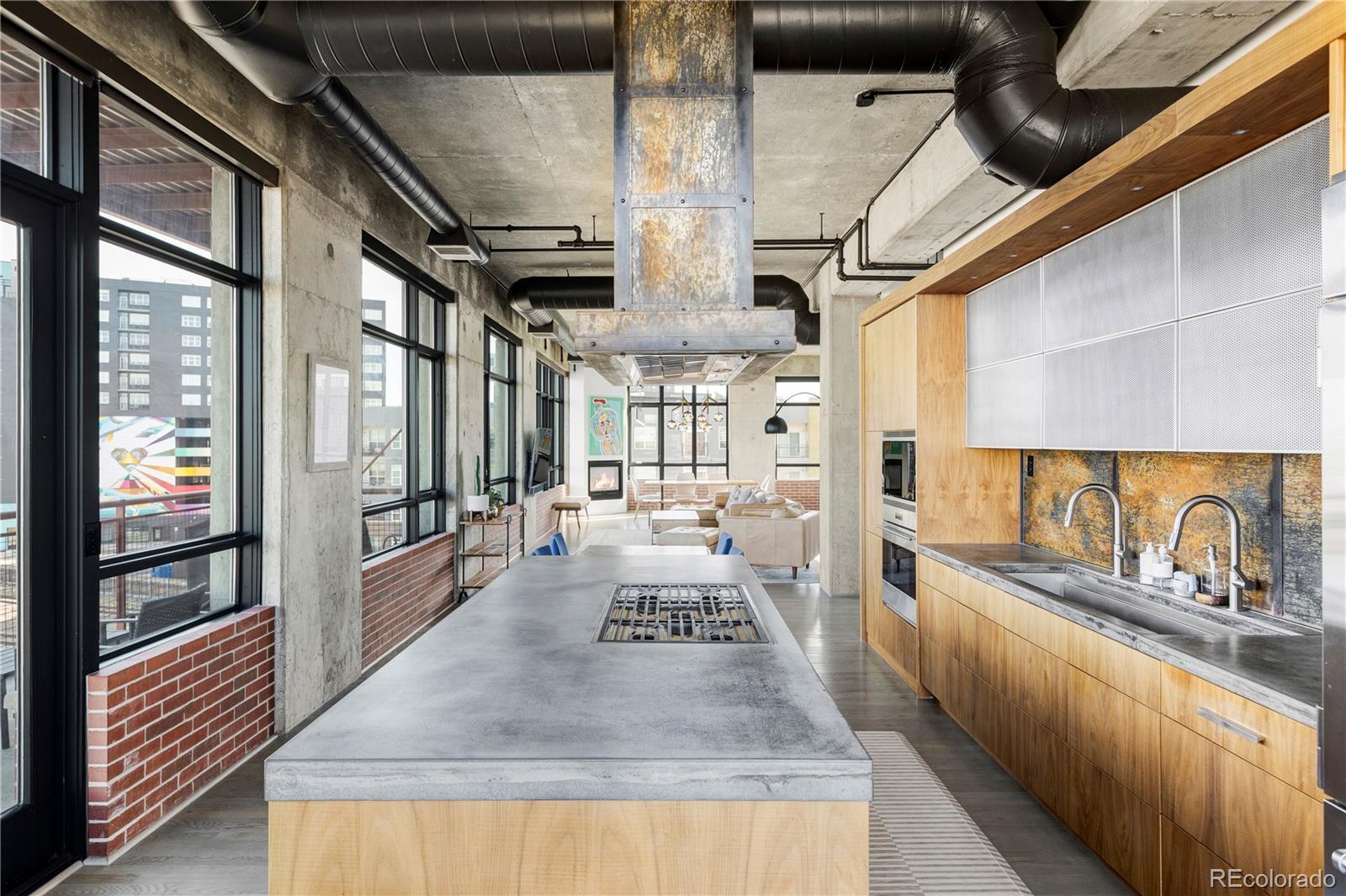 Extensively remodeled 2-bedroom + den + office nook, 2.5-bath end-unit loft in the iconic Flour Mill Lofts, one of downtown Denver’s most architecturally distinctive historic buildings. This light-filled residence offers an open industrial aesthetic and expansive windows with sweeping city, mountain, and park views. The thoughtfully designed floor plan flows seamlessly from the chef’s kitchen into dining, living, and flexible workspace areas—ideal for both everyday living and entertaining. The custom kitchen features premium Wolf and Sub-Zero appliances, abundant walnut cabinetry, a striking metal hood and backsplash, and a large Galley workstation sink designed for serious cooking and hosting. Both spacious bedrooms include en-suite bathrooms, walk-in closets, and automated blackout shades for comfort and privacy. The primary suite also features a custom concrete vanity, floating wood shelving, glass shower, and heated concrete flooring. Additional highlights include: Large private balcony with gas hookup Interior den/flex space suitable for office, nursery, gym, or storage Dedicated office nook within the main living area Hardwood flooring and modernized systems Two side-by-side parking spaces and two adjacent storage units Located directly on Cuernavaca Park with immediate access to riverfront trails, Union Station, RiNo, and downtown amenities, Flour Mill Lofts combines historic character, strong community appeal, and unbeatable urban convenience.