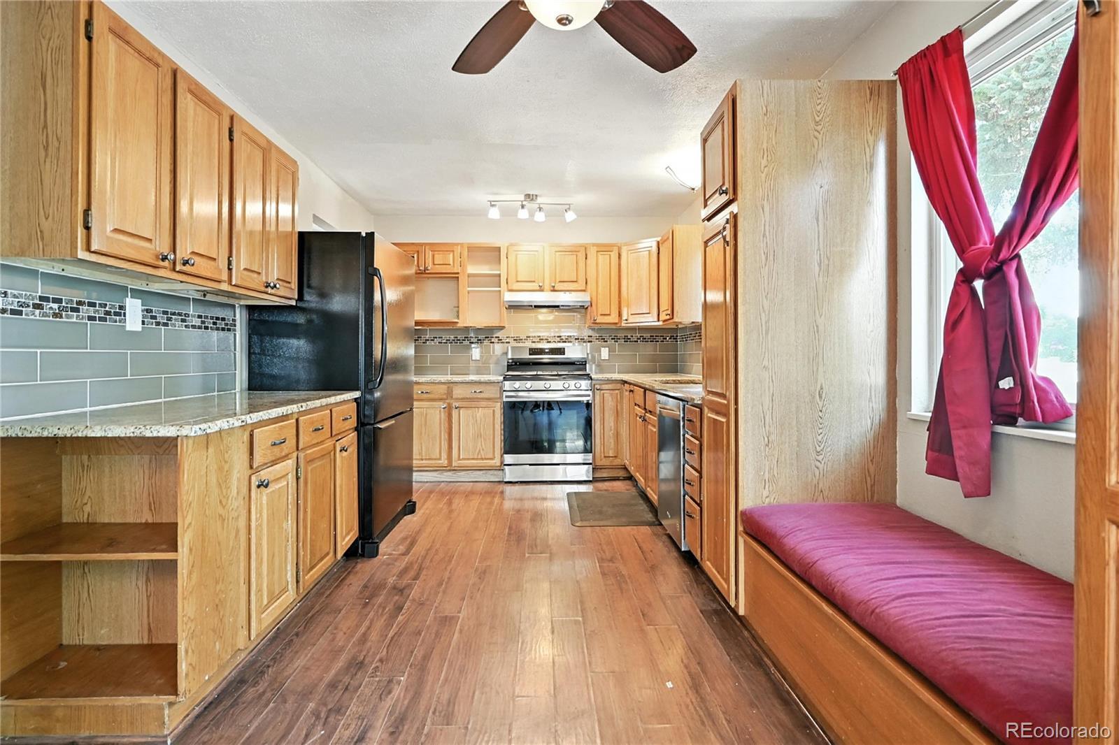 Welcome to this charming 5-bedroom, 3-bathroom ranch in Arvada's highly desirable Hackberry Hill neighborhood, complete with an attached garage! This home has a lot of updates, featuring a new 200-amp electrical panel, new garage door opener, new fence, new water heater, new backyard concrete and landscaping, new windows installed 5 years ago, and a new swamp cooler 2 years ago. The kitchen boasts stunning granite countertops, a decorative tile backsplash, and a bright kitchen nook. The main floor bathrooms and the primary bath have been fully remodeled with modern finishes, including a Jacuzzi tub in the Primary bath. The finished walk-out basement provides ample living space. The large, fenced backyard offers plenty of room for outdoor activities, and the additional parking beside the house is perfect for an RV or extra toys. Situated on an 8,276 sqft lot, this home is a must-see with updates and plenty of entertaining space. Don’t miss the opportunity to make this house your home! Some of the photos have been virtually staged. This home has an assumable loan @2.25% for 400k with a monthly payment of $2,626.67 Principal, Interest, Taxes and Insurance.