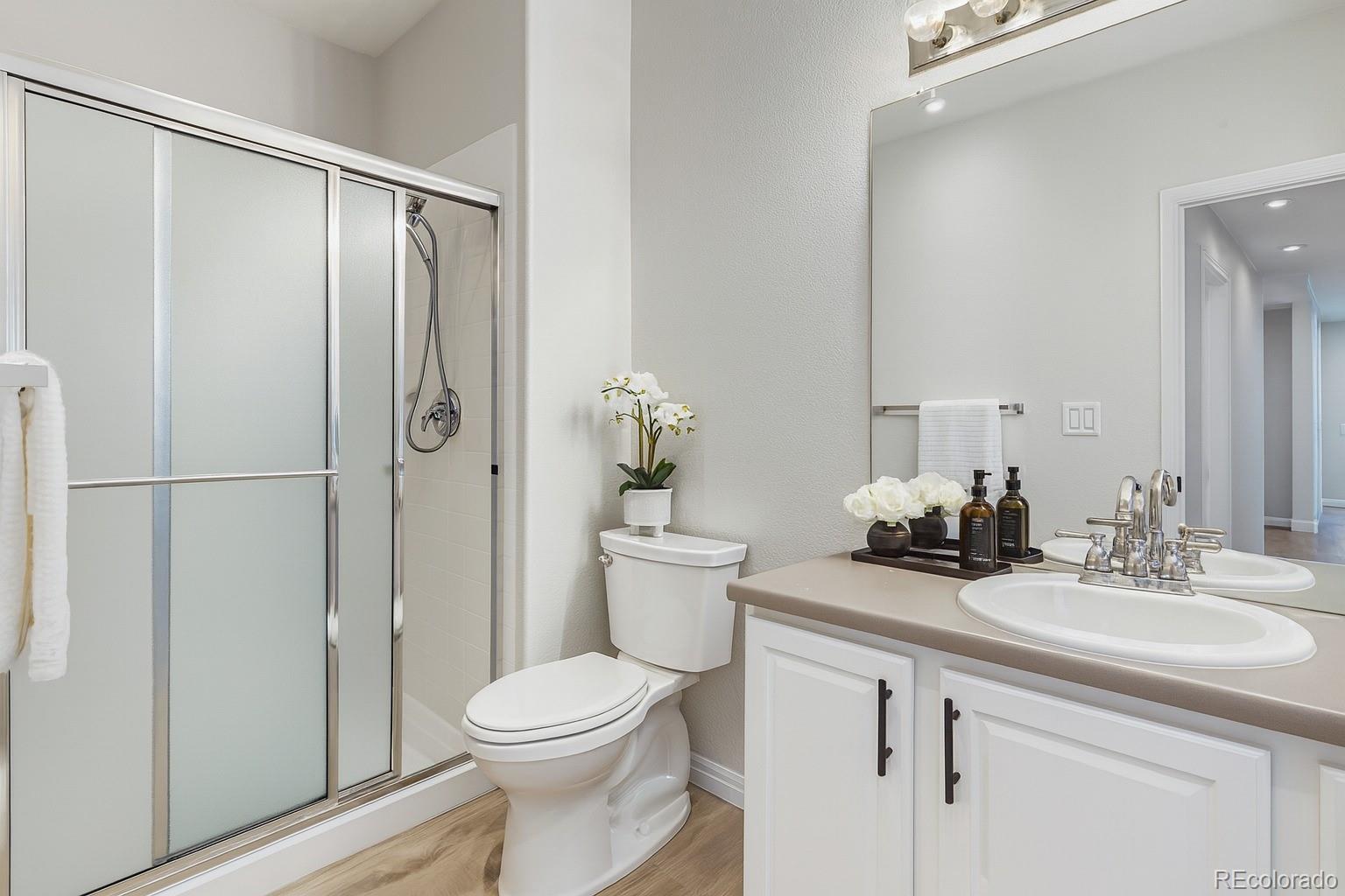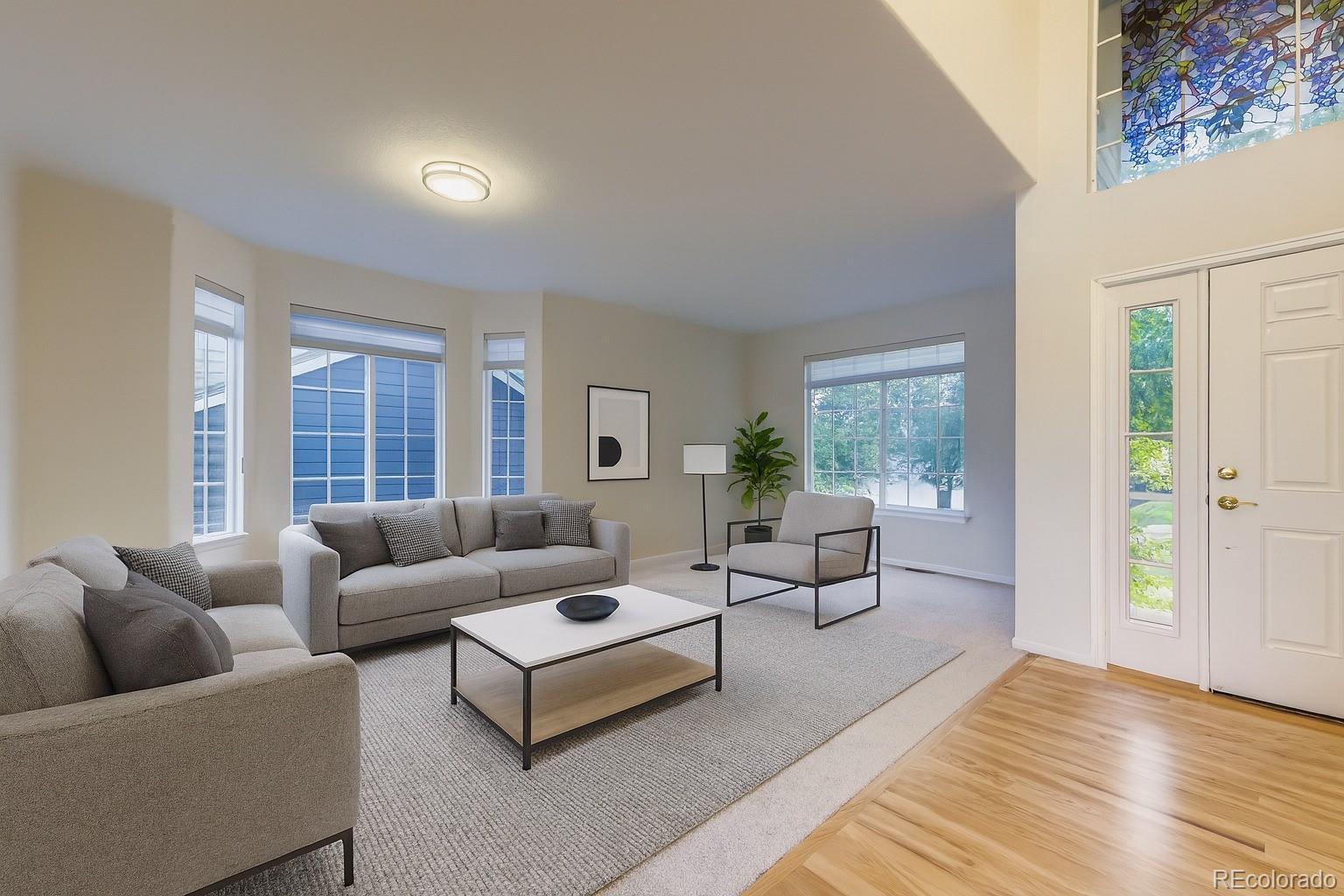 Welcome to this beautifully updated 2-story home, quietly situated in the highly desirable Cherrywood Park neighborhood. Rare main floor bedroom/laundry room with sink/bath room with shower floor plan. Enjoy unmatched convenience with quick access to I-25, the Eastlake light rail stop, shopping including Denver Premium Outlets, parks, trails, bike paths, recreation centers, and top-rated schools such Stargate School and Hulstrom K-8. This home has been thoughtfully updated with brand-new paint, finished hardwood flooring, first-floor carpeting, railings, hardware, and fixtures, offering a modern, move-in-ready feel. Spacious open floor plan! Step inside to an impressive 20-foot-high ceiling in the entryway and living room, where natural light streams through Hunter Douglas blinds, creating a warm and relaxing atmosphere. The primary suite is a true retreat, featuring a spacious walk-in closet designed to maximize storage and organization. For those who need extra space, the 3-car garage provides ample room for vehicles, storage, or even a workshop. Located in the Adams 12 Five-Star School District, this home combines style, functionality, and location—don’t miss the opportunity to make it yours! Buyers and the buyer agent to verify all information. Some pictures have furnishings and decor that are digitally added for illustrative purposes only and are not included in the sale of the property.