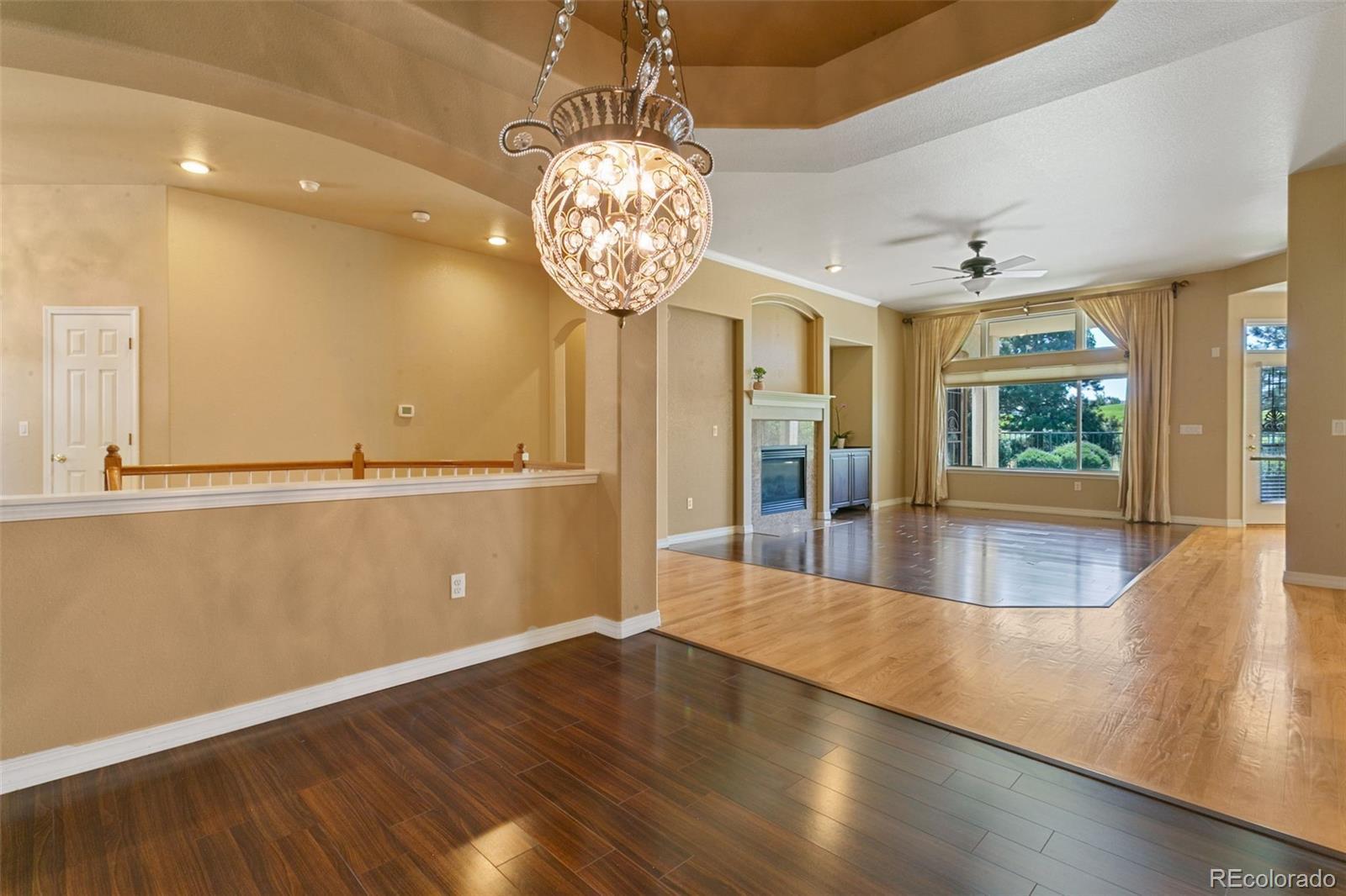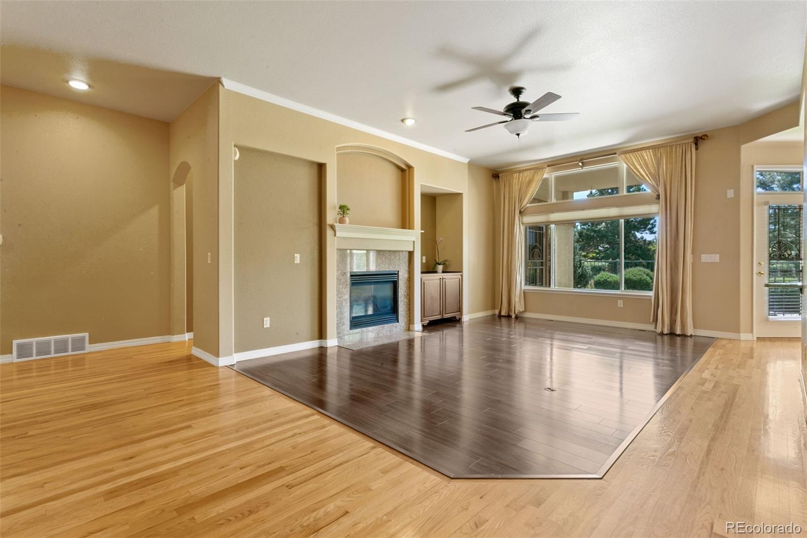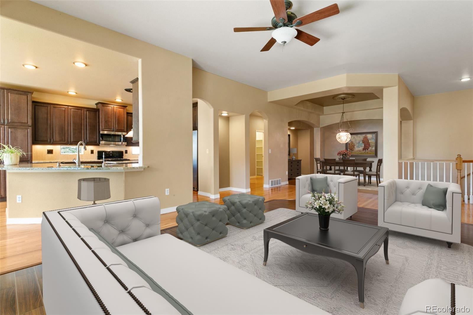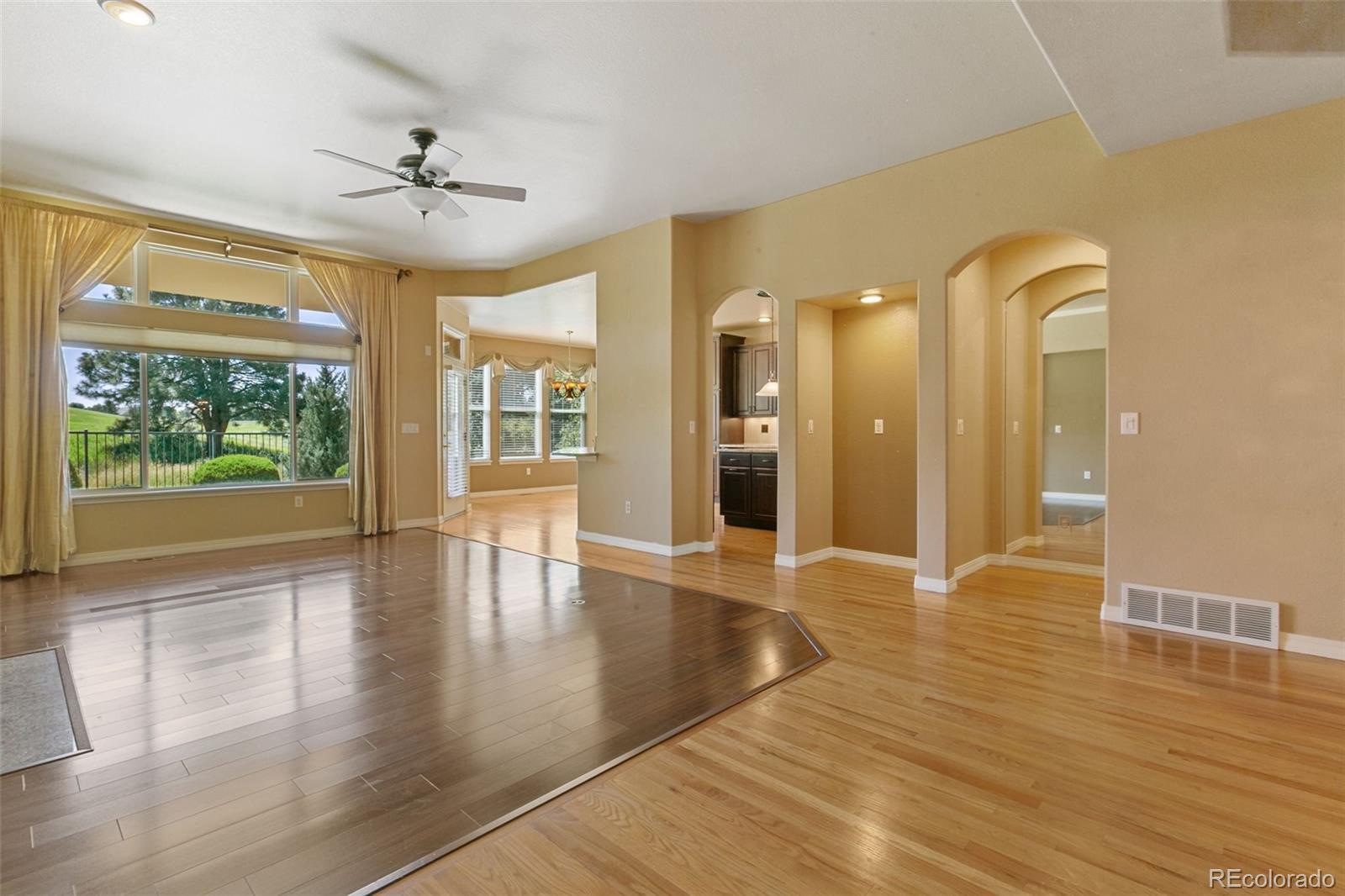 Enjoy low-maintenance living in this beautifully updated ranch-style home located on the golf course in the prestigious Pine Creek Community. This gorgeous home offers a spacious floor plan with 4 bedrooms, 4 bathrooms, and soaring 10-foot ceilings throughout the main level to create a bright, open atmosphere filled with natural light. The updated kitchen is the heart of the home, featuring abundant cabinetry, granite countertops, a central island with counter seating, and a spacious dining nook with a charming bay window overlooking the backyard and golf course. A formal dining room adds additional space for entertaining, while the great room offers a cozy gas fireplace and a wall of windows adorned with beautiful views. The main-level primary suite is a true retreat with a luxurious five-piece bath and generous walk-in closet. A second bedroom and ensuite full bath, along with the laundry room and another half bath round out the main level. The finished basement expands your living space with two additional bedrooms, a large family room, a bonus room perfect for crafts or hobbies, a full bath, and a spacious storage room. Enjoy outdoor living year-round on the covered back patio, with scenic views and room to relax. The home has been thoughtfully updated with quality finishes and attention to detail throughout. Conveniently located near I-25, hospitals, shopping centers, and restaurants—this home combines comfort, style, and accessibility in a highly desirable golf course setting.