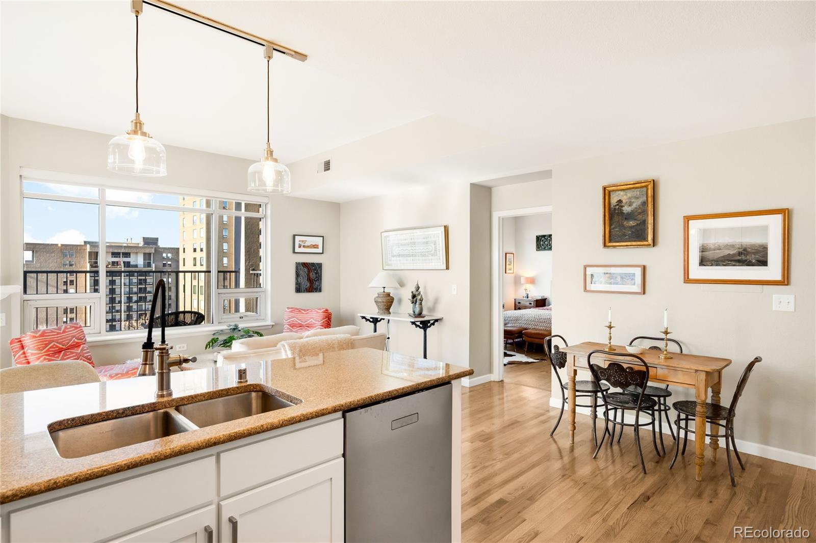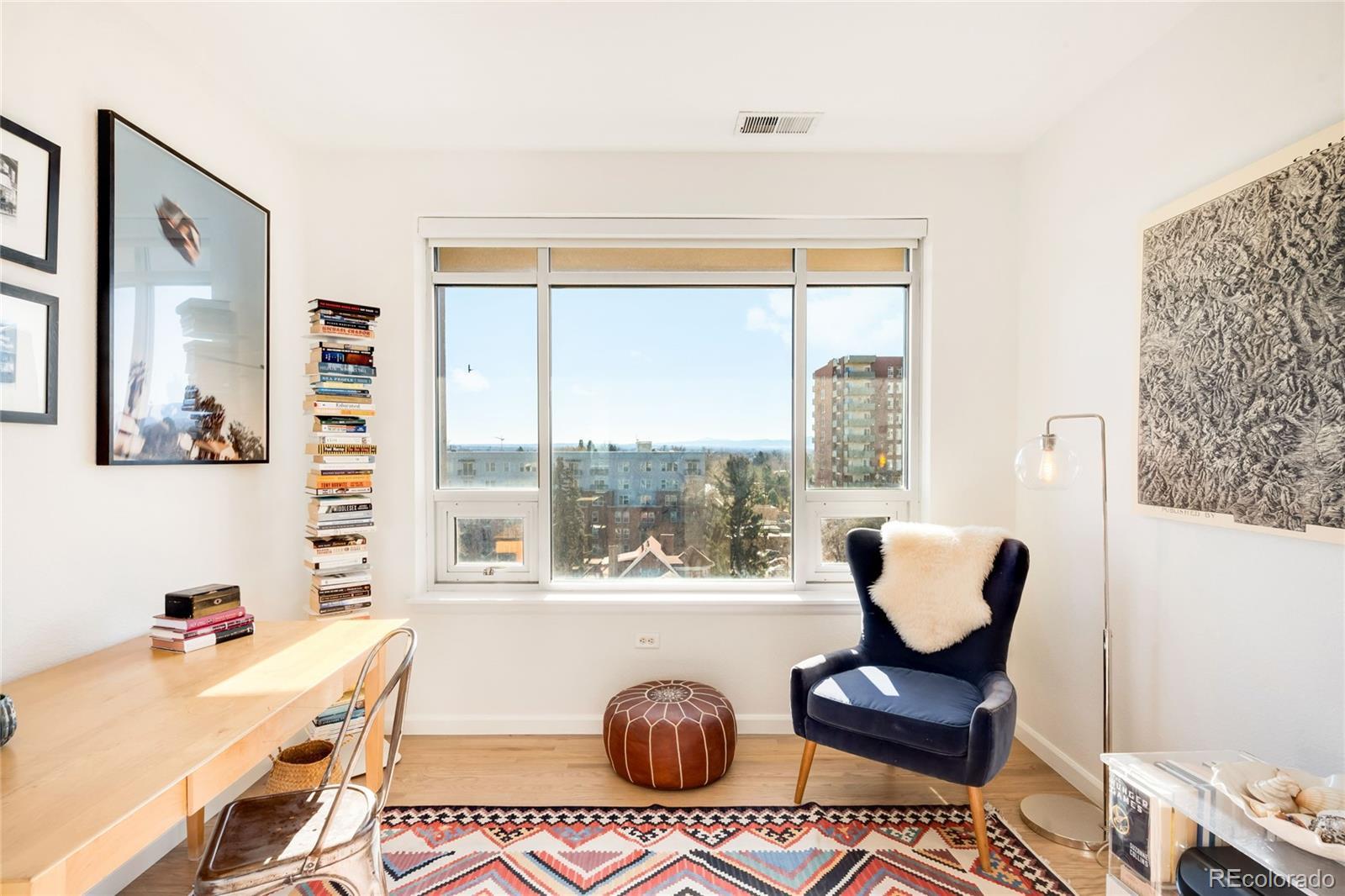 Elevated above the city in the heart of Cheesman Park, this top-floor residence offers a rare vantage point where mountain horizons and Denver’s skyline converge. Bathed in generous natural light, the condo unfolds with a refined, open-concept layout featuring refinished wood flooring, a sun-filled living area anchored by a cozy fireplace, expansive windows, and an updated kitchen with sleek stainless steel appliances. The primary suite offers a walk-in closet and updated bath, while a secondary bedroom and full bath provide flexible space for guests or a home office, complemented by in-unit laundry for everyday convenience. A private balcony extends the living space outdoors with picturesque views, and two tandem, deeded parking spaces offer a rare and valuable advantage. Set on an exceptional street that dead-ends into the Denver Botanic Gardens, this location delivers a uniquely insulated and peaceful living experience just moments from Cheesman Park’s iconic green space, local cafés, and downtown—achieving perfect balance between views, light, and location.