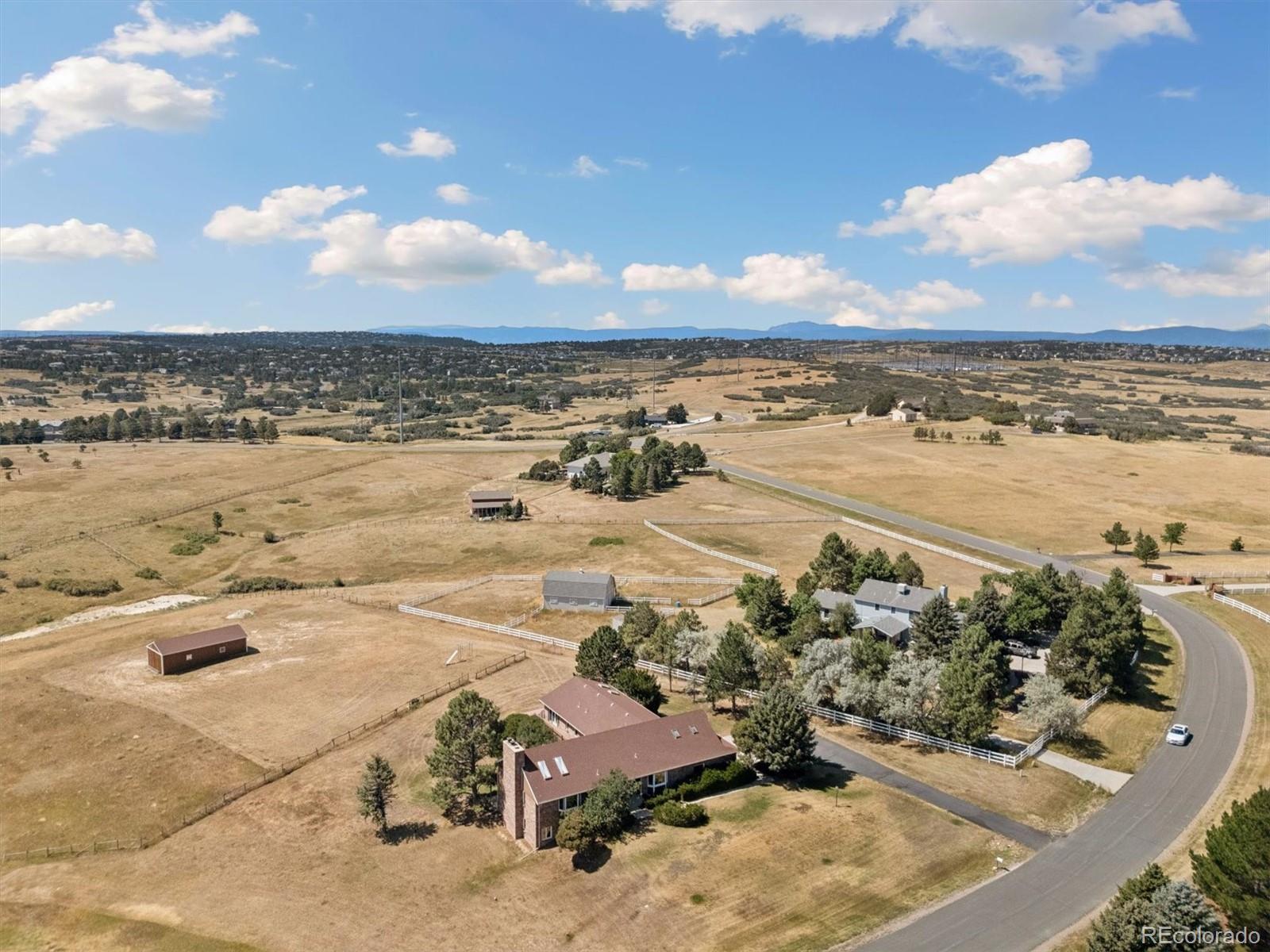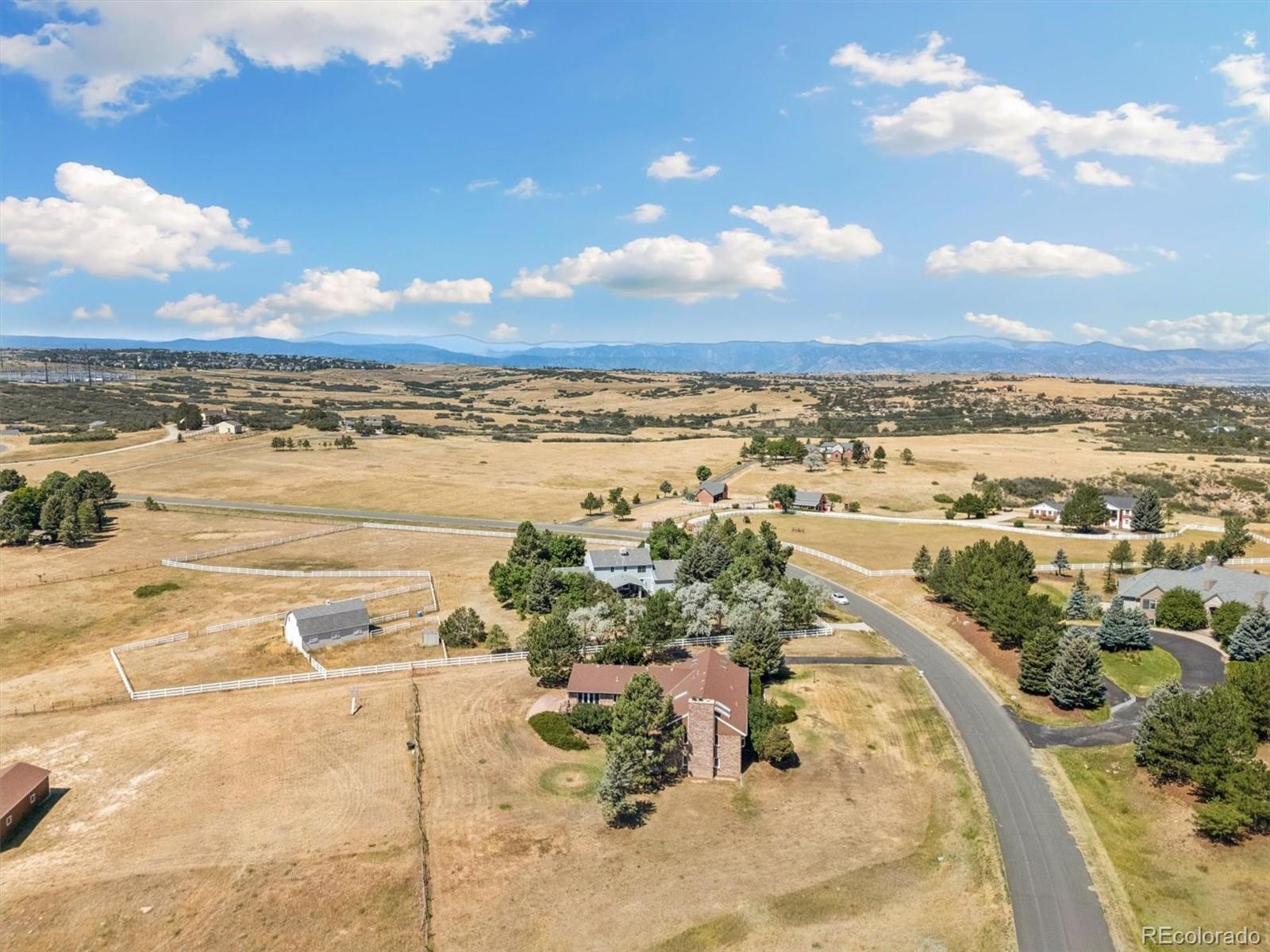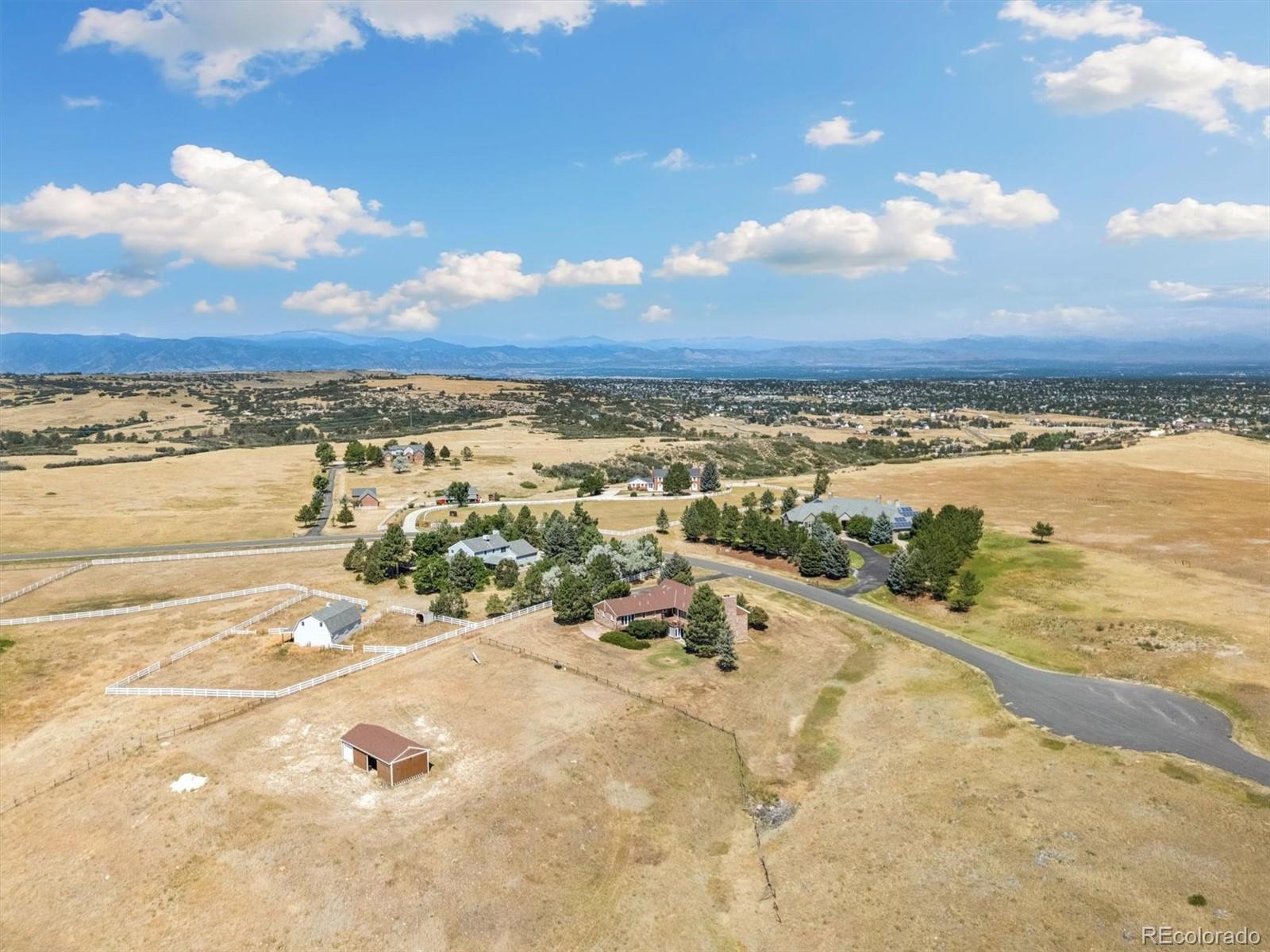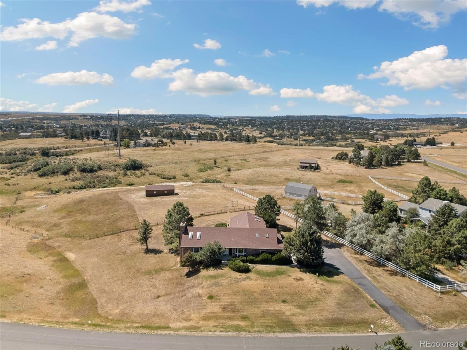 HUGE price improvement!!! Private and RARE 5 acre site! No active HOA! Feel the open space and meadow/mountain views! Expansive outside decking - Custom ranch with a finished walk out basement and 4,798 square feet on a rare to the market 5 acre site in Surrey Ridge Estates - Just 15 minutes back to the DTC! 2 x 6 construction for sturdy living! Not many 5 acre sites this close to town, most are under 2 acres! Traditional 1980's charm with vaulted knotty pine ceilings in the main floor great room! 4 bedroom / 4 bathroom total - Unique over the garage office accessed from the main level! Central A/C with electric heat pump heat!! Granite kitchen - newer laminate - multiple ceiling fans - 2 wood stove style brick fireplaces - Finished walk-out basement with a 2nd large family room, guest bedroom/full bathroom and a traditional spa/hot tub room! Perfect for those who want a ton of square footage that they can update to their own desires + a huge lot for privacy! 40' x 20' - 2 stall horse / tractor barn with electricity - limited covenants and only a voluntary HOA! Original owner home! See it and submit your offer!