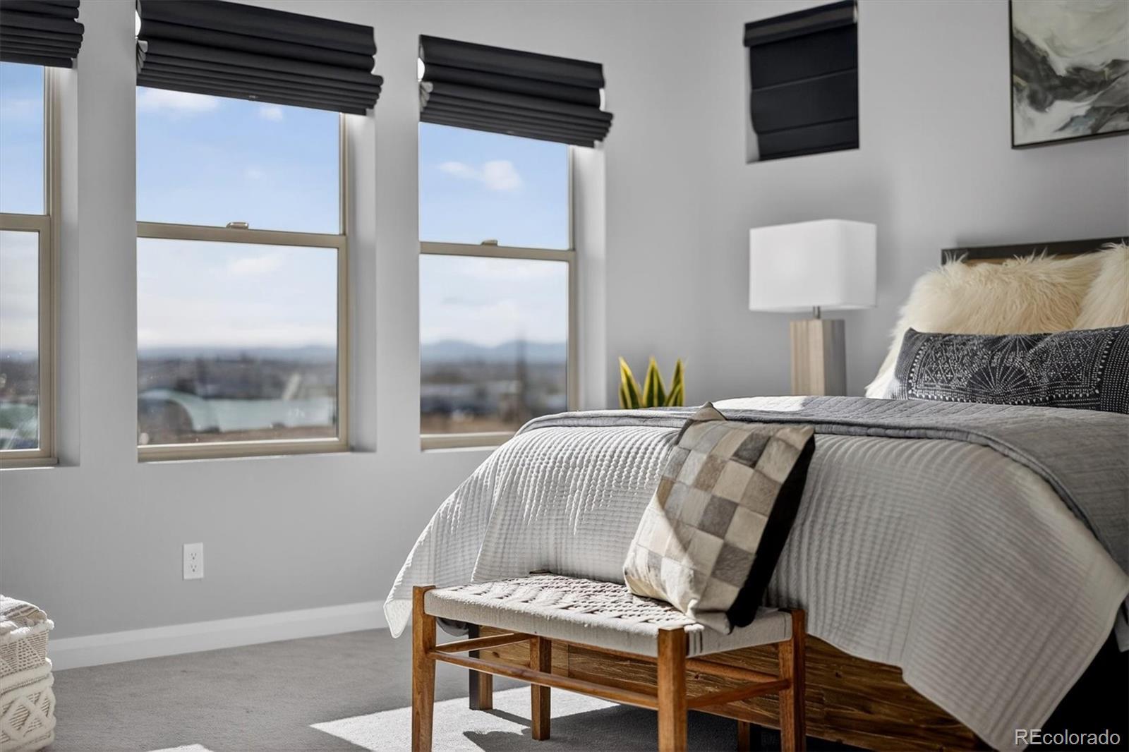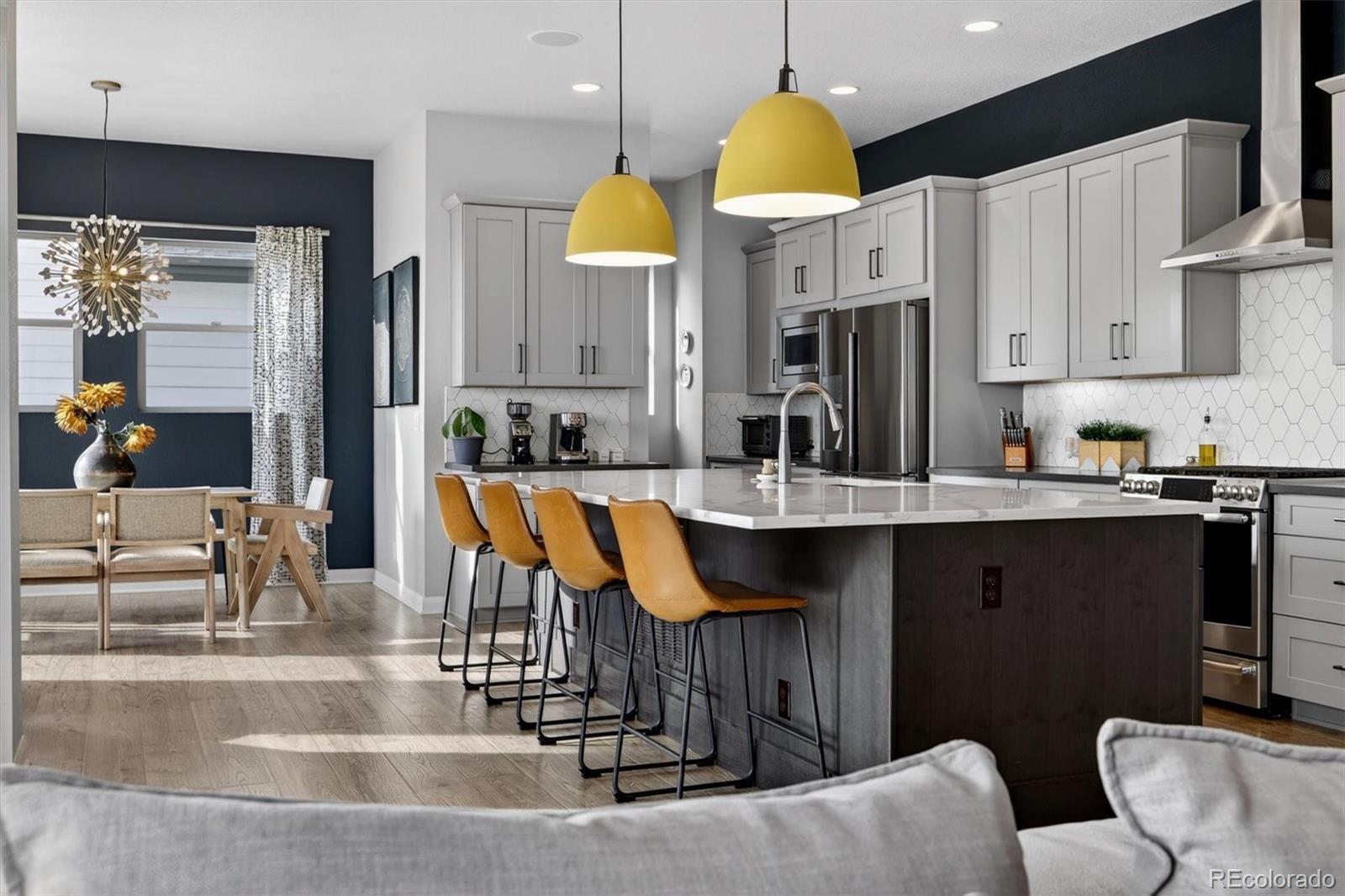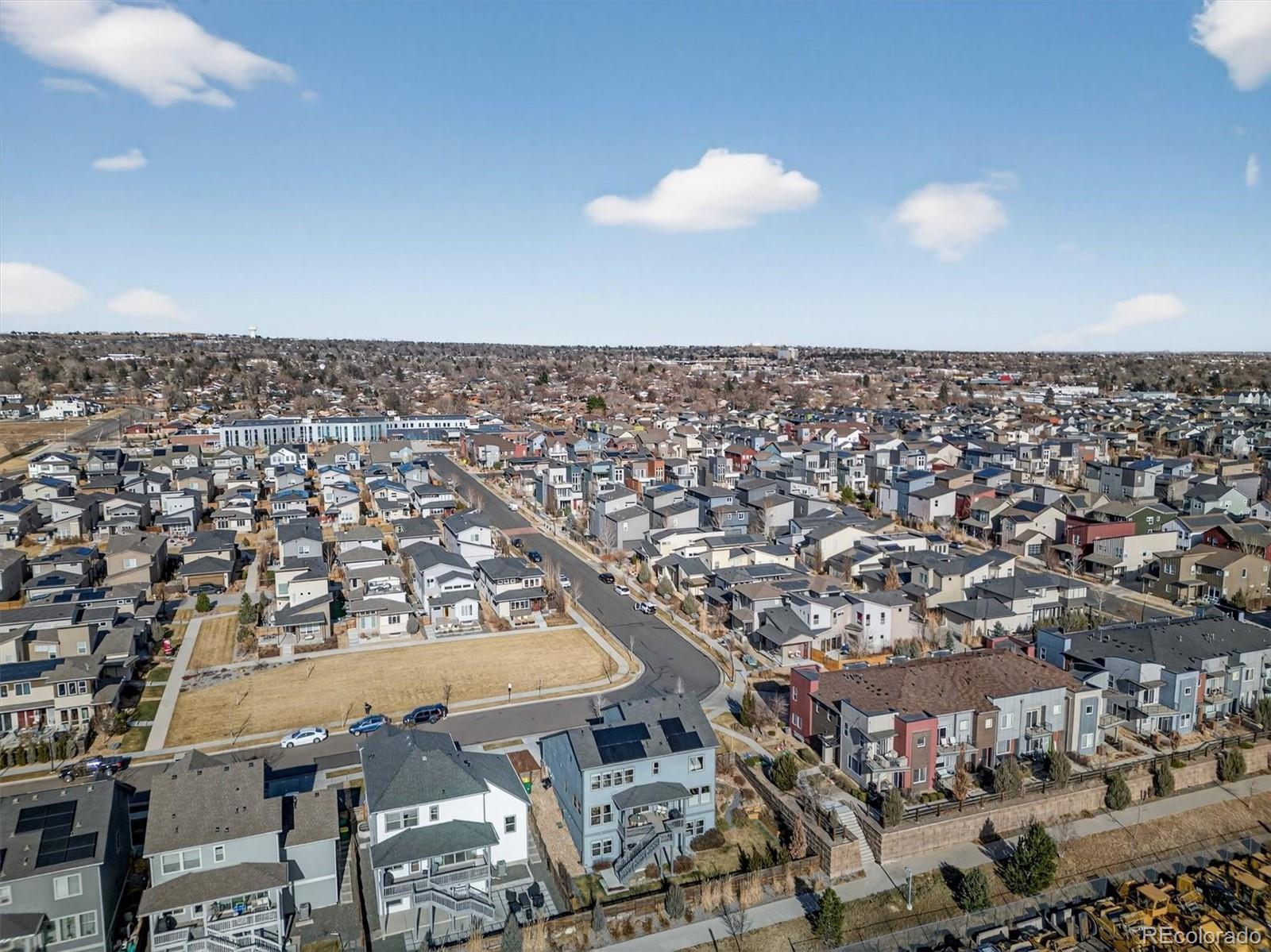 A refined blend of modern design, energy efficiency with an array of owned solar panels, & Colorado lifestyle: this exceptional David Weekley Homes Energy Star–Certified residence offers elevated living on an oversized corner lot just minutes from the heart of Denver. This sought-after Topaz model showcases thoughtful architecture and contemporary finishes throughout. Designed for effortless entertaining, the open-concept main level is anchored by a chef’s kitchen featuring a generous quartz island, stainless steel appliances, gas range, walk-in pantry, custom lighting, & a dedicated wine/coffee bar. Expansive windows and sliding glass doors lead seamlessly to a 15’ x 13’ covered deck, with panoramic views stretching from Downtown Denver to the Front Range, perfect for sunset dinners. Durable luxury plank vinyl flooring flows through the main living areas, while the living and dining spaces remain comfortably connected, creating a natural hub for everyday life. // Upstairs, the primary suite is a serene retreat with a spa-inspired bath & oversized walk-in closet. A sunlit loft thoughtfully separates the primary bedroom from two additional bedrooms, complemented by an upstairs laundry room with built-in storage for everyday ease. The finished walk-out basement continues the home’s light-filled, spacious feel with high ceilings, abundant windows, a large recreation area, & an additional bedroom and bath: ideal for guests, a home gym, or media space. Outside, the expansive backyard backs to a greenbelt and the Clear Creek Bike Trail, while the home fronts to a pocket park, offering ample space to play. // Located in the vibrant Midtown community, residents enjoy access to Trailside K-8 School, a Montessori preschool, community center, garden, microbrewery, multiple dog parks & playgrounds, bike trails, & RTD Light Rail access. A new 20+ acre park is just west of the neighborhood, and Trader Joe’s & Downtown Denver are only minutes away. *LENDER INCENTIVES AVAILABLE