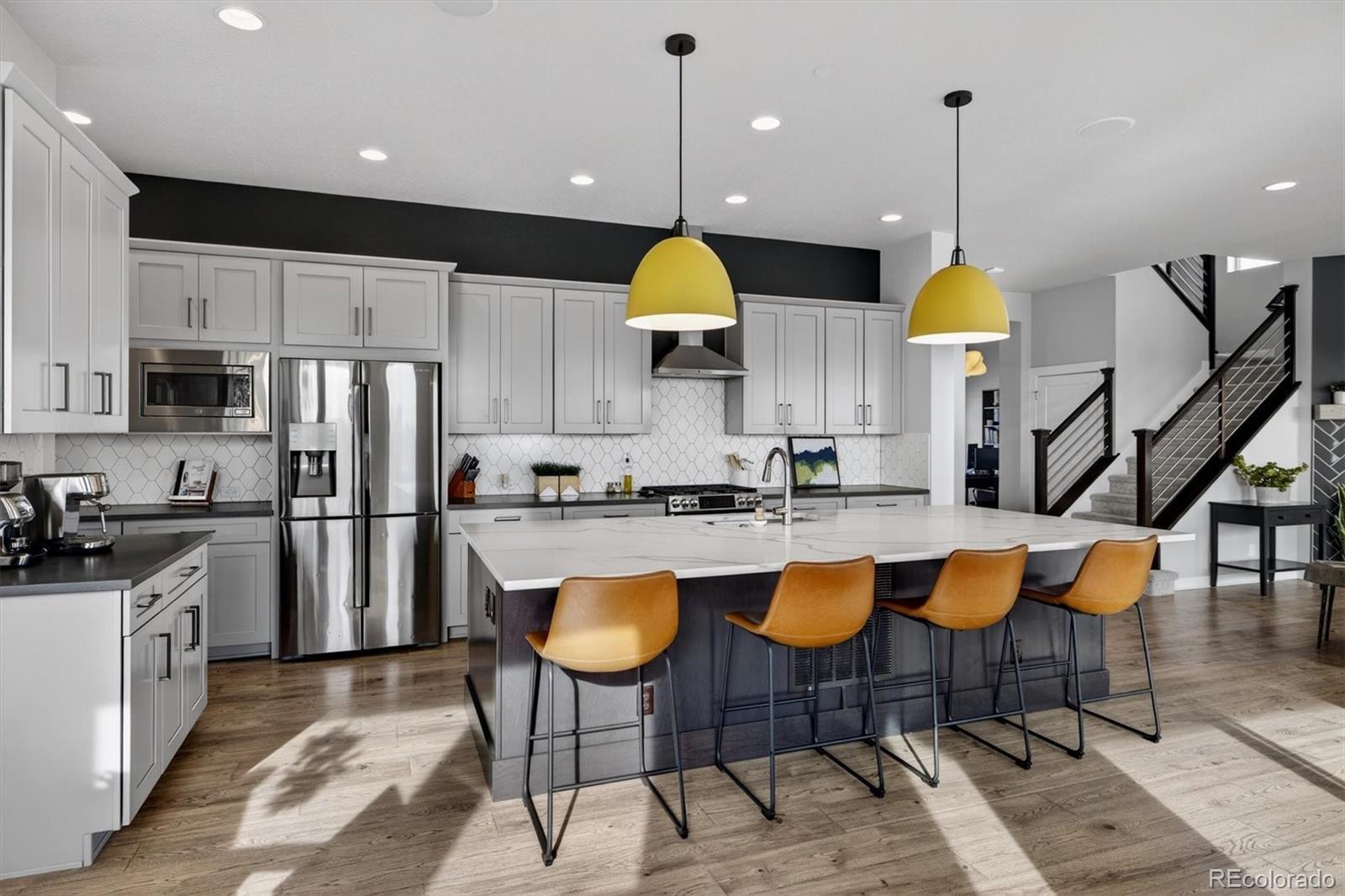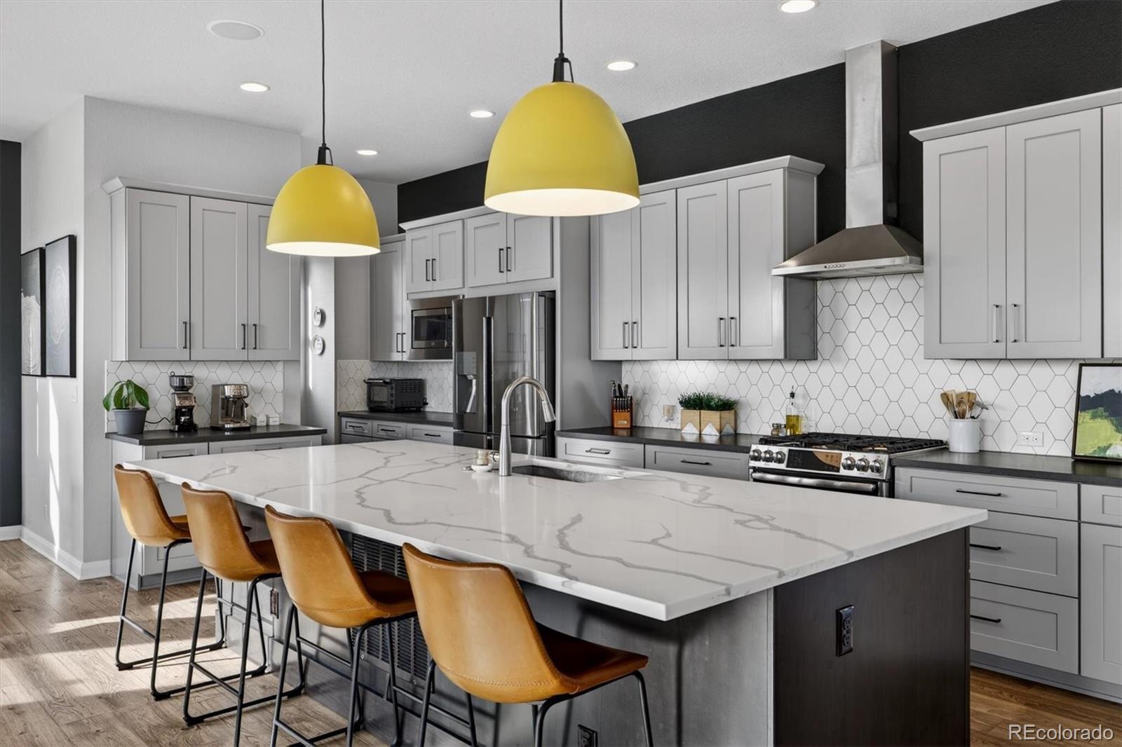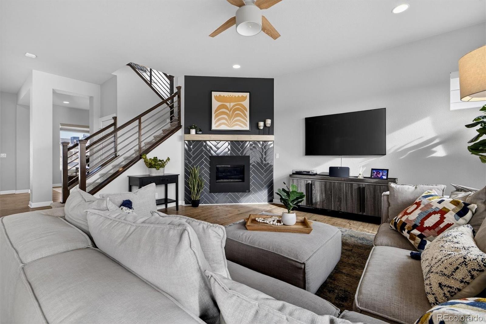 A refined blend of modern design, energy efficiency with an array of owned solar panels, & Colorado lifestyle: this exceptional David Weekley Homes Energy Star–Certified residence offers elevated living on an oversized corner lot just minutes from the heart of Denver. This sought-after Topaz model showcases thoughtful architecture and contemporary finishes throughout. Designed for effortless entertaining, the open-concept main level is anchored by a chef’s kitchen featuring a generous quartz island, stainless steel appliances, gas range, walk-in pantry, custom lighting, & a dedicated wine/coffee bar. Expansive windows and sliding glass doors lead seamlessly to a 15’ x 13’ covered deck, with panoramic views stretching from Downtown Denver to the Front Range, perfect for sunset dinners. Durable luxury plank vinyl flooring flows through the main living areas, while the living and dining spaces remain comfortably connected, creating a natural hub for everyday life. // Upstairs, the primary suite is a serene retreat with a spa-inspired bath & oversized walk-in closet. A sunlit loft thoughtfully separates the primary bedroom from two additional bedrooms, complemented by an upstairs laundry room with built-in storage for everyday ease. The finished walk-out basement continues the home’s light-filled, spacious feel with high ceilings, abundant windows, a large recreation area, & an additional bedroom and bath: ideal for guests, a home gym, or media space. Outside, the expansive backyard backs to a greenbelt and the Clear Creek Bike Trail, while the home fronts to a pocket park, offering ample space to play. // Located in the vibrant Midtown community, residents enjoy access to Trailside K-8 School, a Montessori preschool, community center, garden, microbrewery, multiple dog parks & playgrounds, bike trails, & RTD Light Rail access. A new 20+ acre park is just west of the neighborhood, and Trader Joe’s & Downtown Denver are only minutes away. *LENDER INCENTIVES AVAILABLE