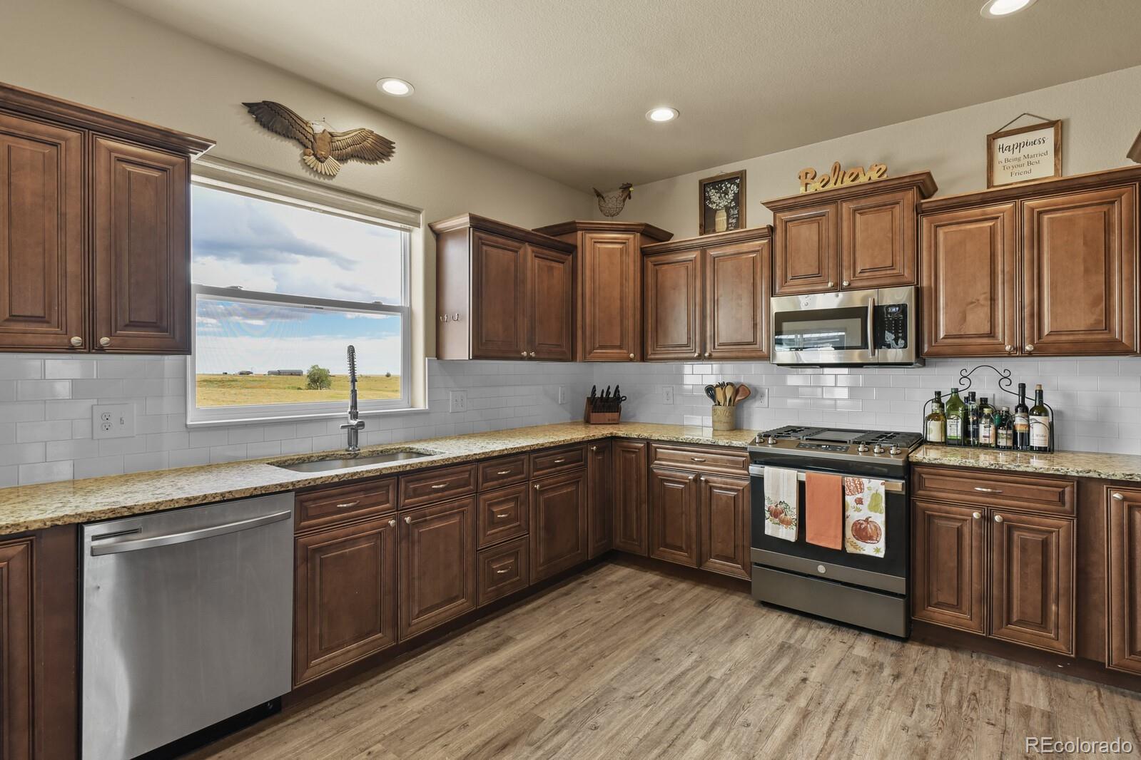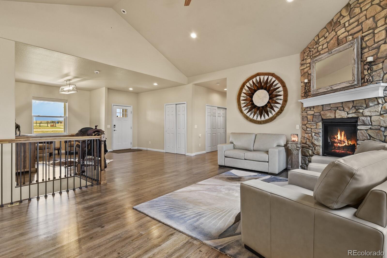 Welcome to 3575 Hare Haven Lane — a home where family life and Colorado living come together. Tucked into a quiet, welcoming neighborhood with sweeping views of Pikes Peak, this property offers the space, comfort, and connection families are looking for. This 4-bedroom, 4-bathroom home offers bright, open living areas with soaring vaulted ceilings, a stacked stone fireplace and beautiful laminate wood flooring. You can appreciate the well-designed kitchen that serves as the true heart of the home with ample granite counter tops and modern stainless appliances. You'll find the spacious primary suite with a walk-in closet and en-suite bath has a private walk-out access to the expansive composite deck built for entertaining, with built-in gas grill, having stairs to access the back yard seating area and fire pit. The fully finished walk-out basement provides extra living space, a family room, custom built workshop, storage, or the perfect spot for a game room or home theater. Additional features include newly installed solar panels, new air conditioning unit with HEPA filtration system, instant hot water heater, radon mitigation system, a security system and a full service RV site. ATV's and Off Road Vehicles are permitted on the property and all surrounding roads. Located in Falcon District 49 with top-rated schools nearby, located only 10 minutes from the airport, plus quick access to parks, hiking trails, and the shops and dining along Powers Boulevard.