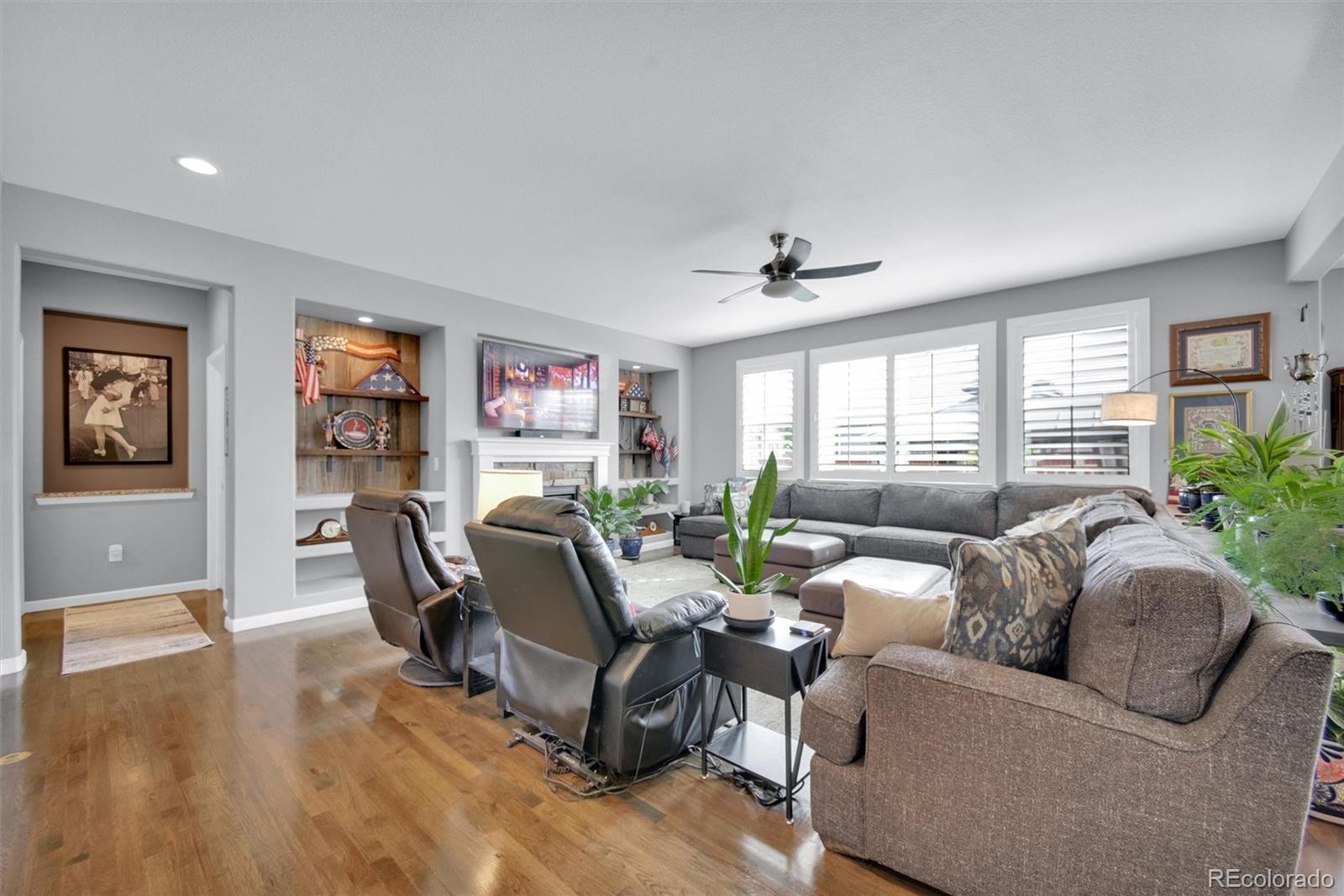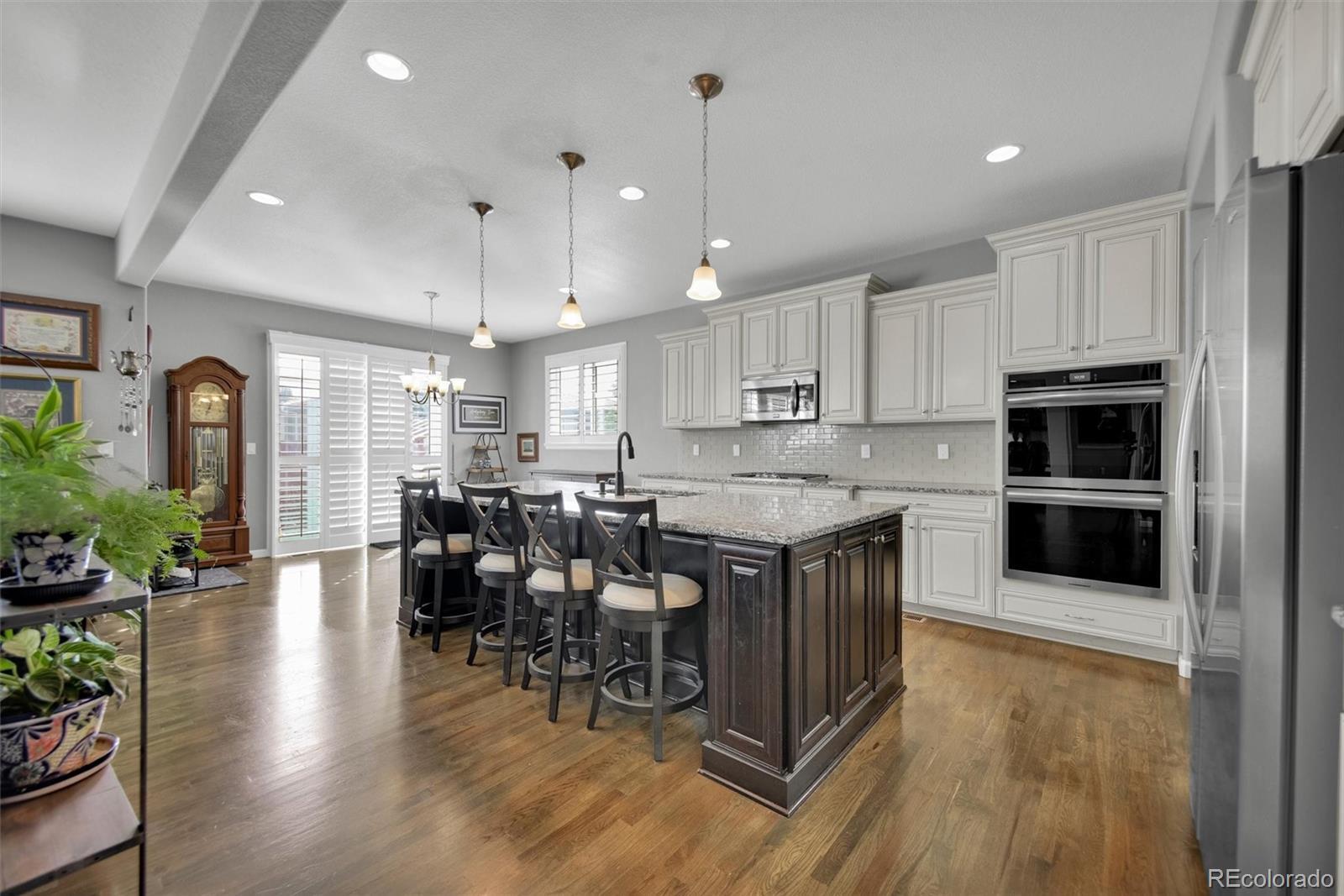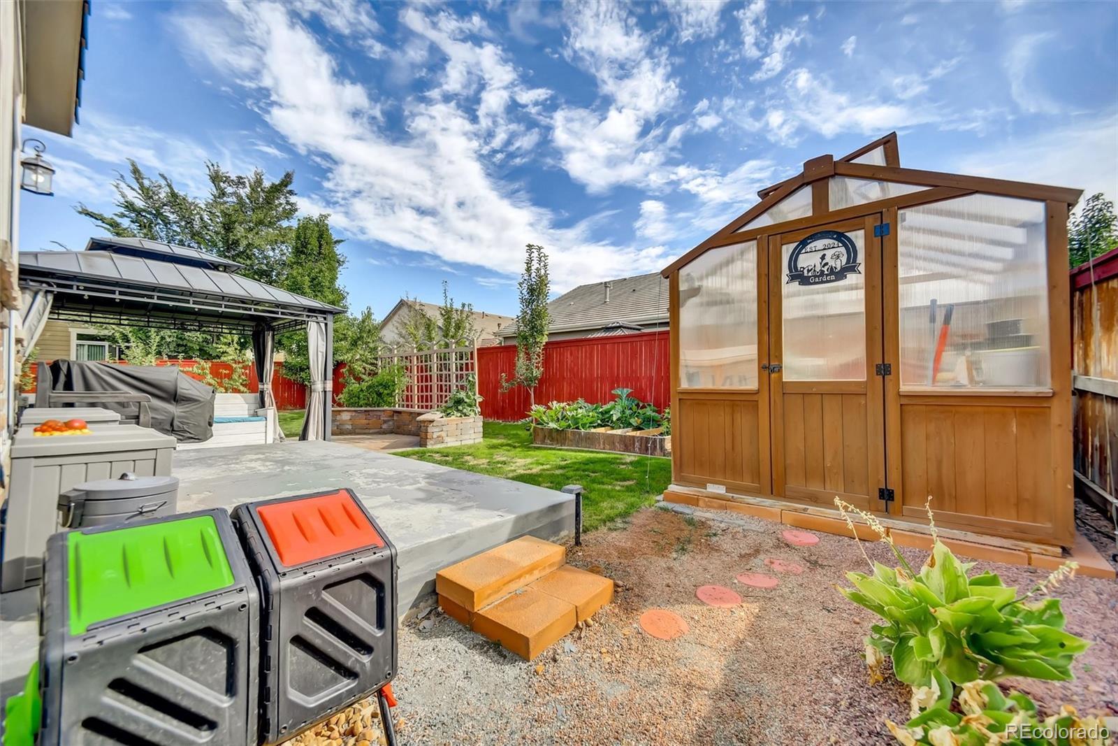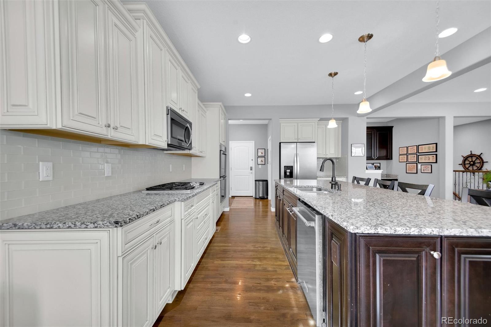 Welcome Home! You won't want to miss this wonderful 5 bedroom home in The Villages at Buffalo Run! Low maintenance living. Enjoy a large kitchen island, open to the living room with a warm fireplace, spacious built-ins and hardwood floors. Designated "Tech Space" off the kitchen, could easily be transformed into a bar area. There are plantation shutters throughout the main level. The primary bedroom with a 5 piece bath and large walk-in closet is on the main level, as well as two additional bedrooms, a full bathroom with double sinks, laundry room. Third bedroom on the main level could also be used as an office, Glass double doors can be reinstalled. The finished basement has a great “Mother-in-law”/extended family area with a living space and kitchenette with a full size refrigerator and microwave. Additionally there are two bedrooms and a full bathroom. The backyard has a gardening shed and planter boxes for someone with a green thumb. The roof is concrete tile. New Double Ovens and Tankless Water Heater. Walking distance to the park. Near the golf course, Bison Ridge Recreation Center, and DIA. Seller is motivated.