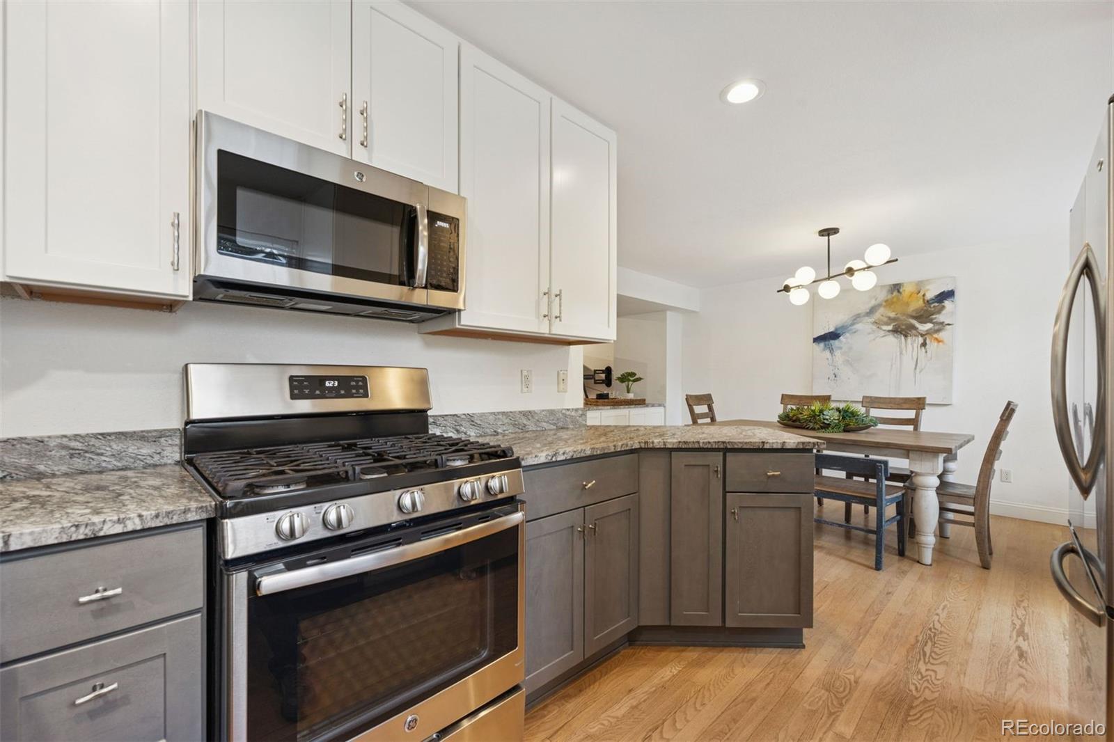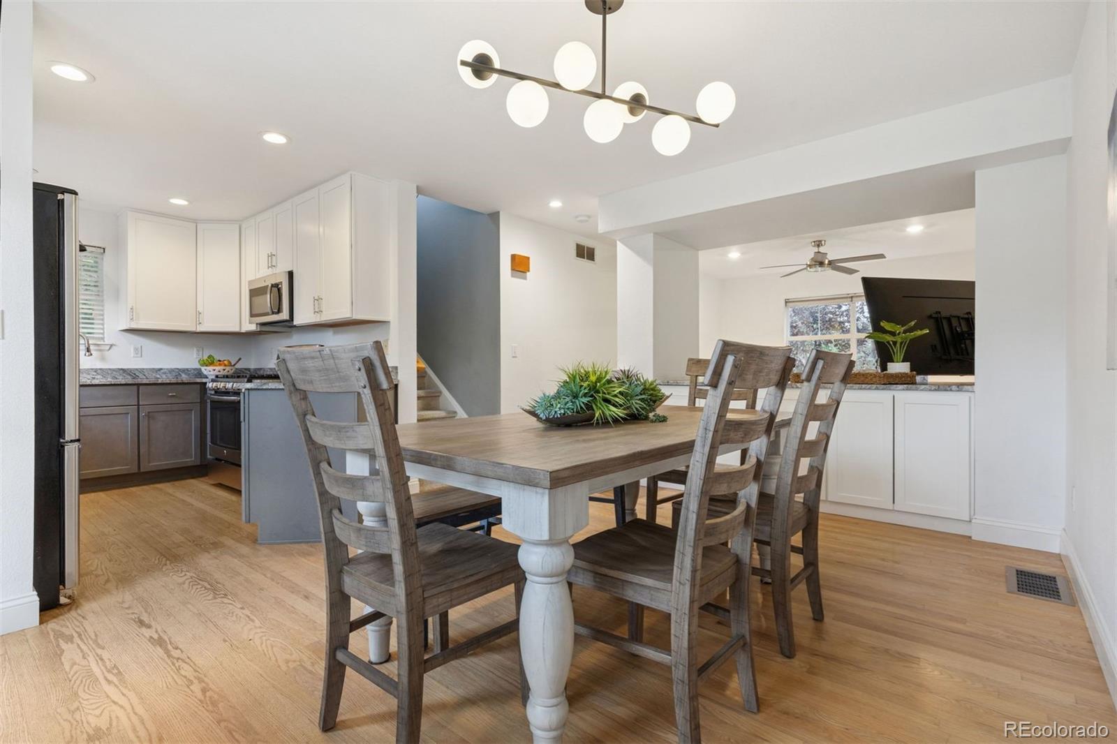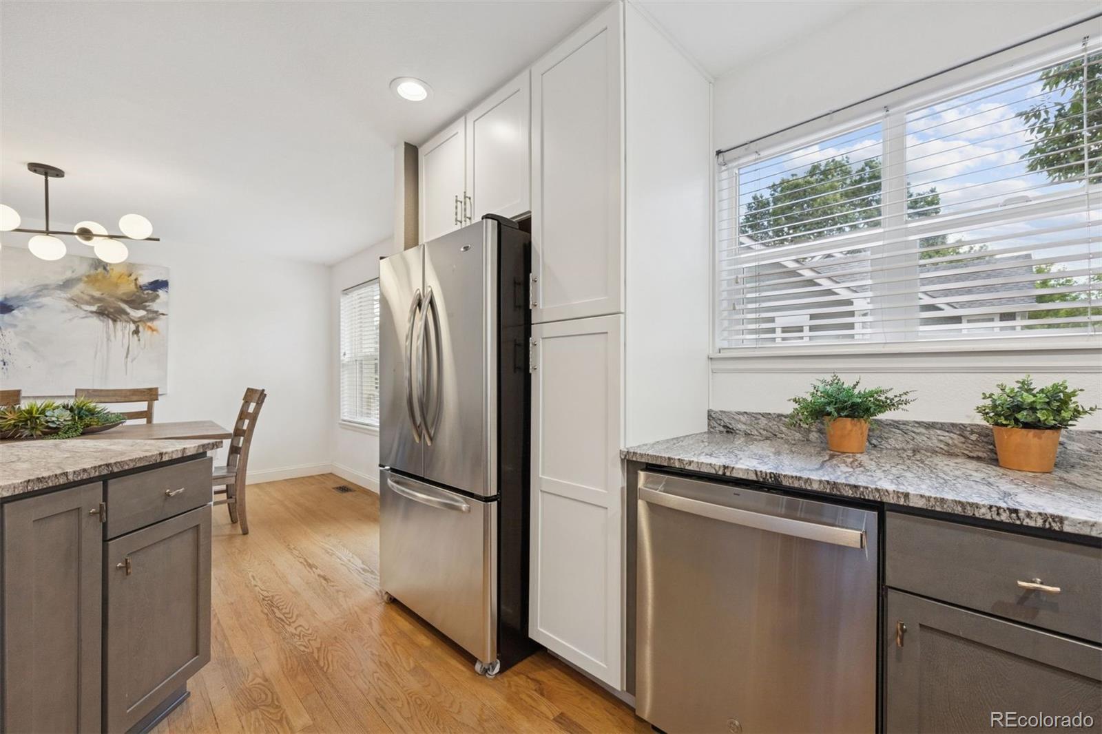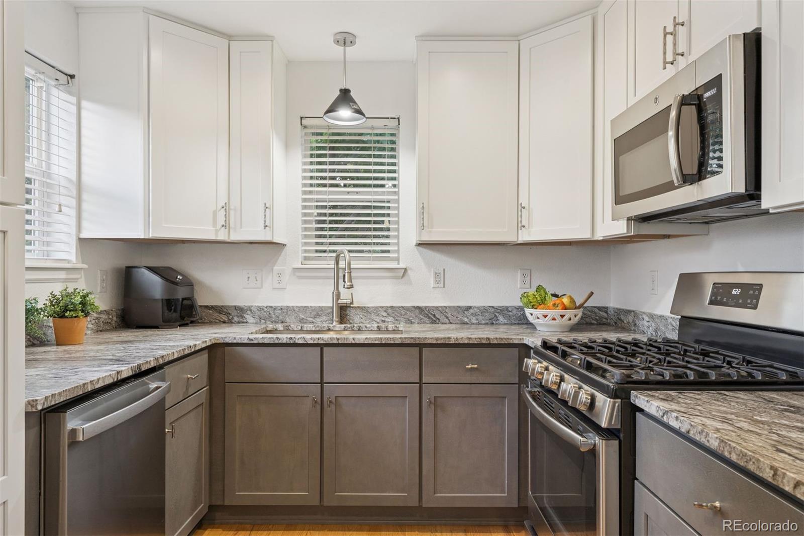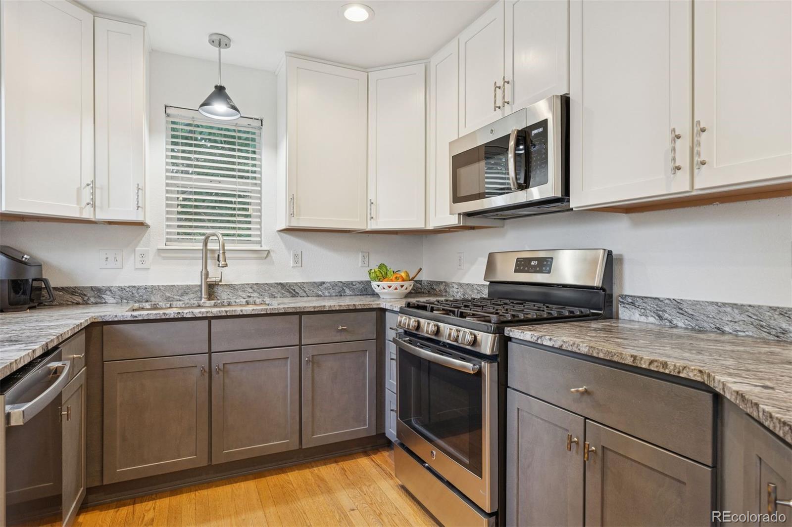 Welcome to 3650 Utica #1, a thoughtfully updated end-unit townhome in one of Denver’s most sought-after locations. With three bedrooms, three bathrooms, and inviting outdoor living, this home offers comfort, style, and connection to the vibrant Tennyson corridor. The remodeled kitchen is a true highlight, featuring brand-new upper and lower cabinetry, leathered granite countertops, and a stainless steel single-basin sink perfectly positioned beneath a window that frames the pergola and park across the street. Seamless indoor-outdoor flow extends to a spacious deck off the dining area, ideal for entertaining or quiet evenings at home. Hardwood floors grace the main level, while the upper level showcases a serene primary suite. A vaulted ceiling with a wood beam detail and a new designer fan add architectural character, complemented by the updated en-suite bath with dual sinks, striking hexagon floor tile, and a walk-in shower lined with coordinating smaller-format hex tiles. The secondary bathroom has been stylishly refreshed with a new tub/shower combo, tile, sink, and toilet. A third bath on the main level enhances convenience for guests. Practicality meets design with clever storage solutions, including pullout drawers throughout cabinetry. Beyond the front door, enjoy the lush communal lawn—perfect for pets or gatherings. Situated just blocks from 38th and Tennyson, this home places you within minutes of beloved neighborhood destinations such as American Elm, Hey Kiddo, Tatarian, Ohana Yoga + Barre, and Alchemy. A rare combination of thoughtful upgrades, functional design, and an A+ location, 3650 Utica offers the best of Northwest Denver living.