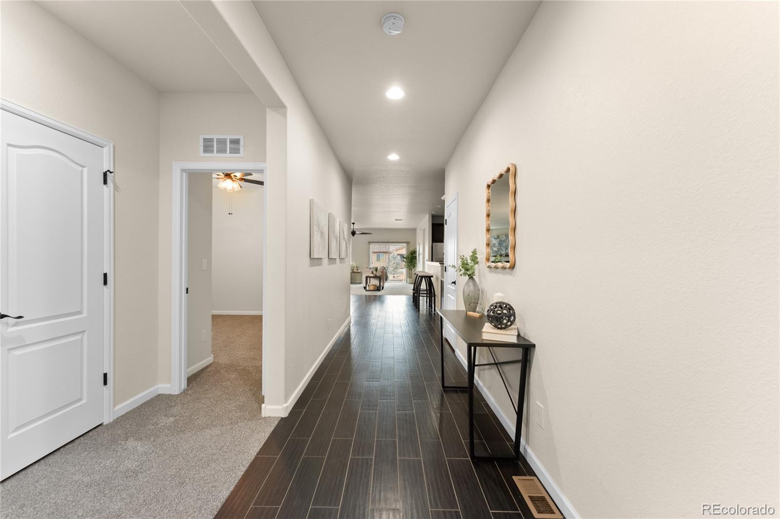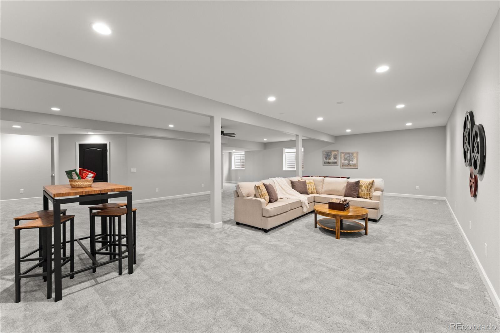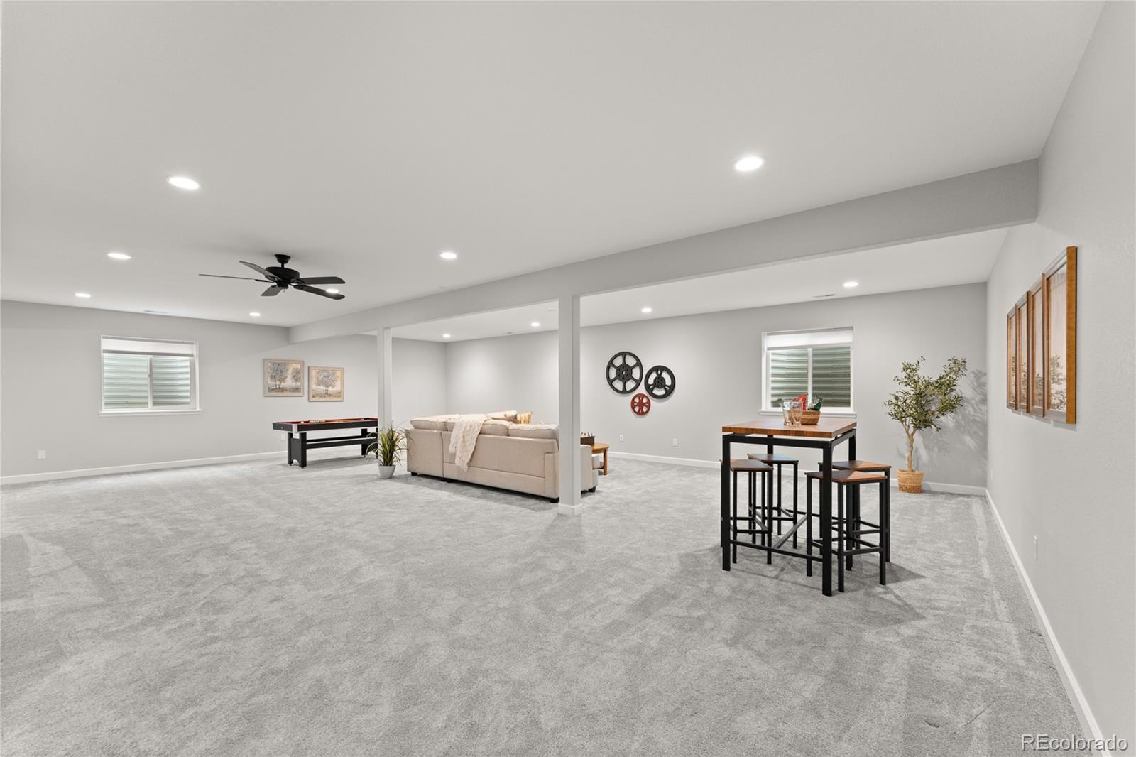 Tucked into the quiet golf course community of Spring Valley Ranch in Elizabeth, 5509 Harbor Town Dr is one of the very few ranch style homes with a fully finished basement and a three-car garage! When you enter, you'll be greeted by warm, wood-look ceramic tile floors, and brand new carpet, both spreading across the main level in exactly the places you'd want them, and providing a beautiful contrast of color that gives this home a welcoming atmosphere. The kitchen has rich espresso colored cabinets, a sleek grey glass tile backsplash, and a brighter granite that beautifully ties in the colors of the home, and provides a pop of contrast to make the kitchen visually exciting! The stainless steel appliances, gas cooktop, coffee bar, and bar seating will make this kitchen the central hub where everybody WANTS to hang out! The primary suite has an en-suite bathroom with granite counters, a standup shower with oiled bronze surrounds, a soaking tub, and a generously sized walk-in closet. And off the 3-car garage is the laundry room, meaning this home can truly be used for main-level-living. Head downstairs, and you'll find an absolutely CAVERNOUS finished basement! The family room is legitimately massive, and your imagination is your only limit down here. Game room, movie theater, golf simulator...there is SO MUCH ROOM FOR ACTIVITIES! There's also another bedroom and modern bathroom, making this space perfect for older kids, or even a multi-generational living situation. The Spring Valley Golf Club is an absolute hidden gem! With 18 challenging holes of golf, and an incredible clubhouse with a great restaurant and a friendly atmosphere, this is the ideal neighborhood for somebody who wants to live in a golf course community, and be away from the hustle and bustle of a bigger city, but without being in the middle of nowhere. Come take a look today!